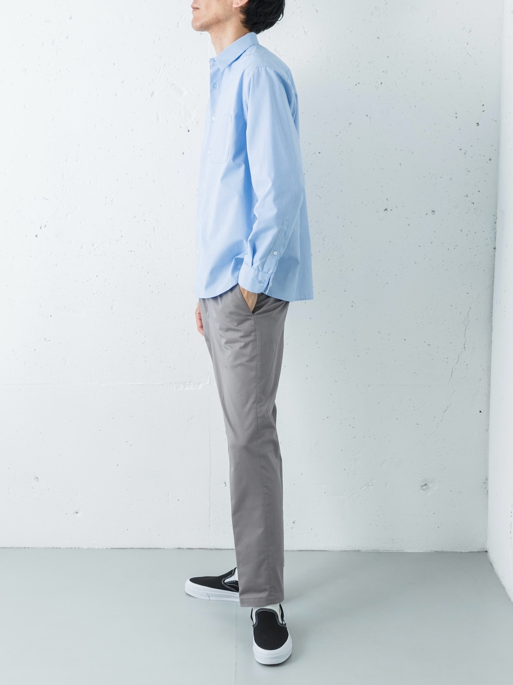 ボトムスには、このサックスブルーと相性抜群のグレーのストレッチチノスラックスをセレクト。ブルー×グレーの寒色系グラデーションは、知性的で爽やかな印象を与える鉄板の組み合わせです。