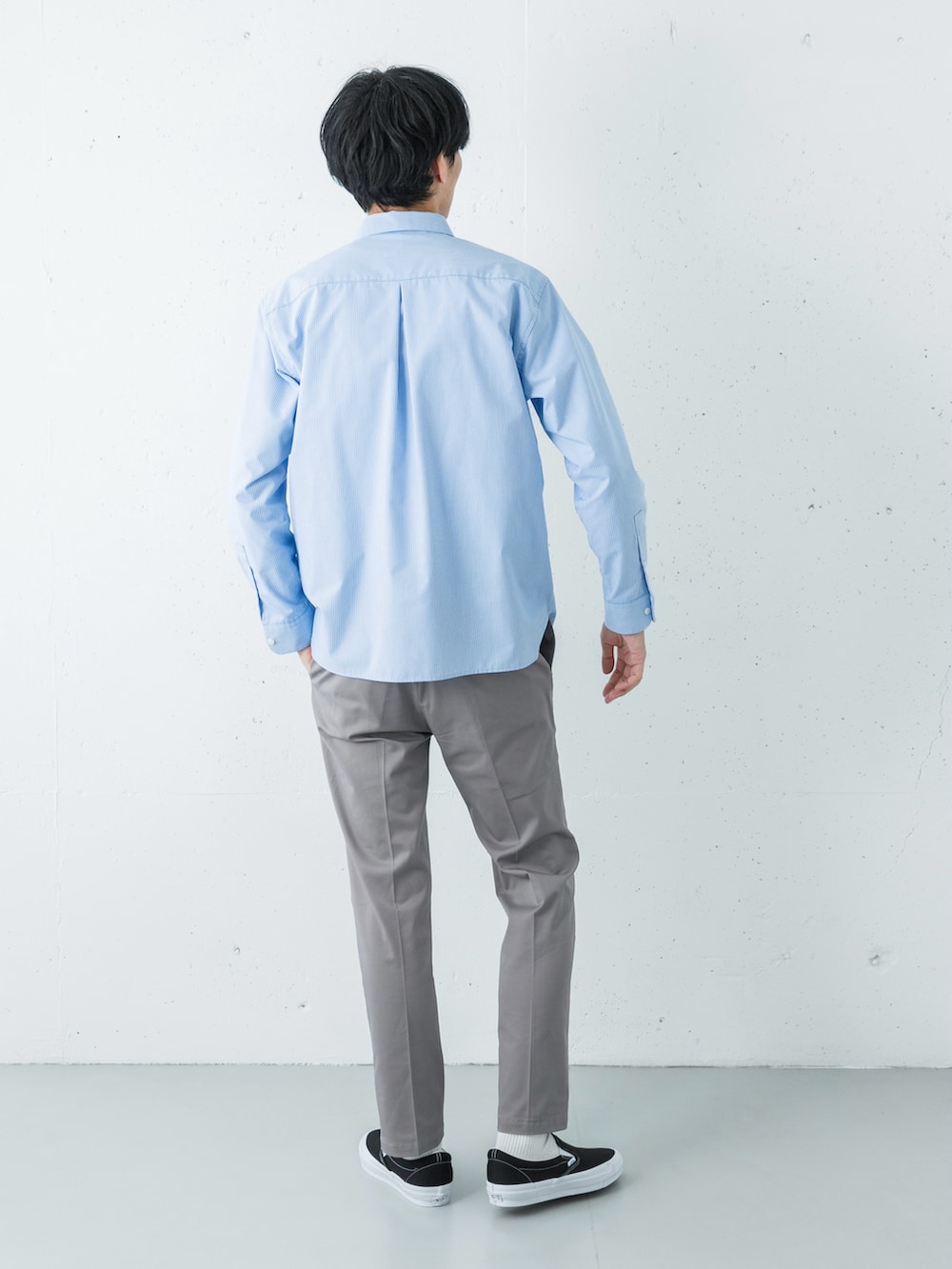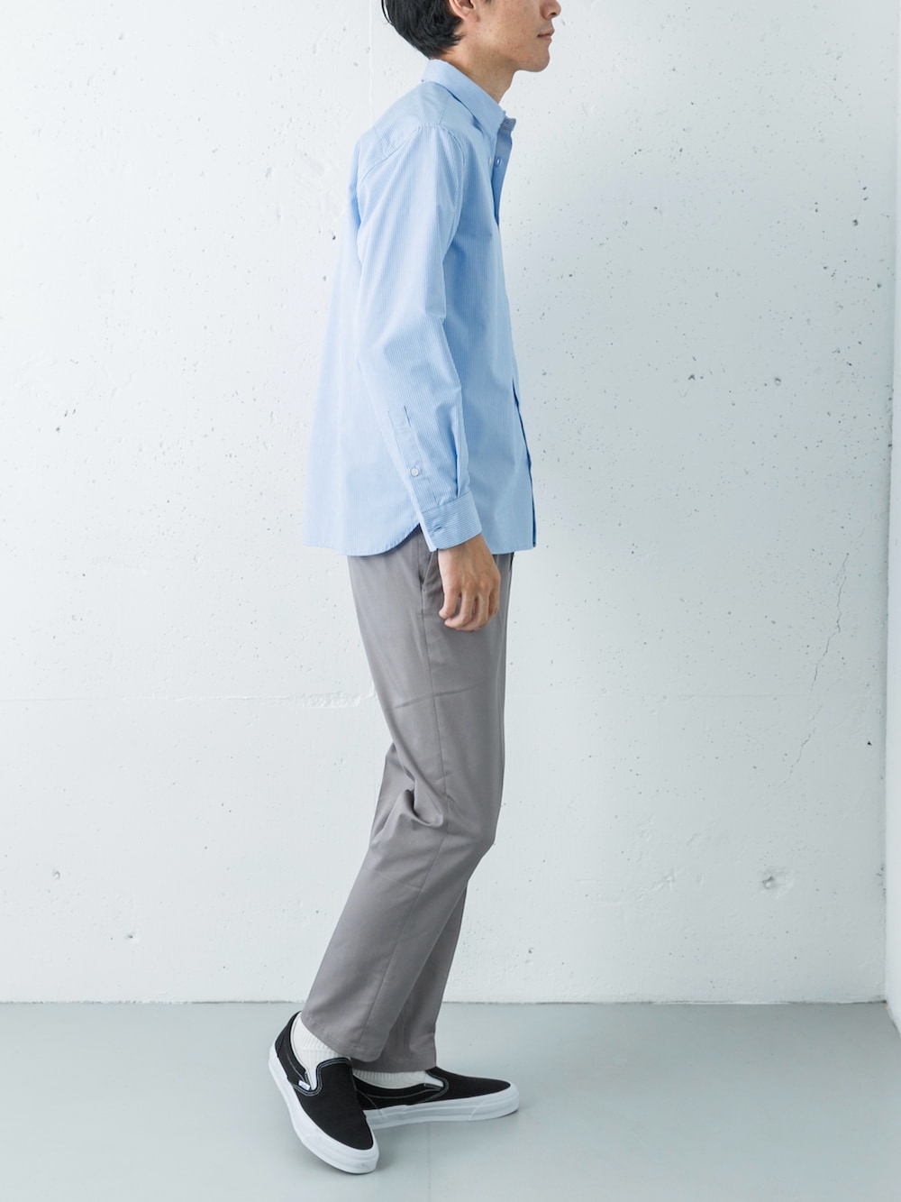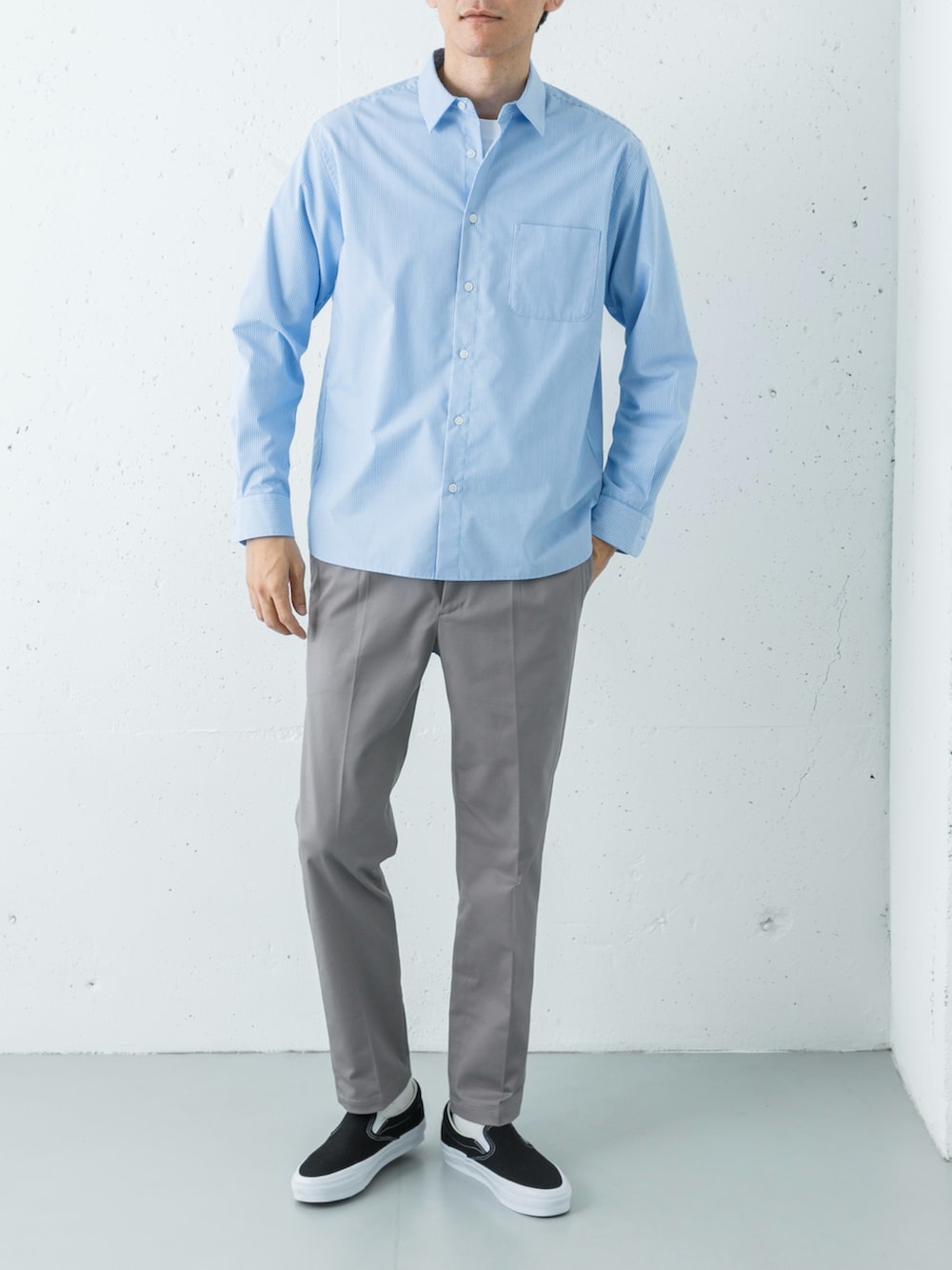 トップスは、清潔感の代名詞であるサックスブルーのブロードシャツ。防シワ・防臭という高い機能性を持ちながら、リラックスシルエットであるため、「きっちりしているのに堅苦しくない」絶妙な空気を醸し出しています。