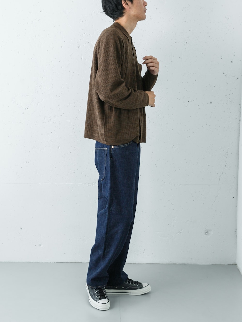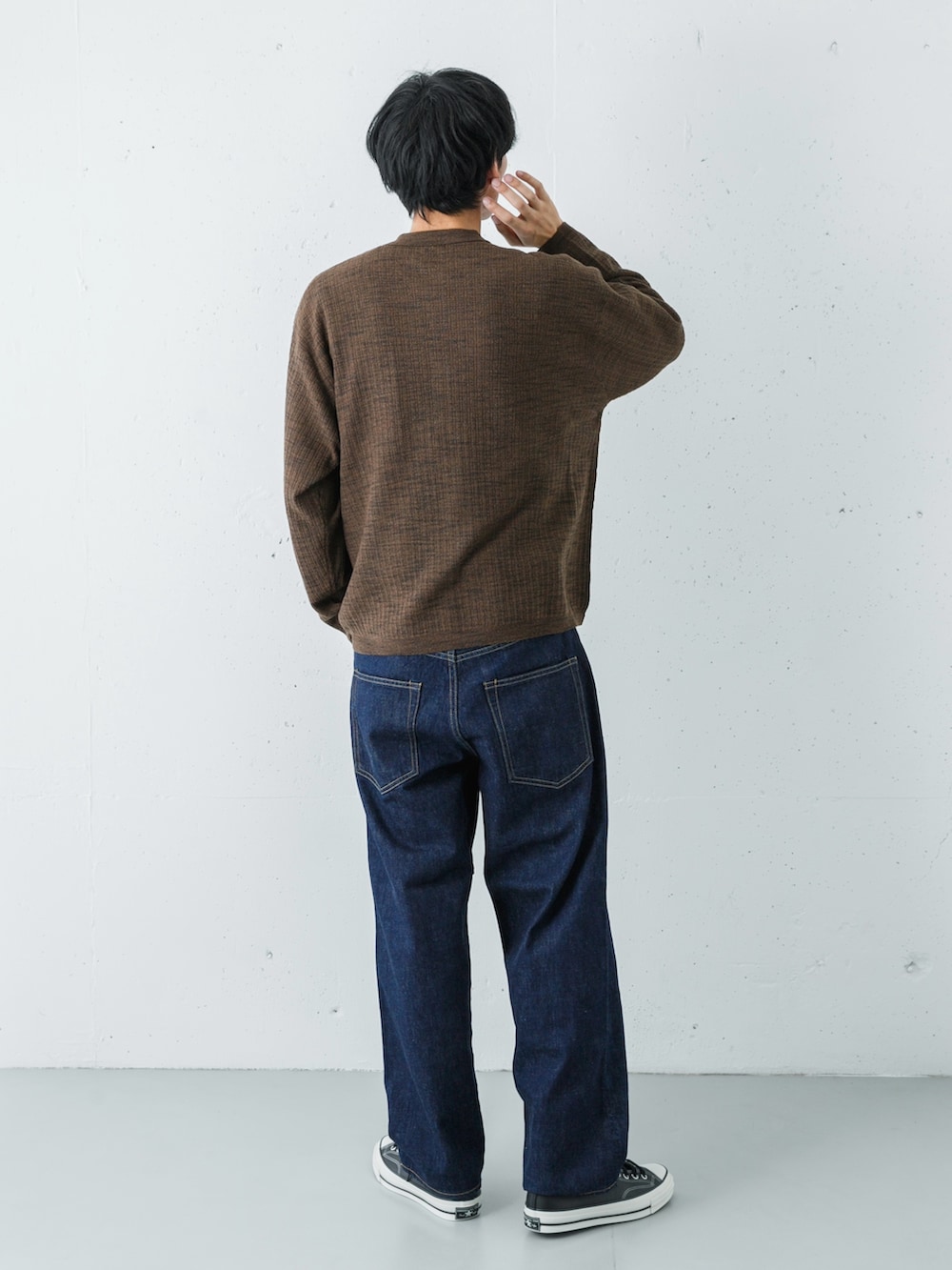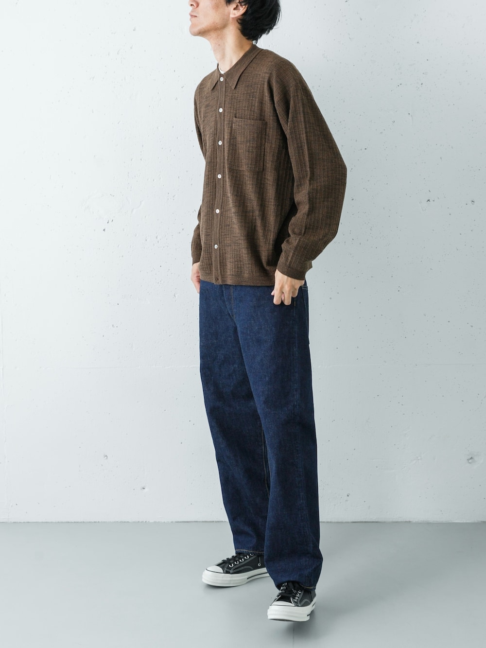 ボトムスには、Scyeのバギーデニムをセレクト。深いインディゴブルーとトップスのブラウンは、互いの色を引き立て合う、非常に相性の良い組み合わせです。暖色系のブラウンが持つ「温もり」を、寒色系のインディゴが「知的に」引き締めることで、派手さはないものの、味わい深いコントラストを生んでいます。