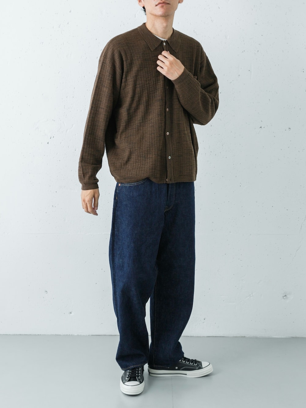 トップスは、職人技術が光るニットブランドcrepusculeのクレープニットシャツ。カラーは温かみのあるBROWNです。特有の凹凸(シボ感)があるドライな編み地は、肌離れが良く、無地のシャツにはない豊かな表情を持っています。このリラックスしたブラウンのニットが、大人の余裕と柔らかな雰囲気を醸し出しています。