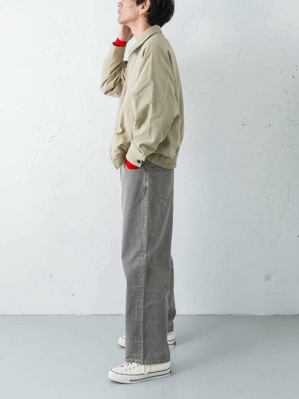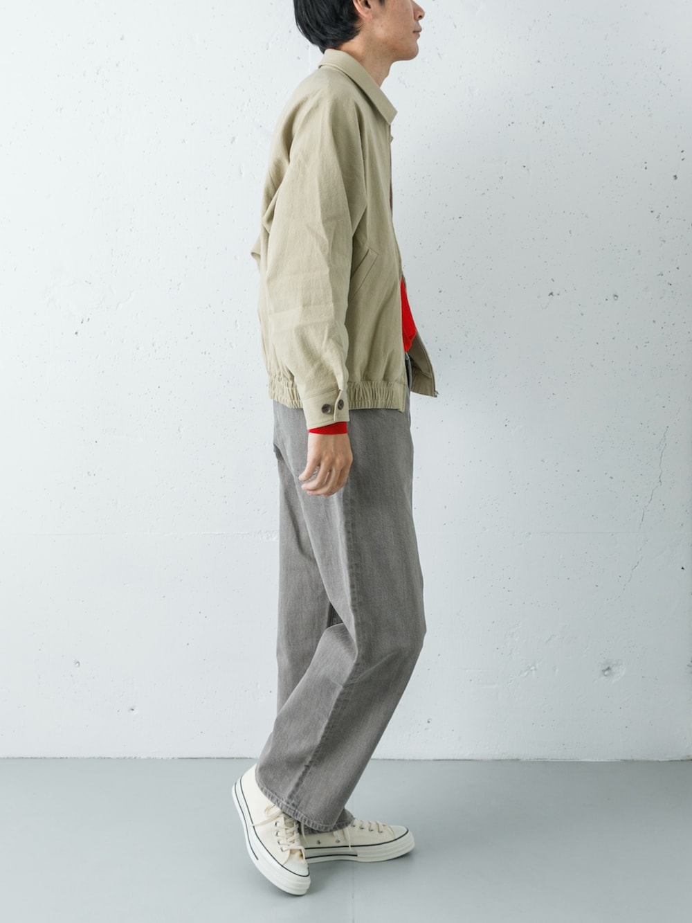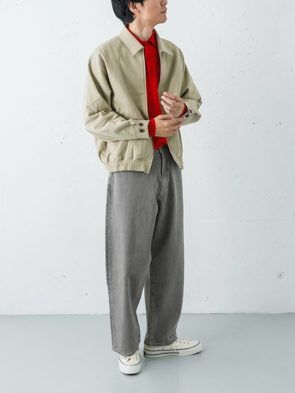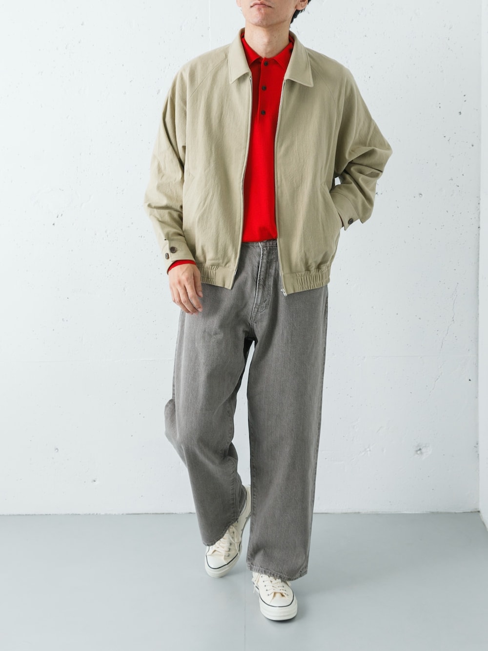 淡い中間色のレイヤードに、YLEVEのヴィヴィッドな赤を差し色としてインサート。タックインでウエストラインを強調し、ショート丈ブルゾンとの構築的なシルエットバランスを形成。レトロなムードを現代的なモード感へと昇華させています。