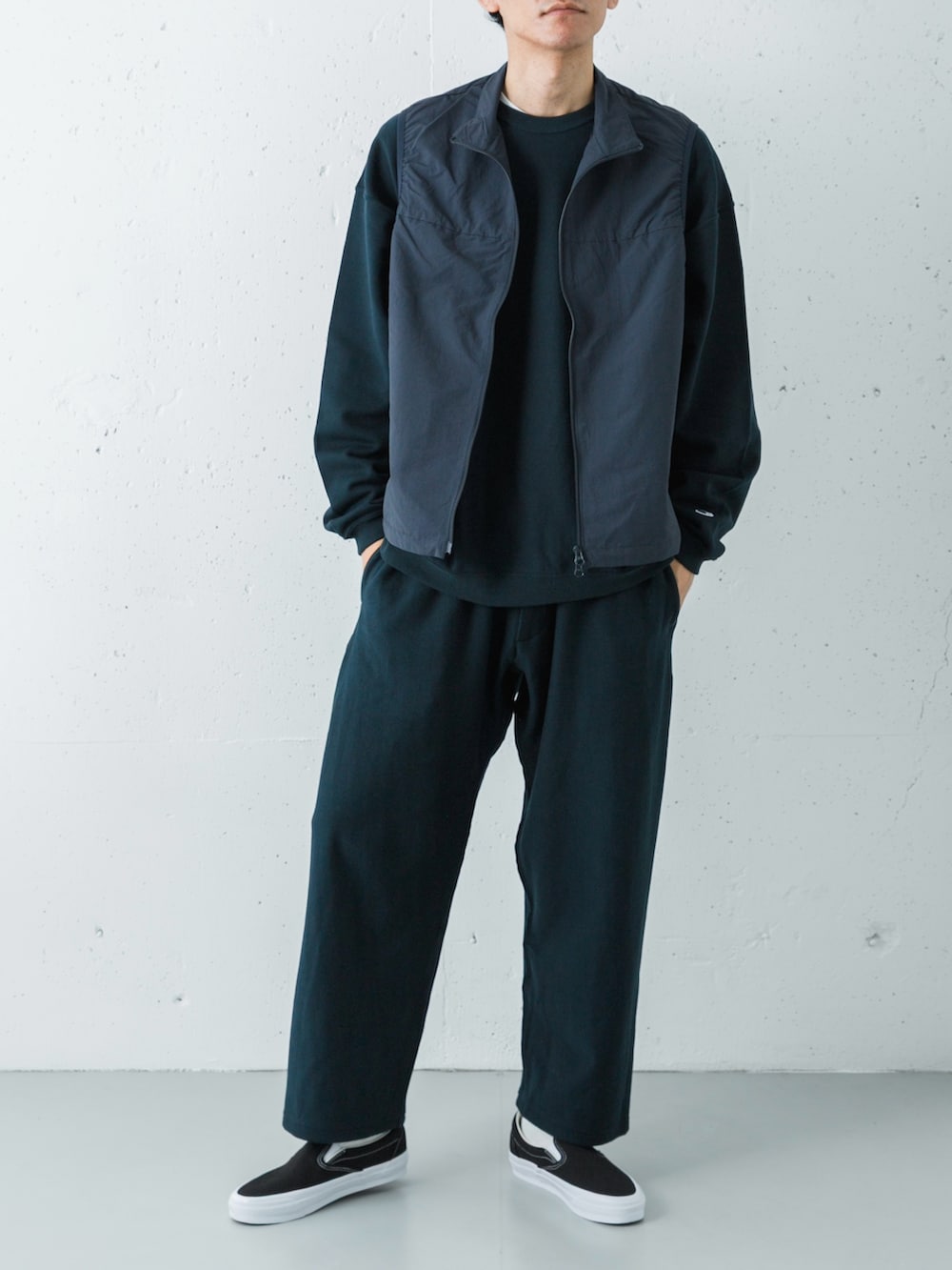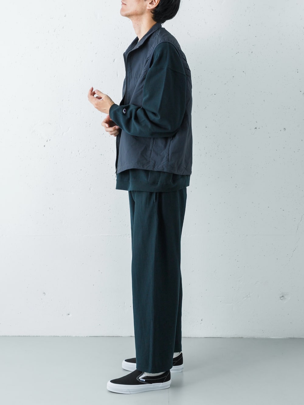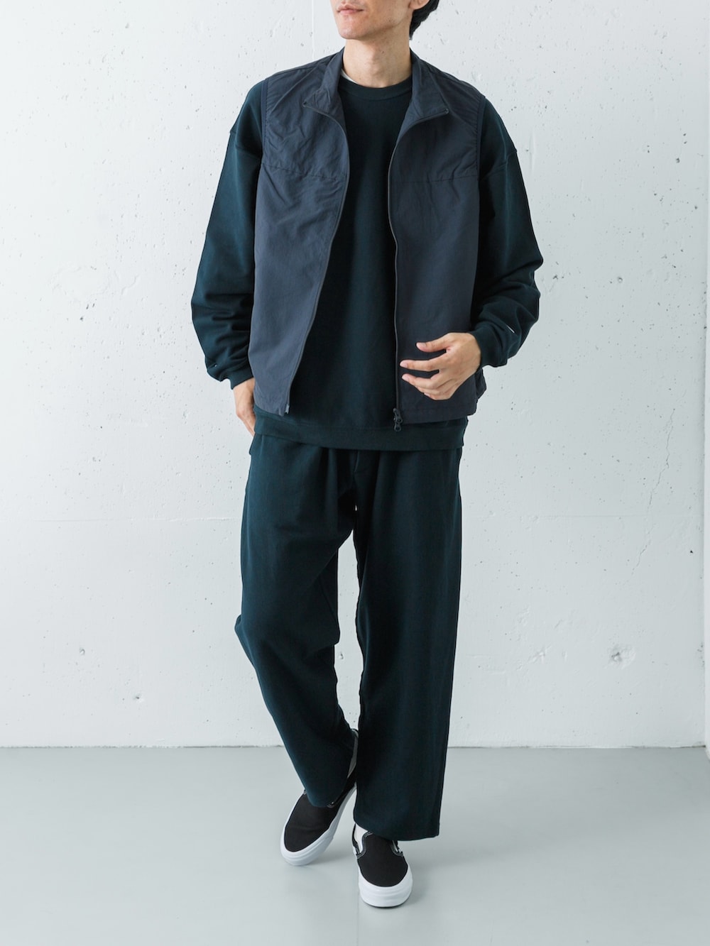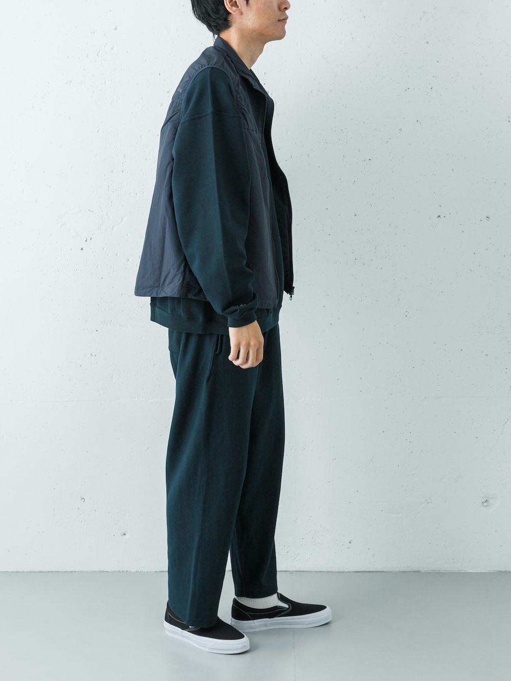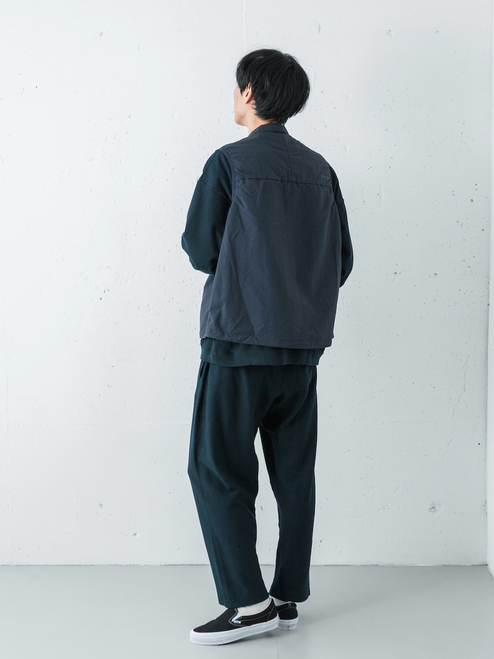 足元はVANS LX SLIP-ON。重厚なネイビーの塊を、モノトーンの配色とシャープなフォルムが軽快に引き締め、ストリートなエッセンスを加えています。