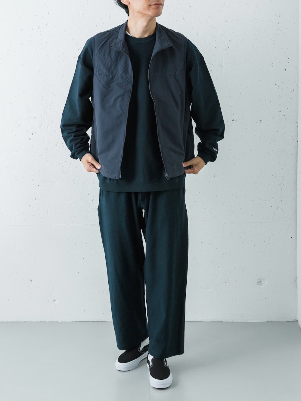 スウェットの柔らかなコットン素材に対し、ベストのハリのあるナイロン素材が加わることで、同じネイビーの重なりの中に立体的な奥行きが生まれます。この「異素材のレイヤード」が、スウェットセットアップ特有のルーズさを払拭し、都会的なギア感やテックな要素をプラスしています。