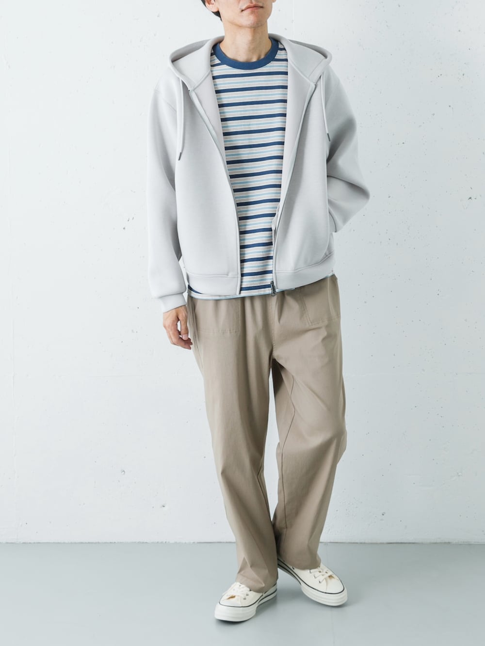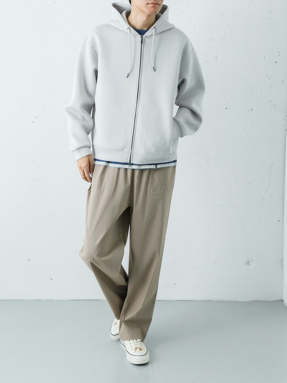 このクリーンなトップスに対し、ボトムスにはグレージュのベイカーパンツを合わせました。グレーとベージュが混ざり合った曖昧な色合いが、トップスの淡いグレーと溶け合い、洗練されたニュアンスカラーのグラデーションを描き出しています。