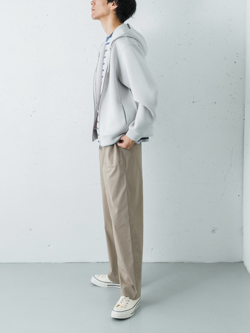 「ハイスペック」な機能素材同士の組み合わせにより、見た目はリラックスしていながらも、どこかテックな緊張感をキープ。足元はボリューミーな白のコンバースで潔くまとめ、全体を透明感のあるペールトーンで統一した、都会的なスポーツ・カジュアルです。