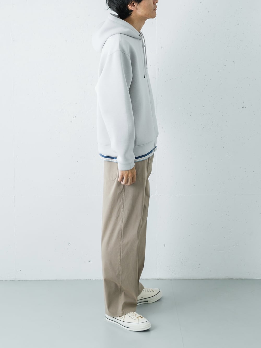 ダンボールニット特有のハリと弾力を活かした、立体的なフォルムが魅力のジップアップフーディー。カラーは澄んだアイスグレーをセレクトしました。フードの立ち上がりが美しく、スポーティーなアイテムながらも建築的でモダンな佇まいを見せます。