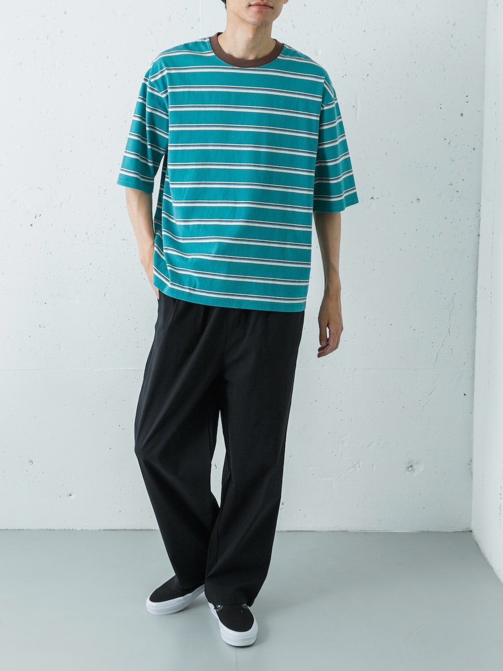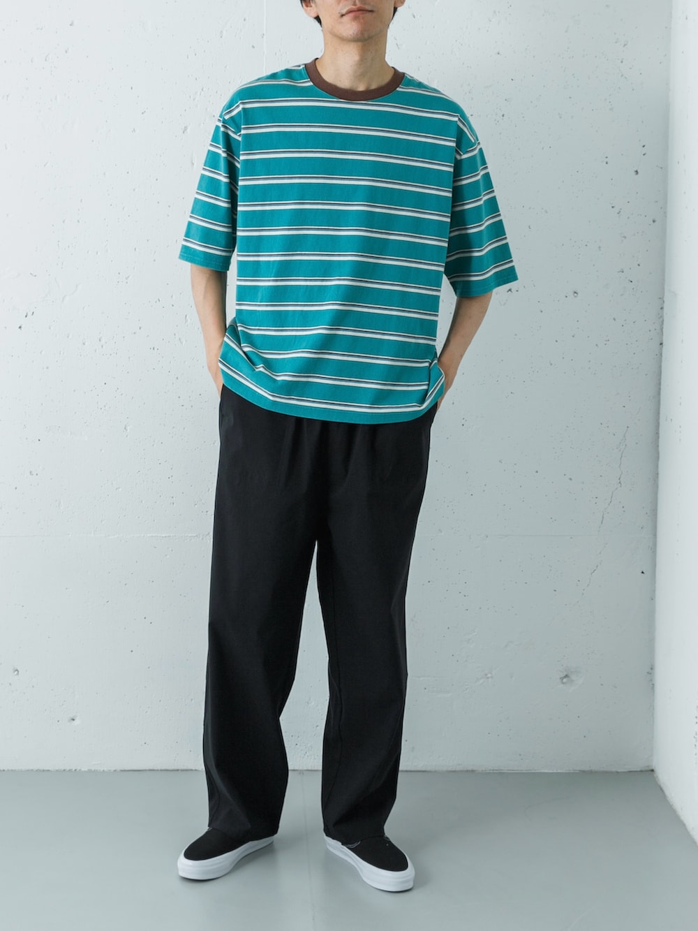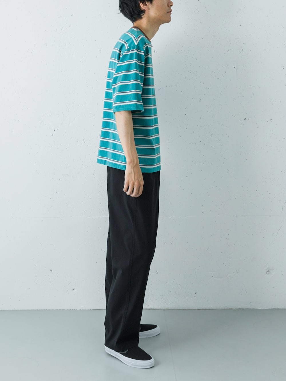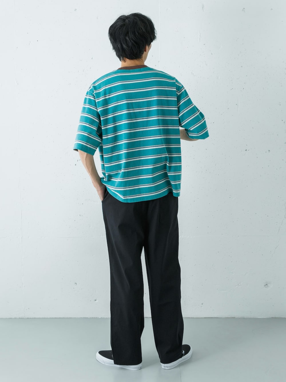 グリーンのマルチボーダーTシャツに、ブラックのベイカーパンツを合わせたスタイリング。先ほどのベージュ合わせが「王道のアメカジ」なら、こちらは都会に馴染む「モダンスタイル」です。