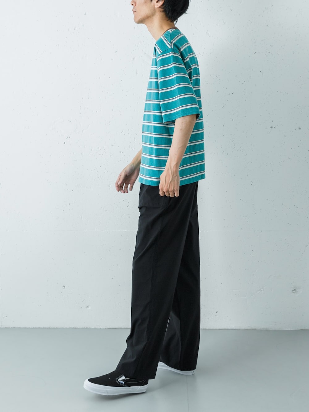 このボトムスはミリタリー由来のベイカーパンツですが、野暮ったい綿素材ではなく、落ち感のあるハイスペックな機能素材。この都会的な質感の「黒」だからこそ、カジュアルなボーダーTシャツを合わせても子供っぽくならず、洗練された大人の週末着に仕上がるのです。