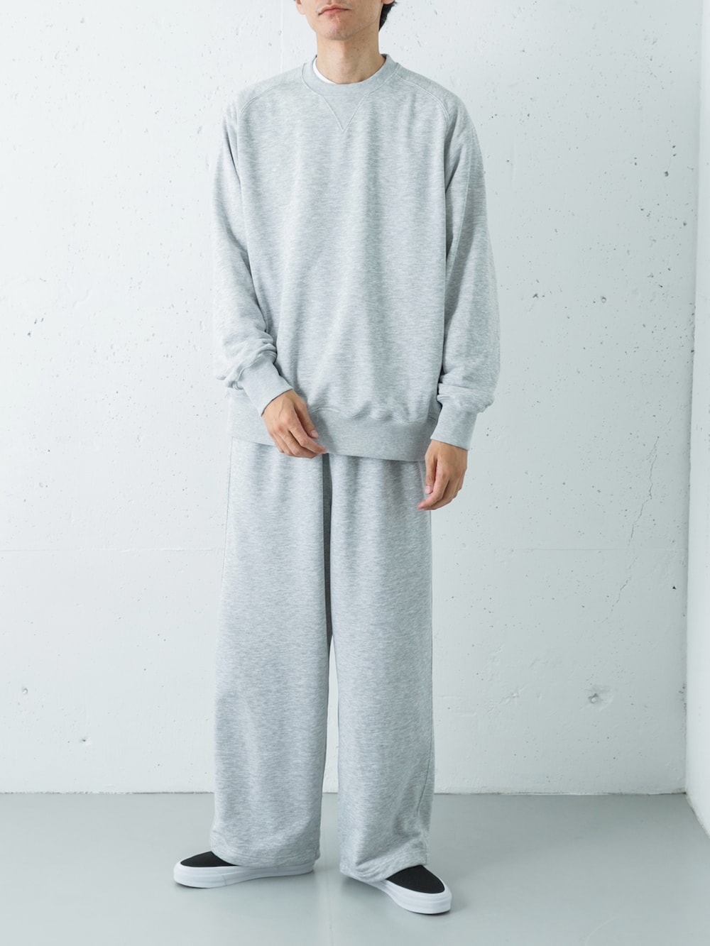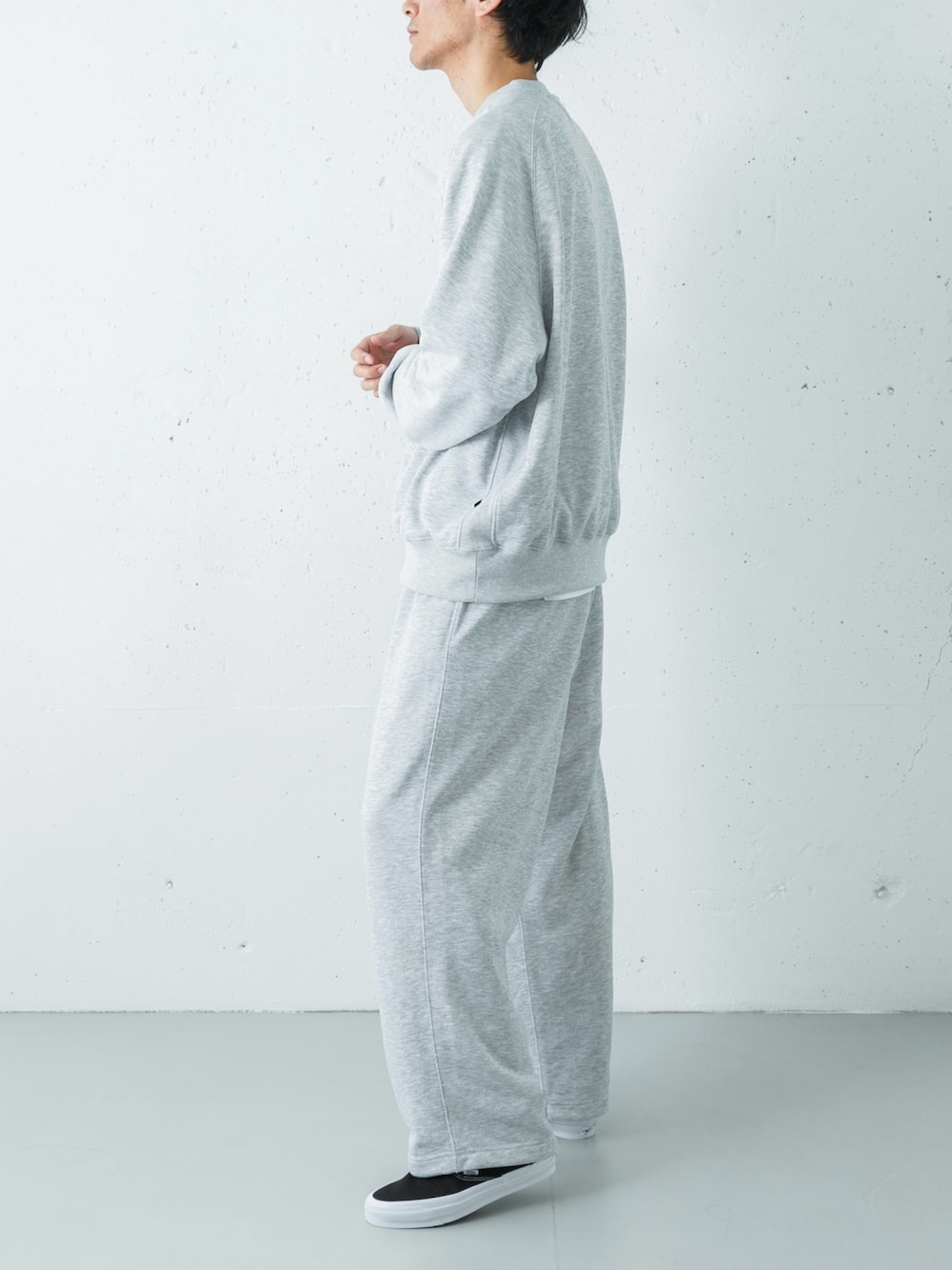 一見すると、オーセンティックなアメカジの王道を行くヘザーグレーのスウェットセットアップ。しかしその実態は、DAIWA PIER39が仕掛ける『心地よい裏切り』にあります。