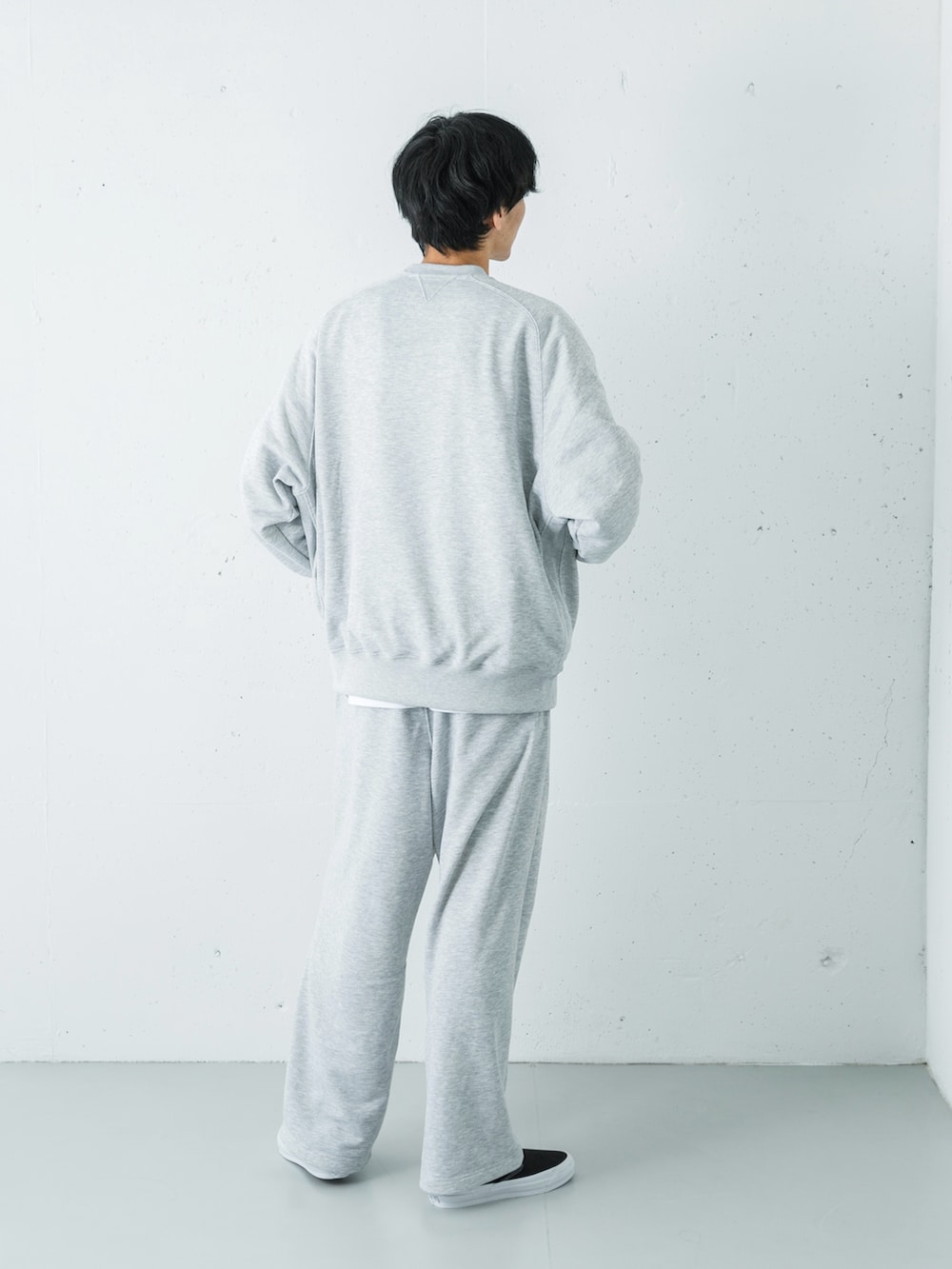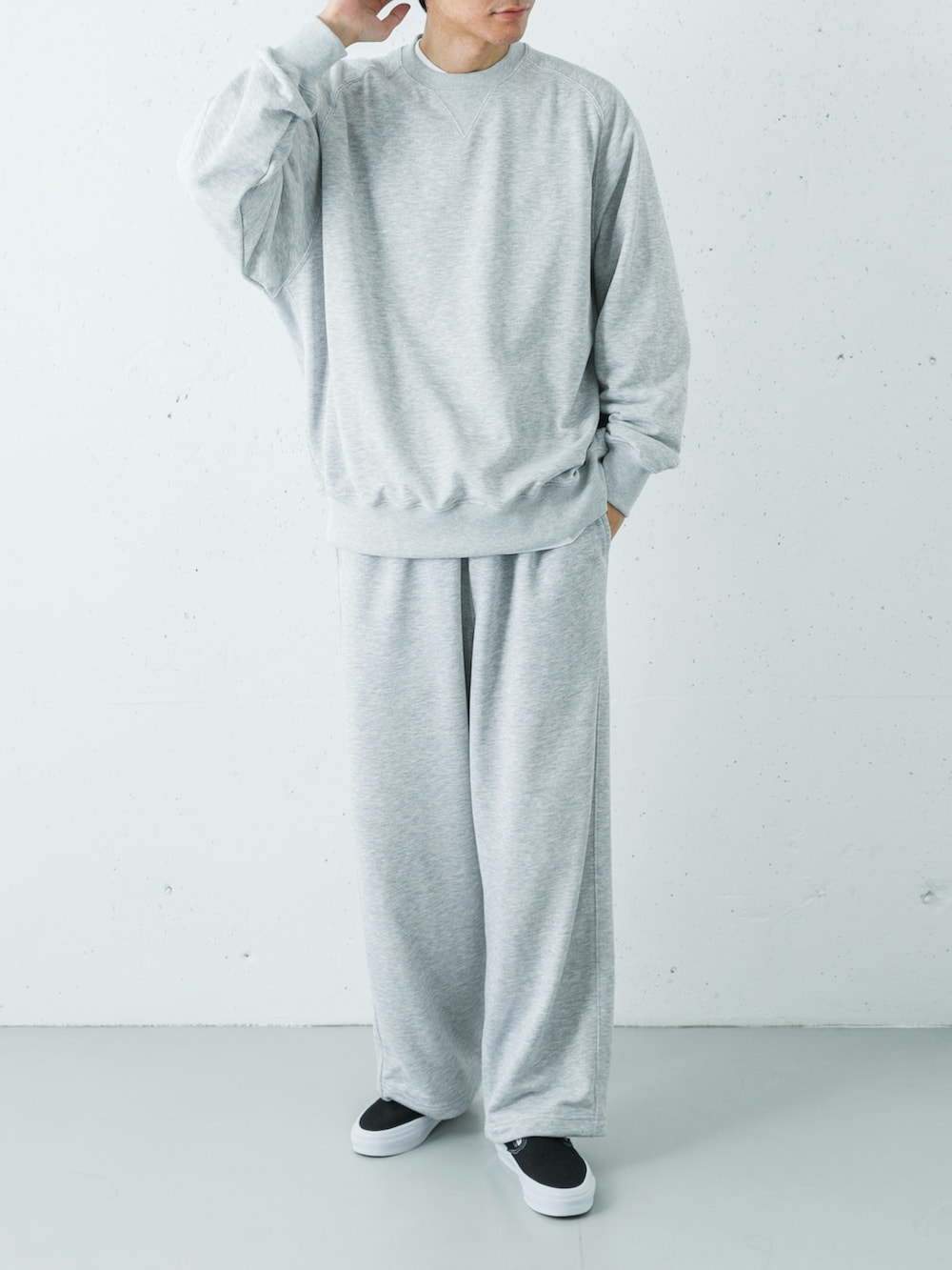 膨張しがちなライトグレーの足元には、VANSのプレミアムライン「LX」をセレクト。ただのスニーカーではなく、上質な素材感とモノトーンのソリッドな配色を選ぶことで、リラックスな装いを都会的なストリートモードへと格上げしています。