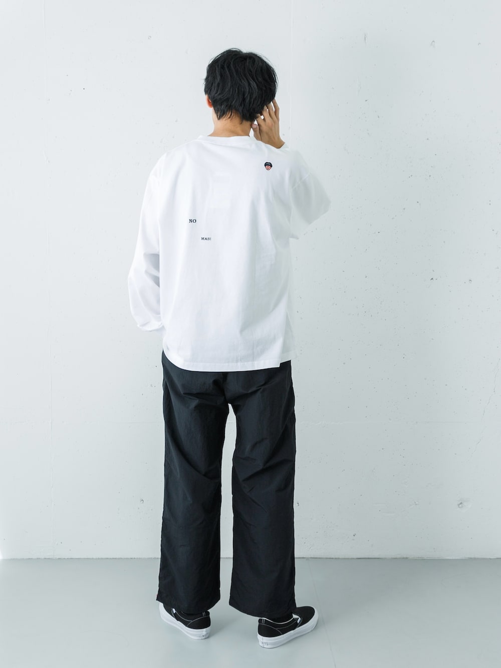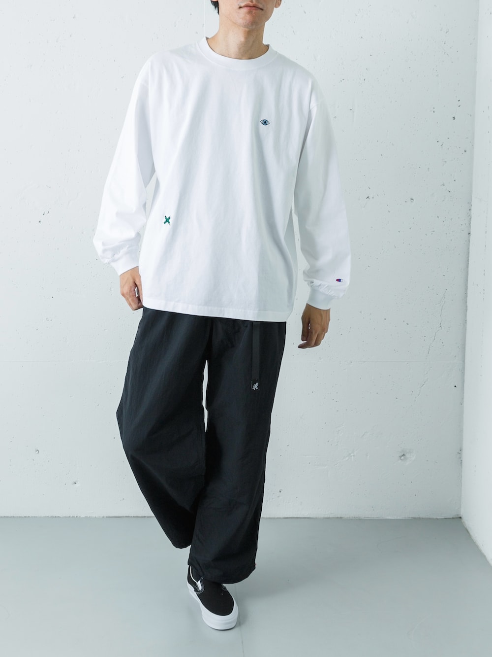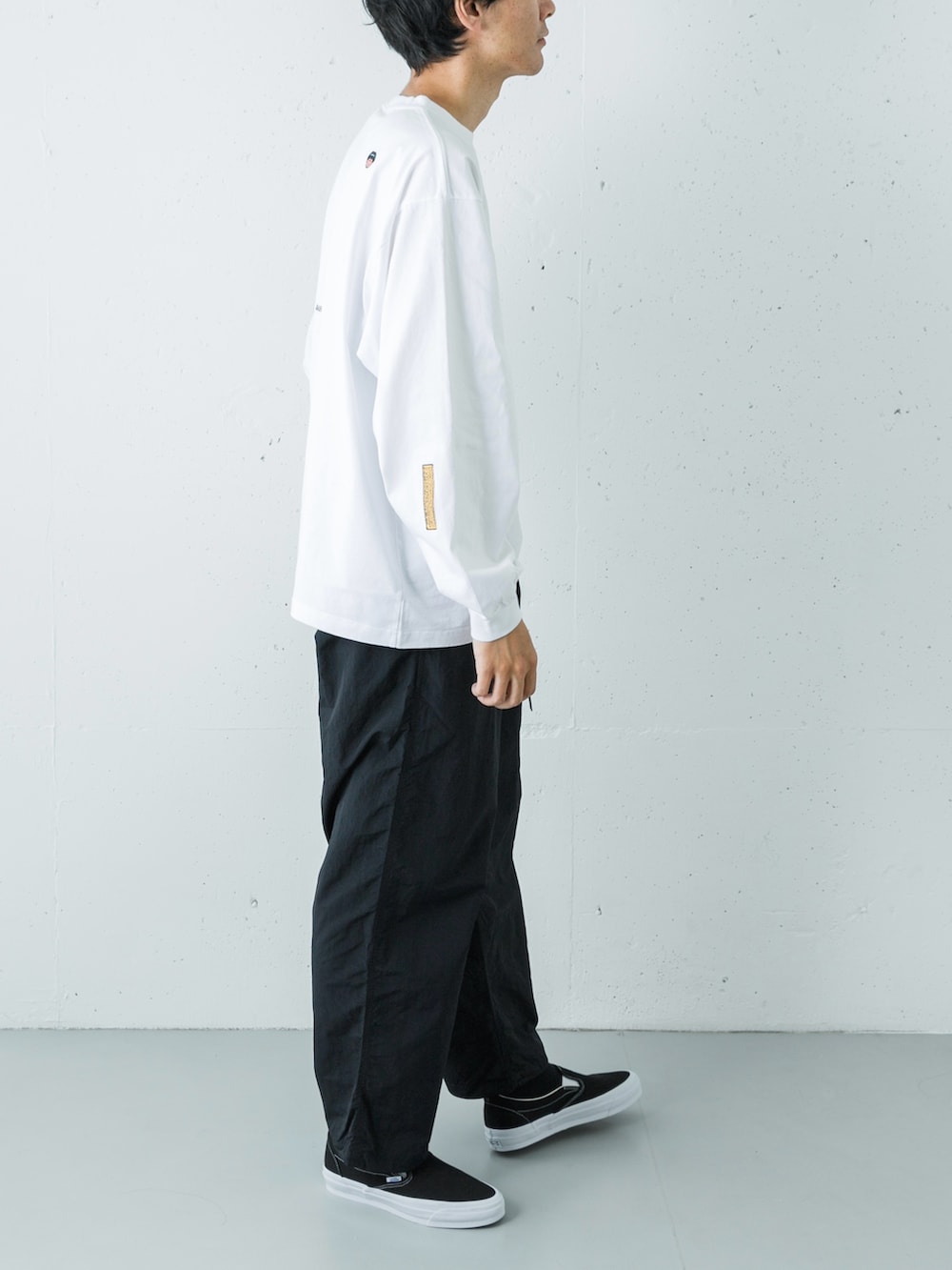 トップスは、注目のアーティスト「FACEOKA」のアートワークを配したL/S TEE。インパクトのあるグラフィックも、白ベースなら清潔感があり取り入れやすいです。