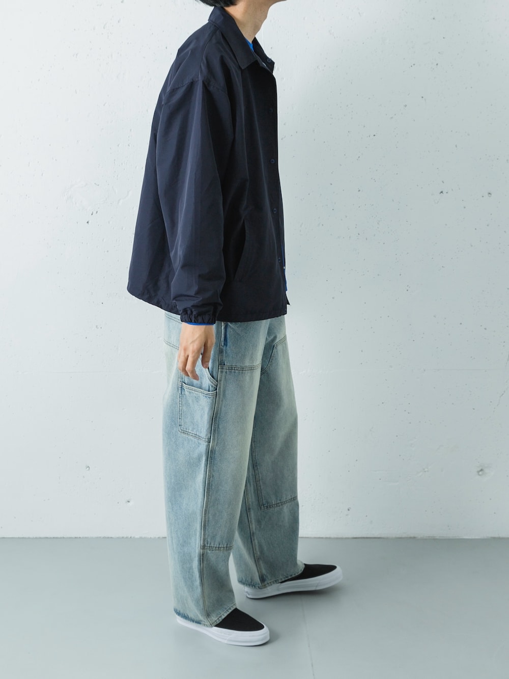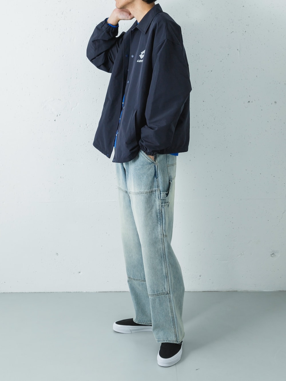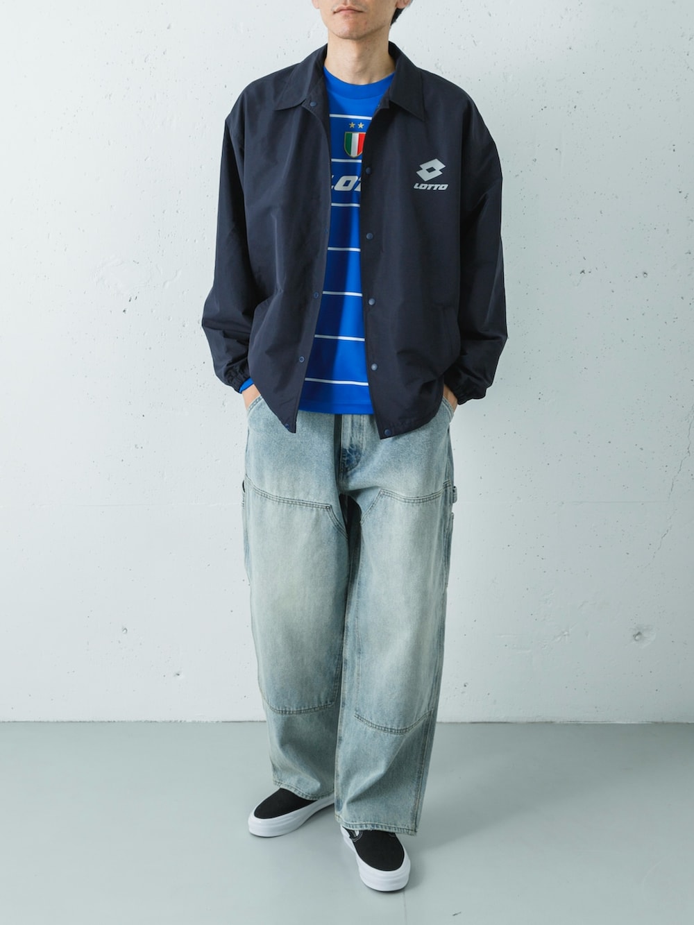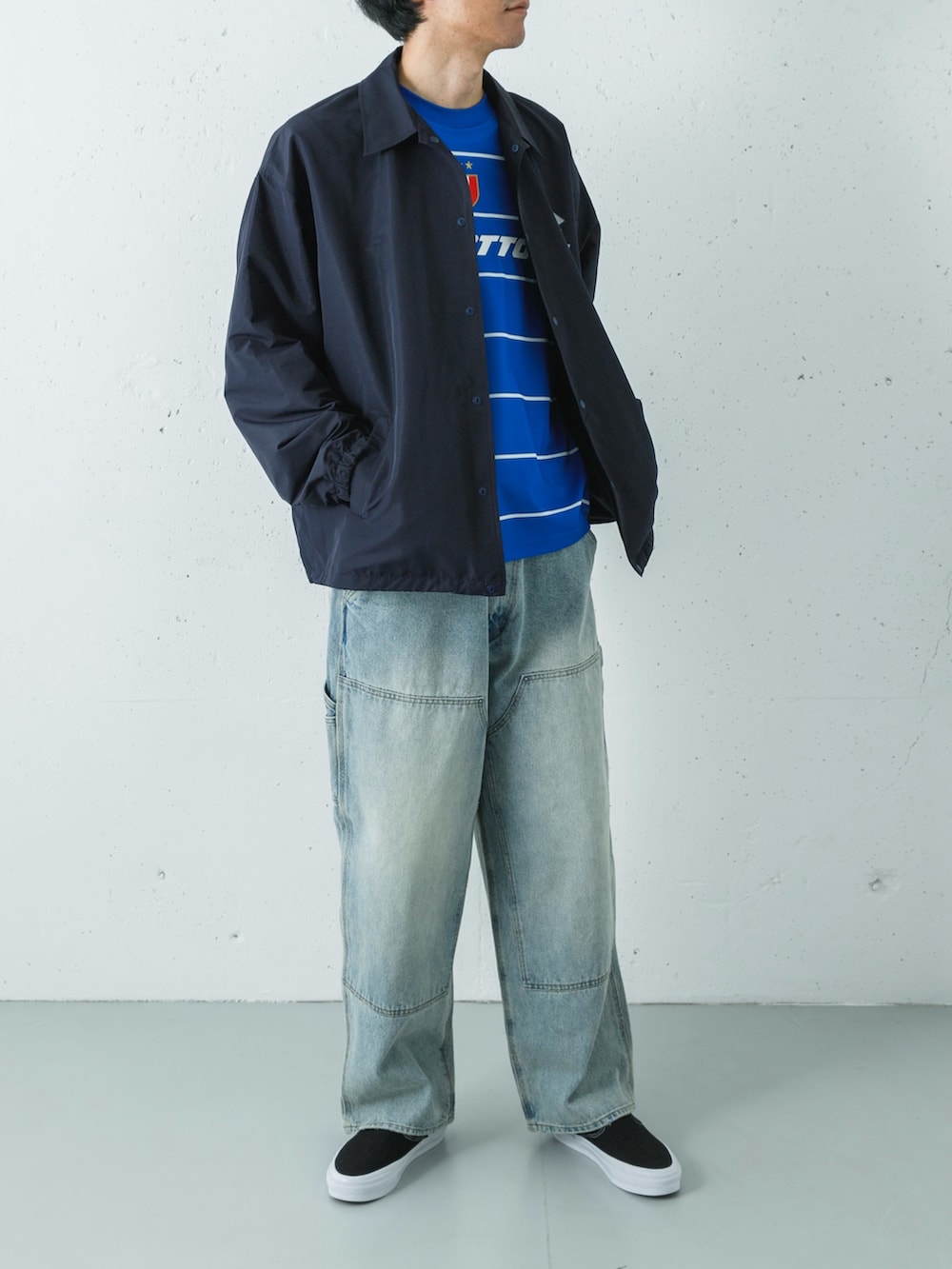 アウターは、背面のプリントがアイコニックなネイビーのコーチジャケット。そのインナーに、鮮やかなブルーのボーダーゲームシャツをレイヤードしました。同系色のグラデーションの中で、ピッチの太いボーダーが視覚的なリズムを生み出し、トレンドの「ブロークコア」なムードを加速させています。