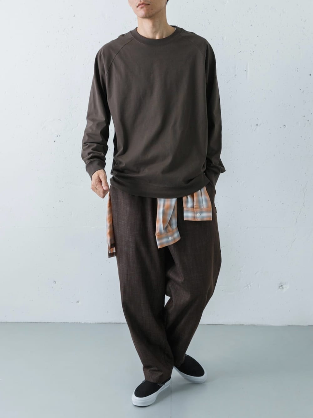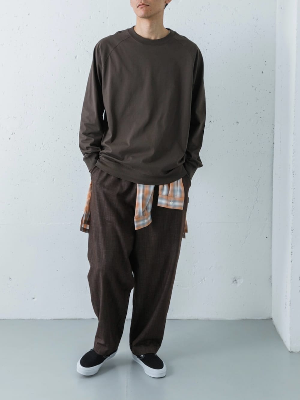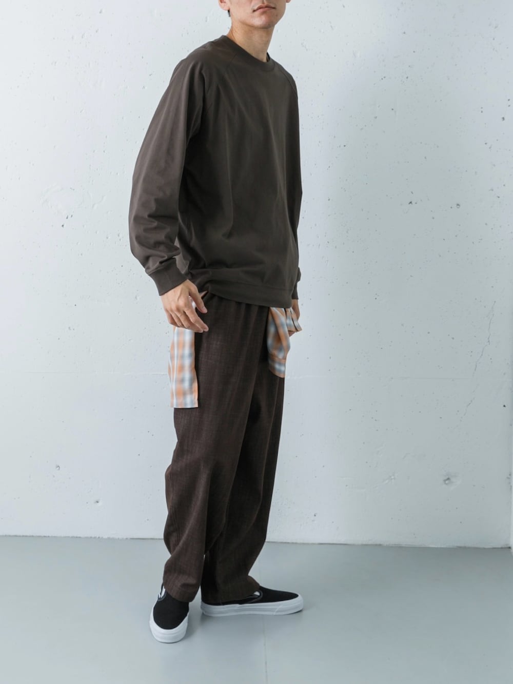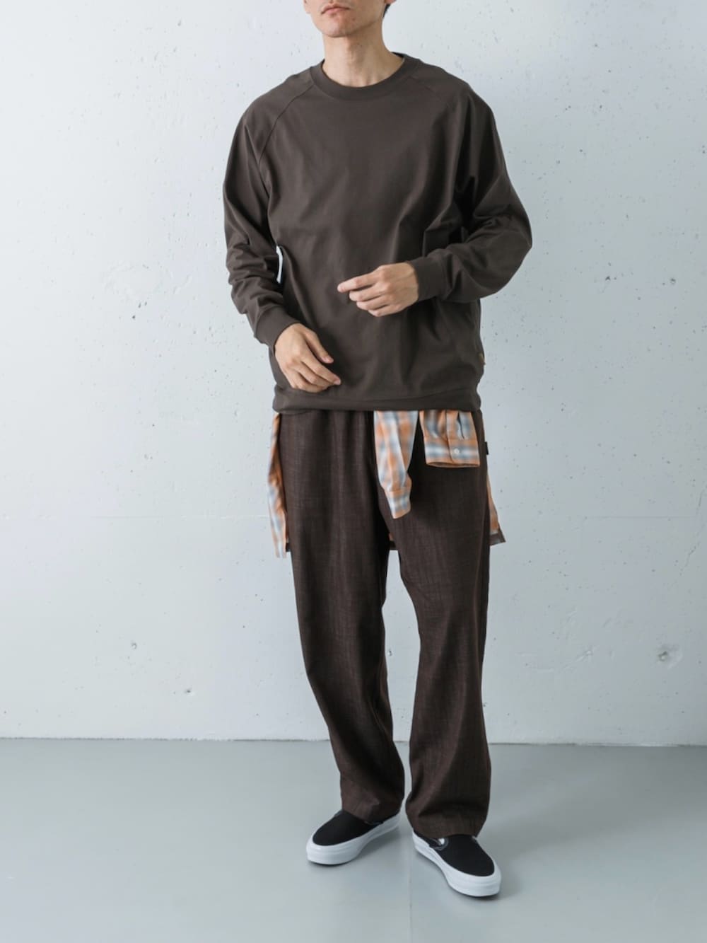 足元には、ストリートの永久定番であるVANSスリッポンを合わせました。プレミアムライン「LX」の上質な黒と白のコントラストが、土臭いブラウンコーデを都会的な表情へと引き締めています。