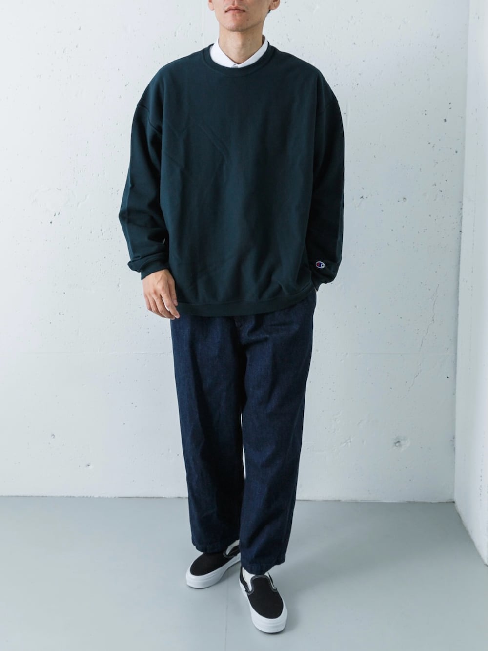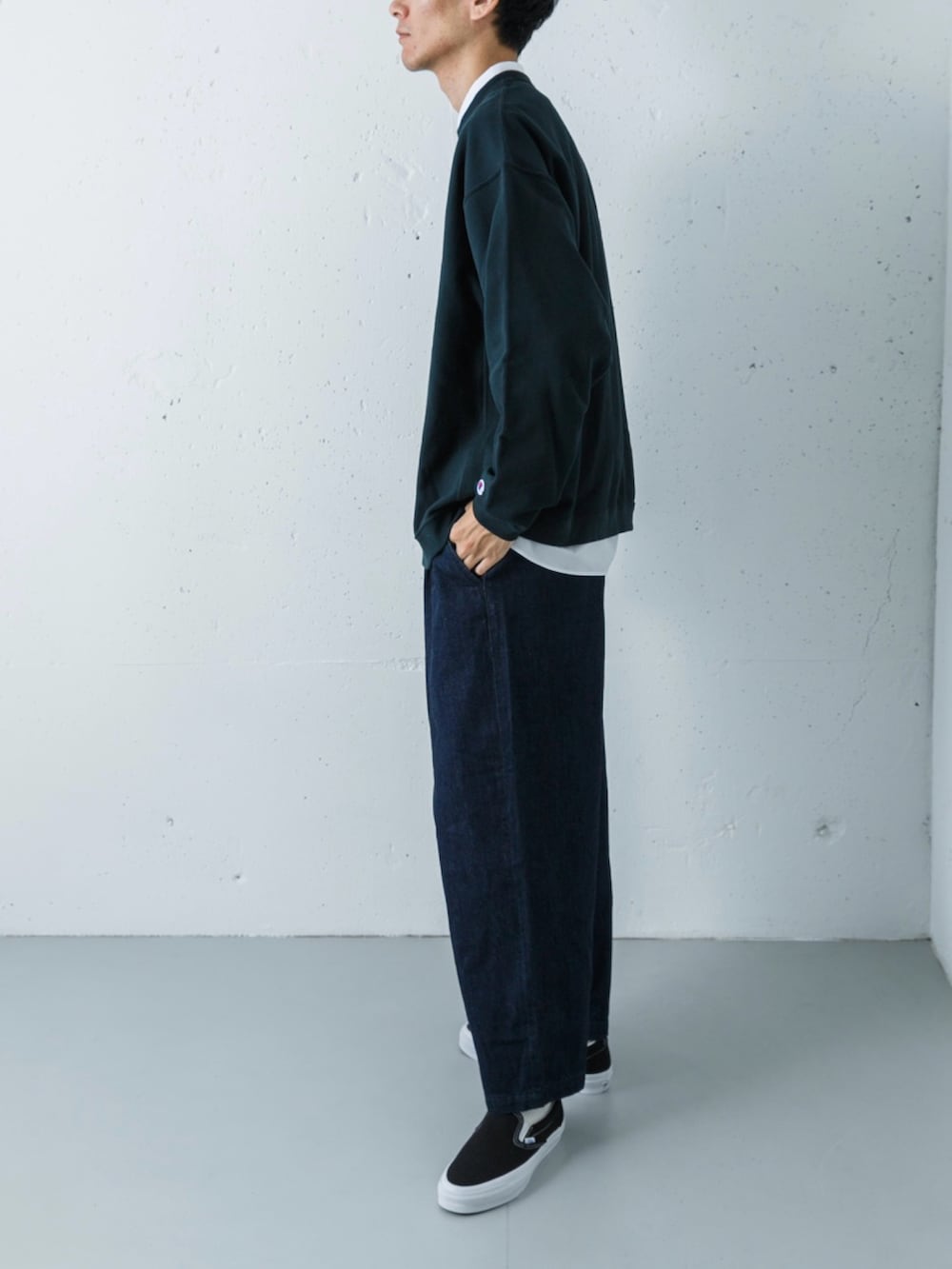 チャンピオンのリバースウィーブに、太めのデニム。 一見するとすごくスタンダードなアメカジですが、この「Wide Dad」特有のゆったりとしたシルエットが、今っぽいリラックス感を作ってくれます。