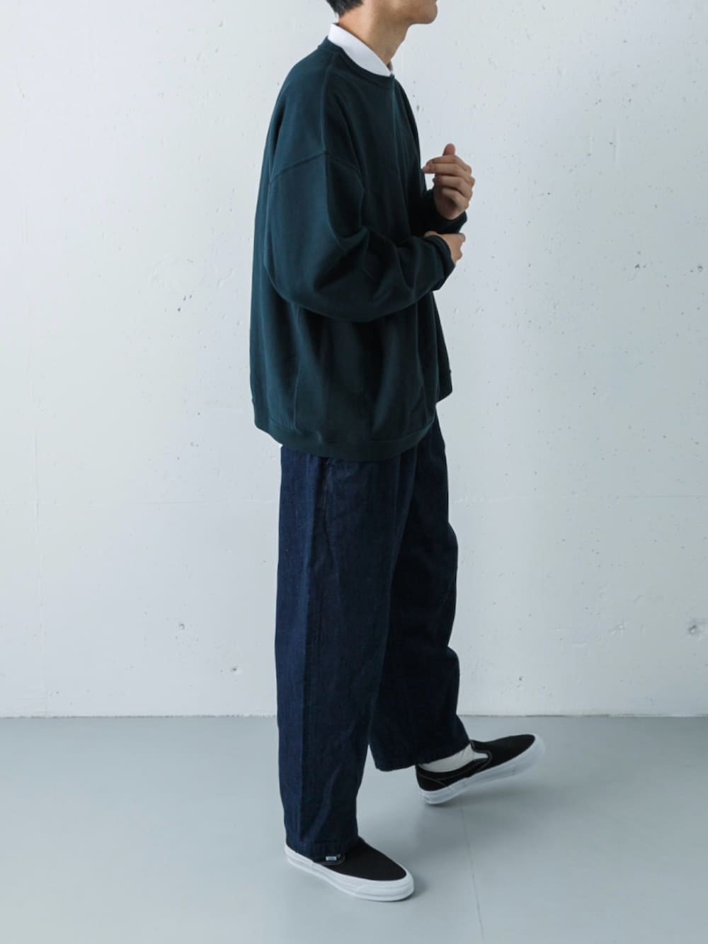 ポイントは、スウェットの首元から覗く「白シャツ」です。 ここで普通のTシャツではなく、あえて英国の老舗・トーマスメイソンのドレスシャツを合わせるのがミソ。スウェットの肉厚でドライな質感に、パリッとしたシャツの品良さが加わって、カジュアルなのにどこか背筋が伸びるような、大人のバランスに仕上がっています。