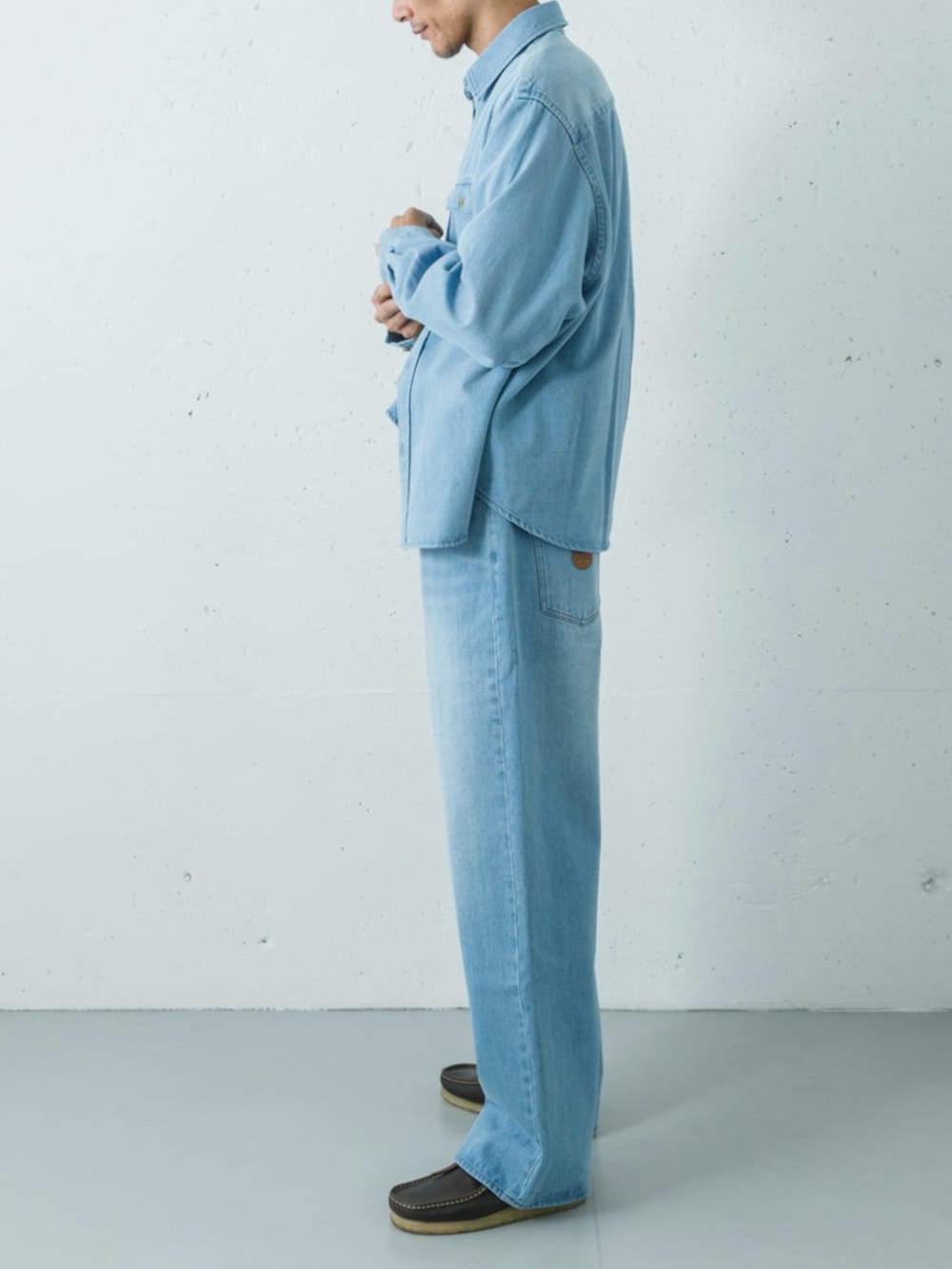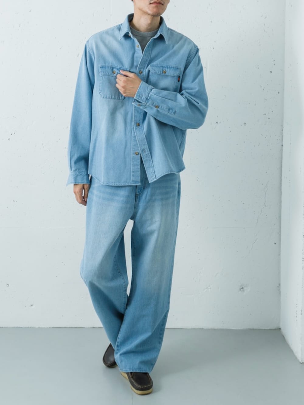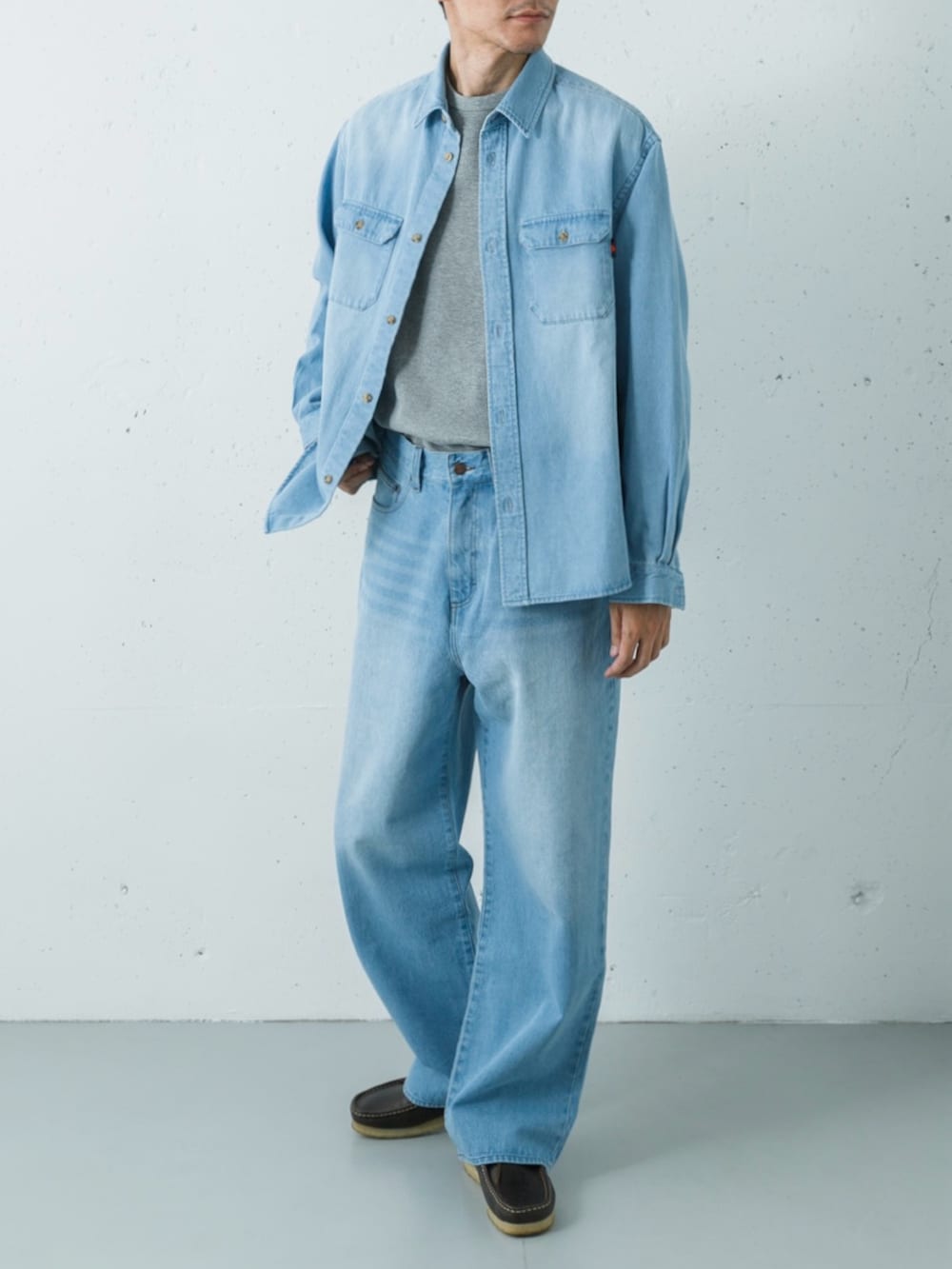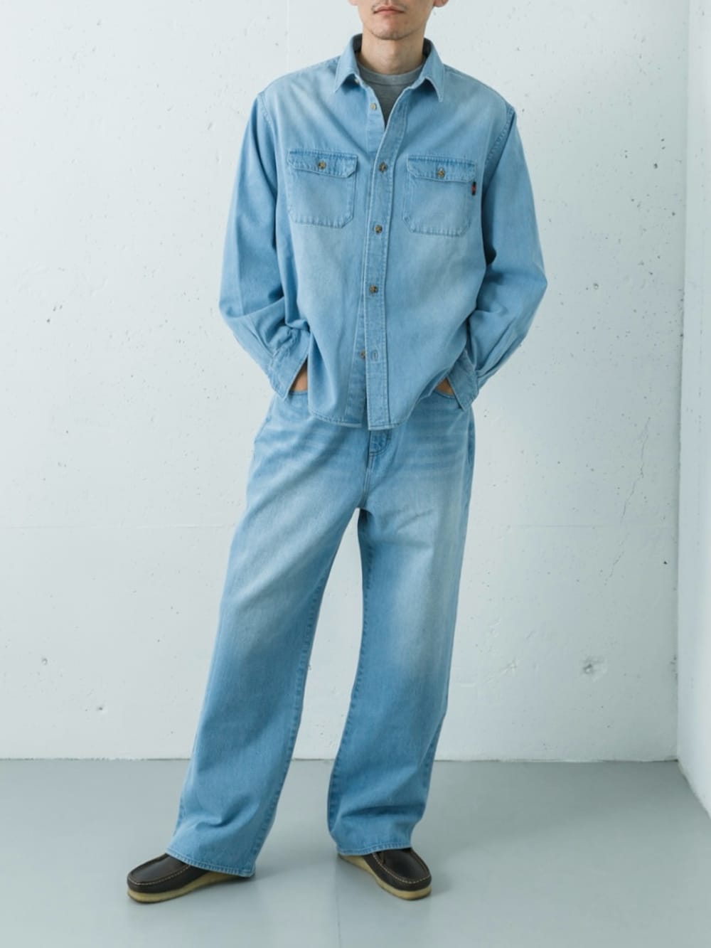 アメリカの老舗ワークブランドRED KAPに別注をかけた、デニムシャツとワイドパンツの組み合わせ。