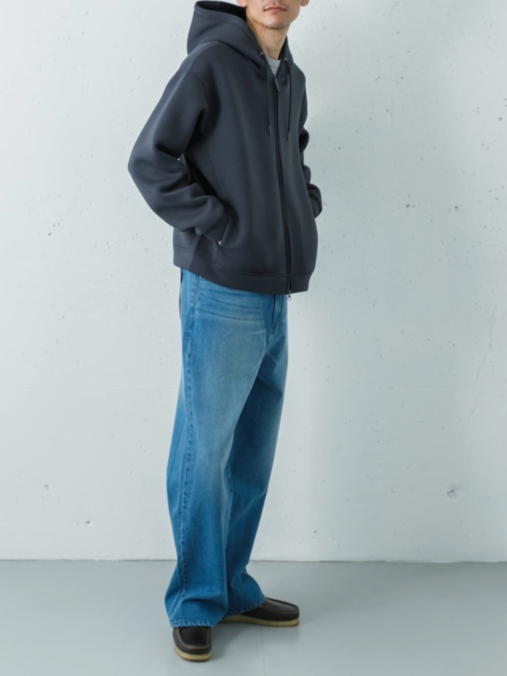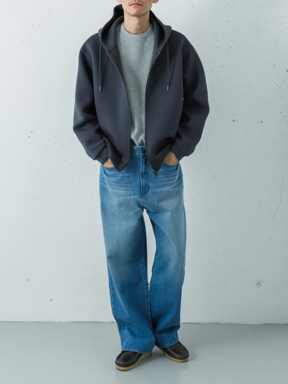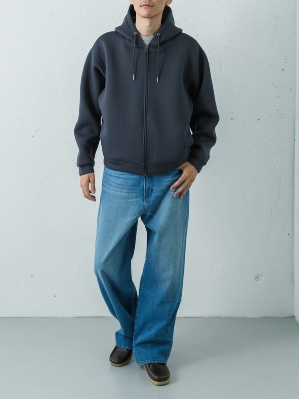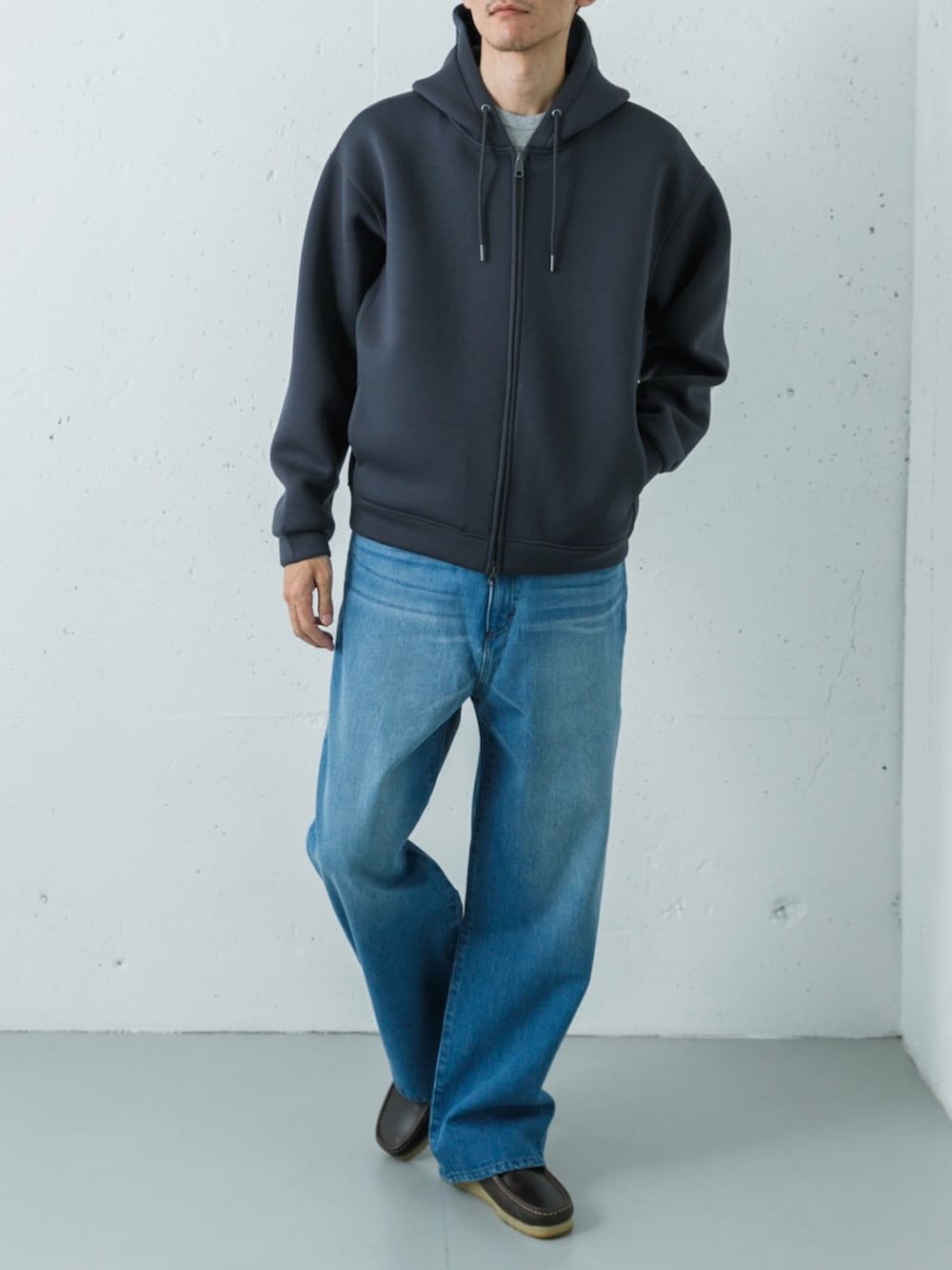 ハリとツヤのあるチャコールのダンボールニットパーカーに、ヘザーグレーのワッフルロンTを重ねたトップス。滑らかな生地と凹凸のあるインナーの質感を対比させることで、同系色のグラデーションに豊かな立体感を生み出しています。