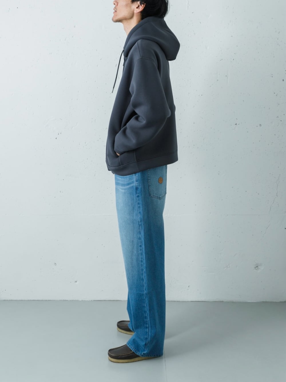 ボトムスには穿き込んだ風合いのRED KAP別注ワイドデニムを合わせ、クリーンな上半身を程よくカジュアルダウン。足元にダークブラウンのワラビーを添えることで、クールな配色の中に大人の温もりと品格をプラスした、リラックス感あふれる休日スタイルです。
