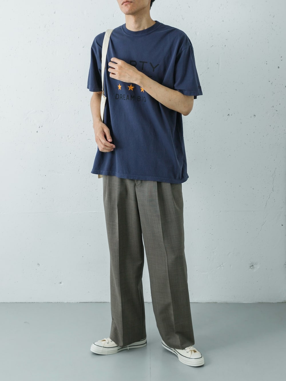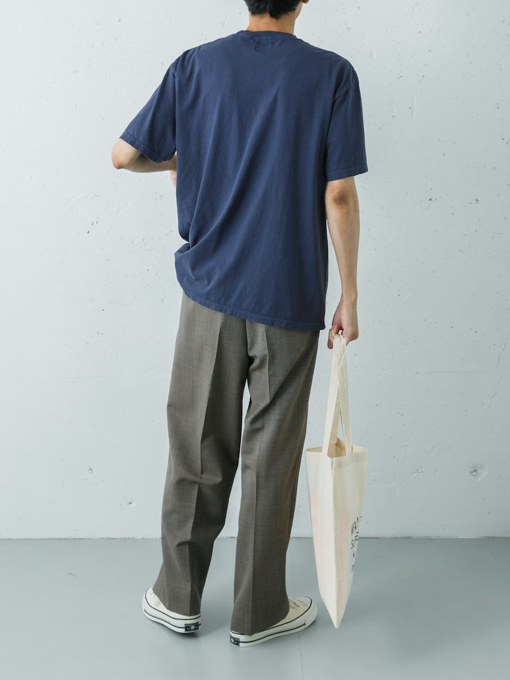 主役のTシャツは、ピグメント加工による色落ちしたような「フェードネイビー」が絶妙なこなれ感を演出します。そこに劇中の世界観を思わせるクラシックな50年代風のチェック柄トラウザーを合わせることで、ただのカジュアルに終わらない、深みのあるレトロモダンな着こなしが完成します。