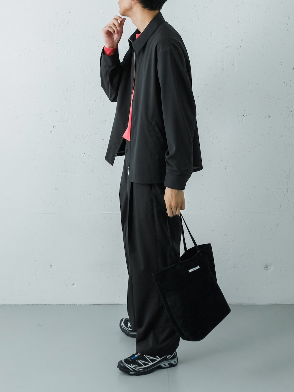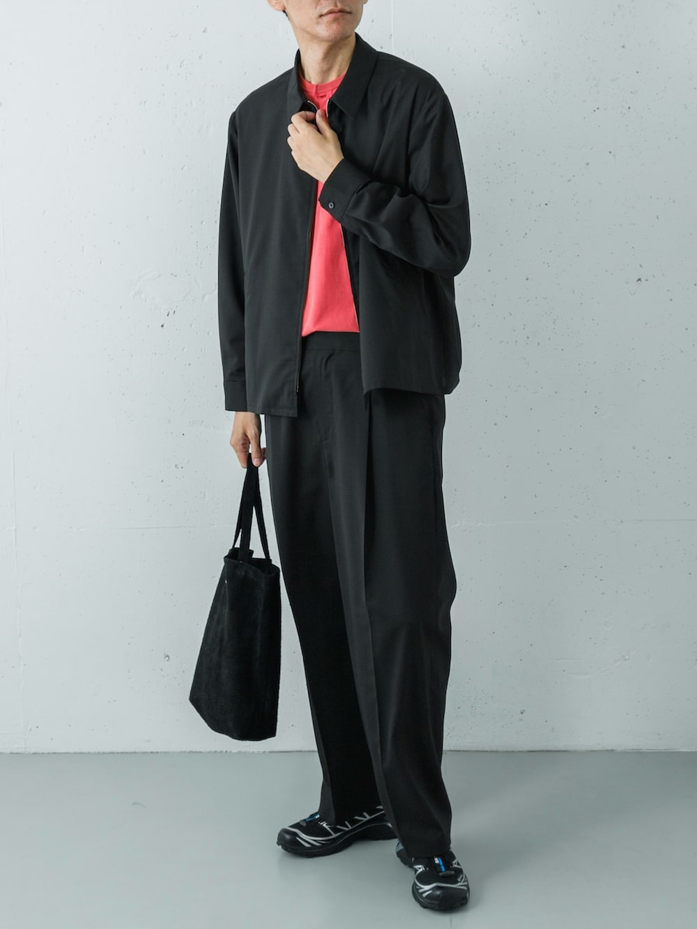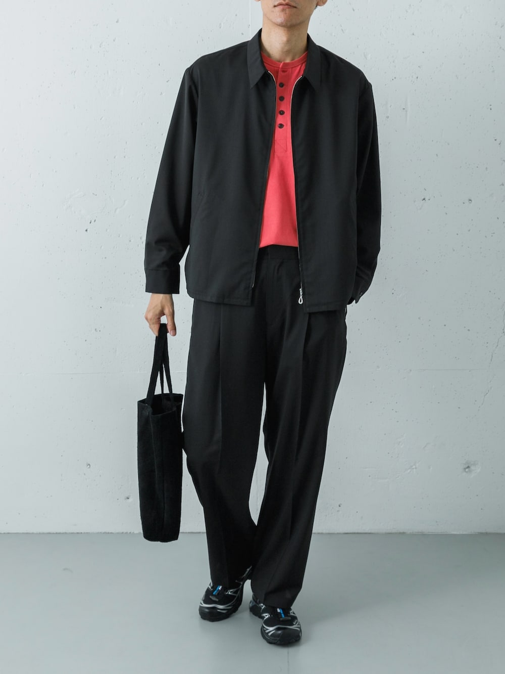 重く見えがちなブラックの上下ですが、インナーにULTERIORのレッドのヘンリーネックを合わせることで、計算された抜け感を作っています。ストイックな黒の中に差し色がスッと効いており、上品で洗練された印象に仕上がります。