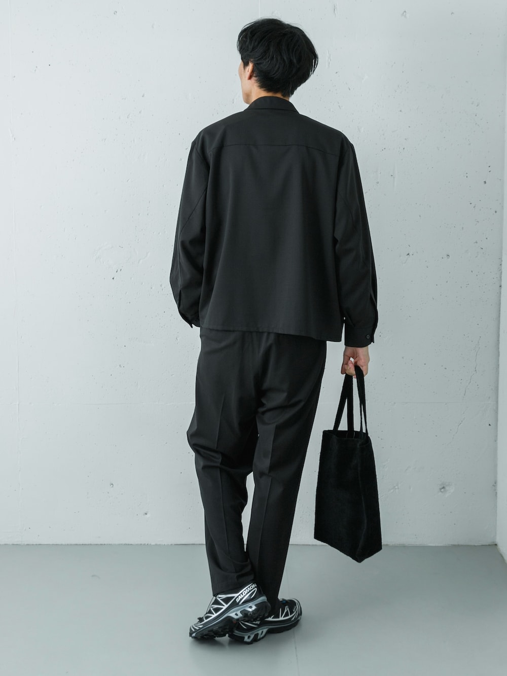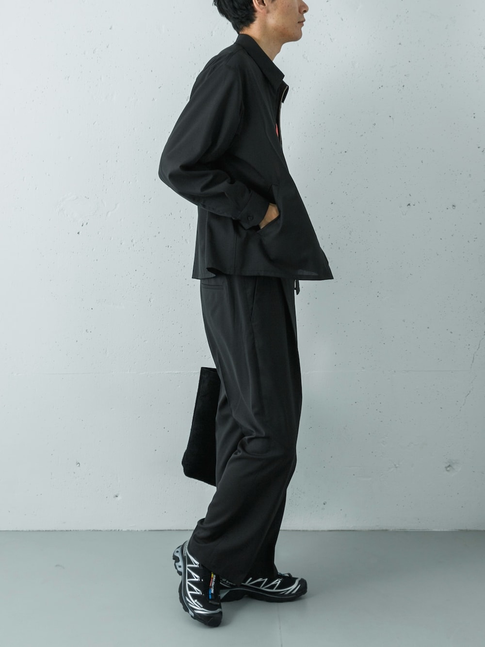 ウォッシャブルウール素材のスポーツジャケットとイージートラウザーで作る、シックで機能的な黒のセットアップスタイルです。
