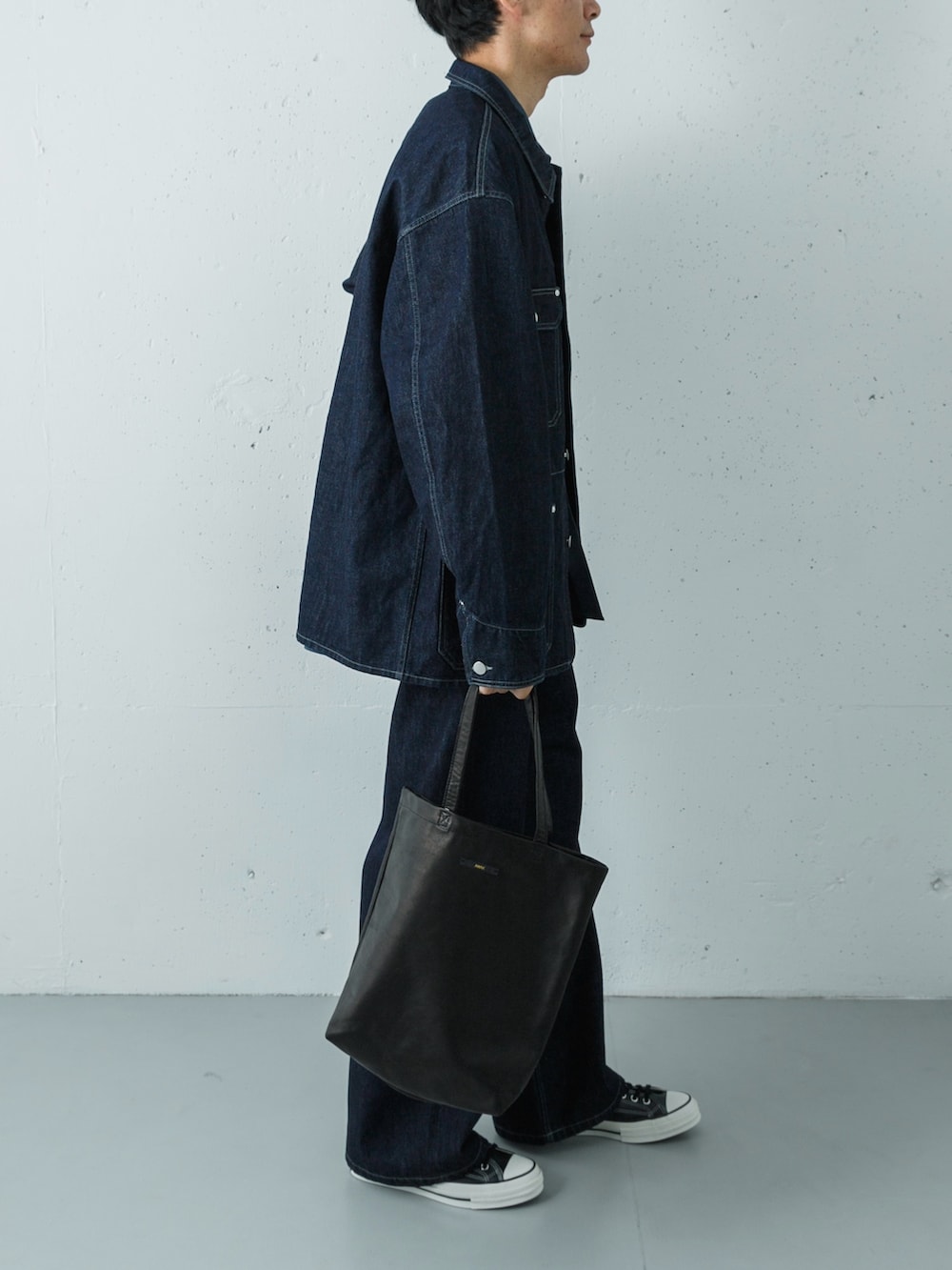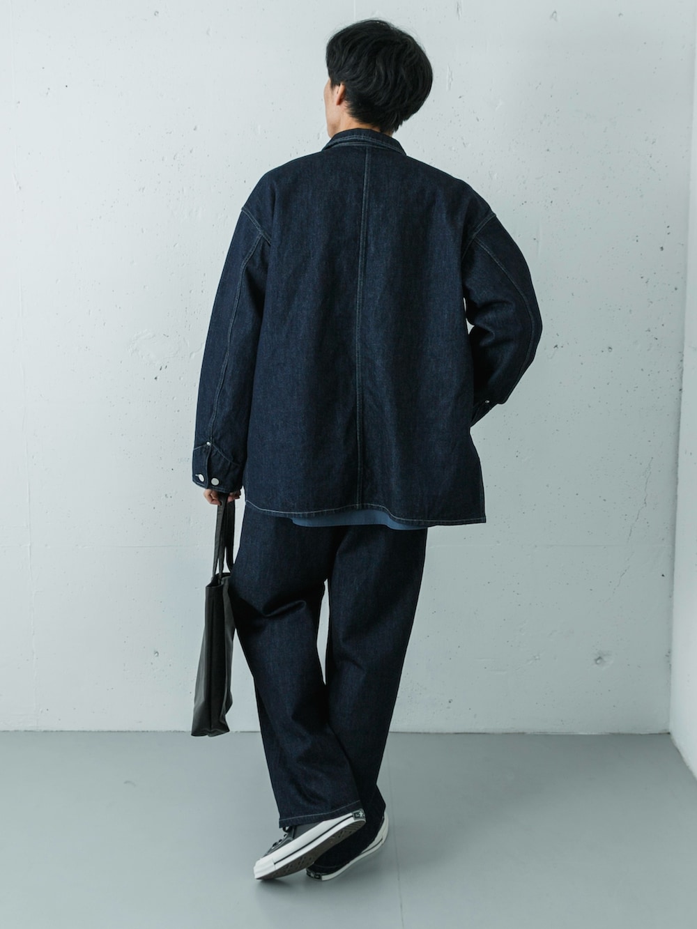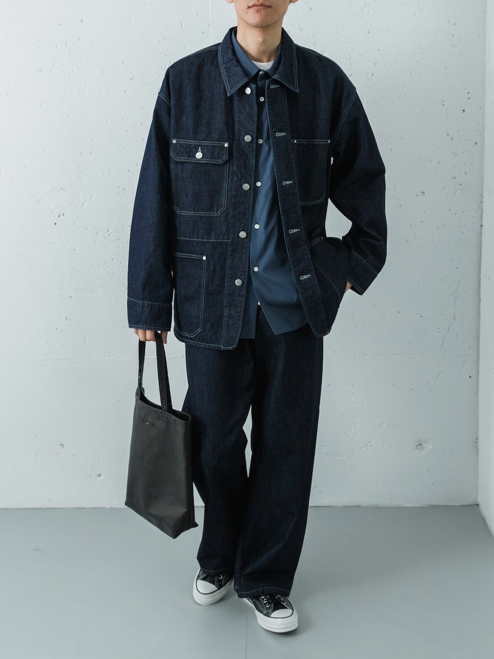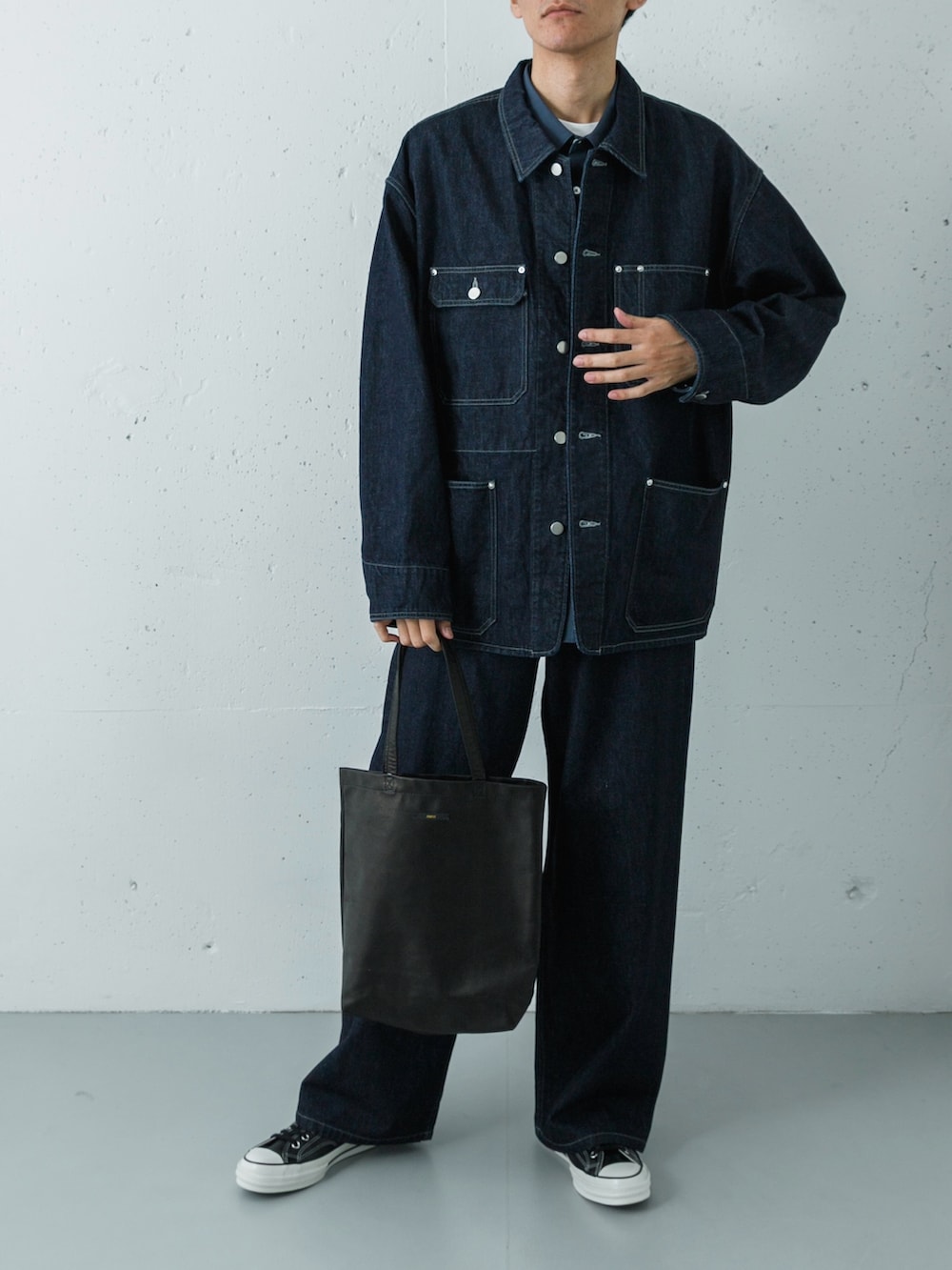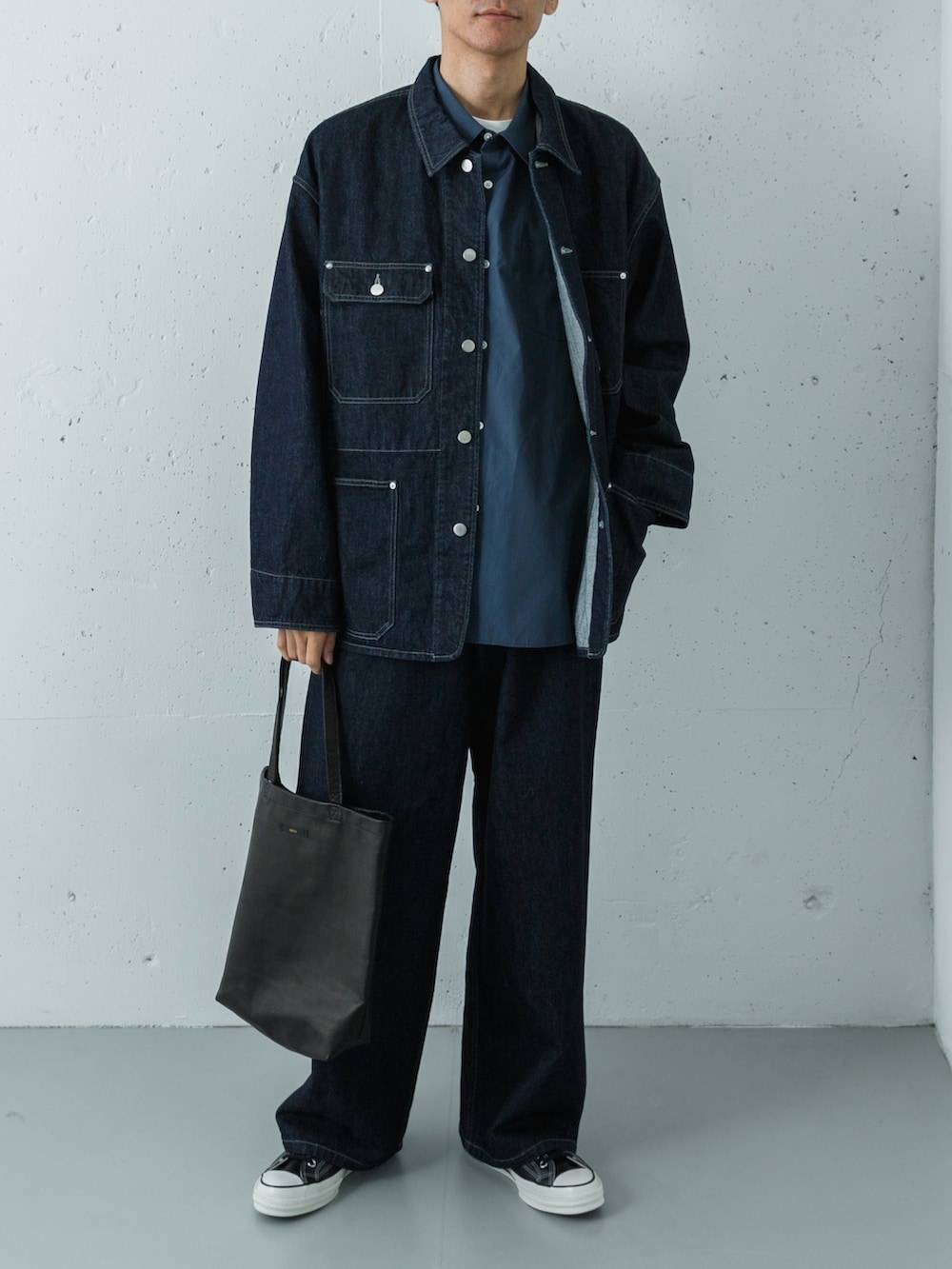 そのインナーには、英国老舗「THOMAS MASON」の生地を使用したティールブルーのオーバーシャツをセレクトしました。深いインディゴの上下に、ドレスシャツ特有の上質なツヤと、青みがかったグリーンの絶妙なカラーが差し込まれることで、武骨なはずのデニムスタイルがぐっと知的でエレガントな街着へと昇華されます。
