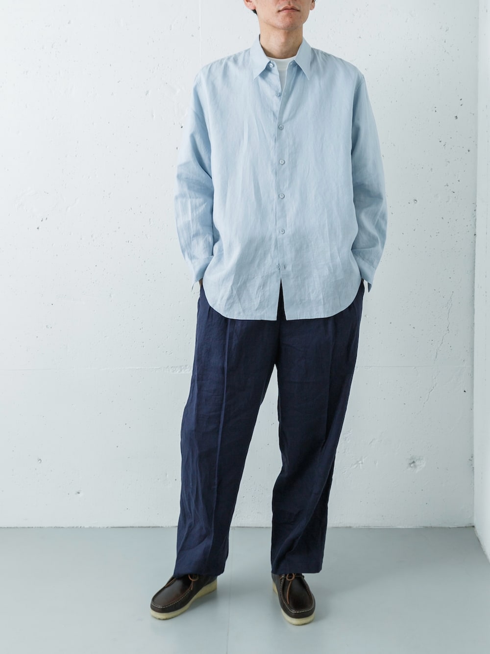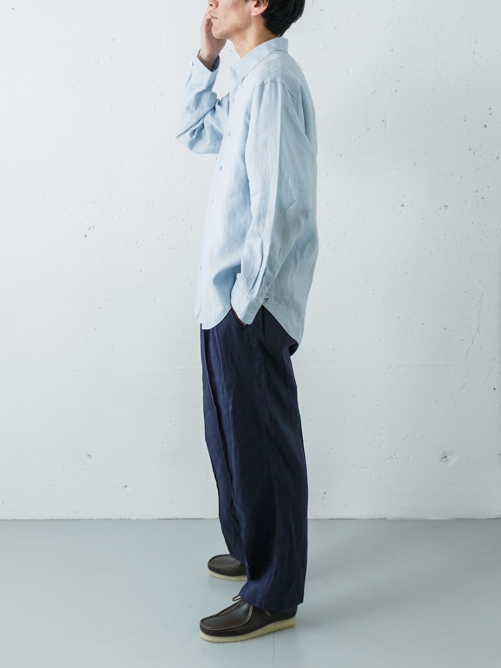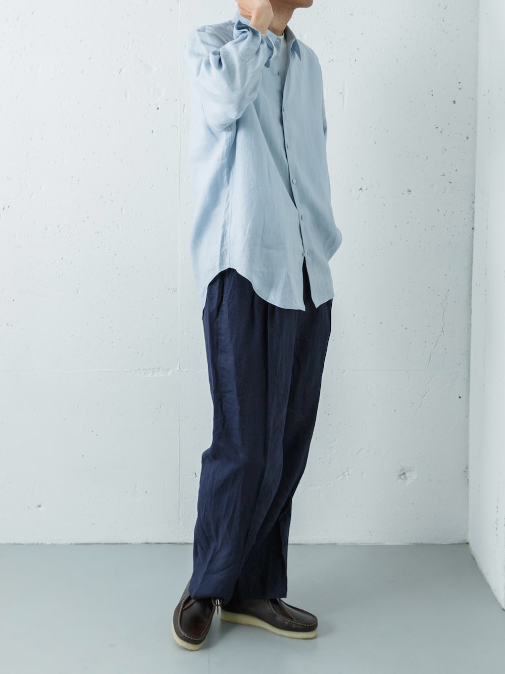 上下ともに通気性の良いドライなリネン素材で統一することで、夏らしくリラクシーな抜け感が漂います。同系色でまとめたクリーンな着こなしの足元には、あえてダークブラウンのクラークス ワラビーをセレクト。