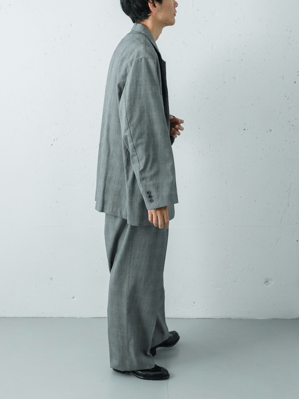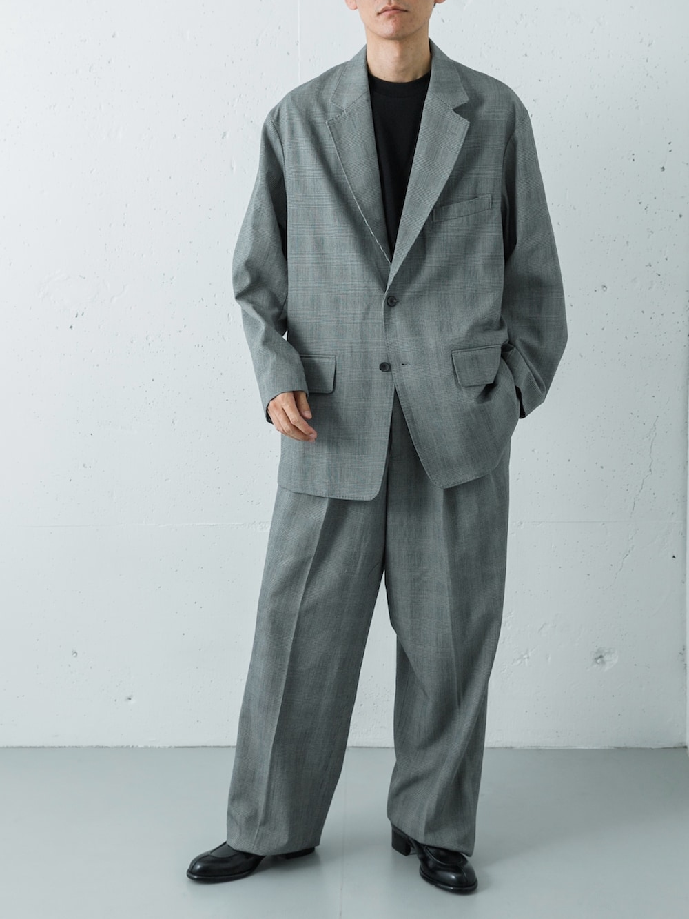 強撚ウールを使用した、new basicのチェック柄シングルジャケットとトラウザーのセットアップスタイル。クラシカルで端正なルックスですが、インナーの選び方でグッと都会的な表情に変化します。