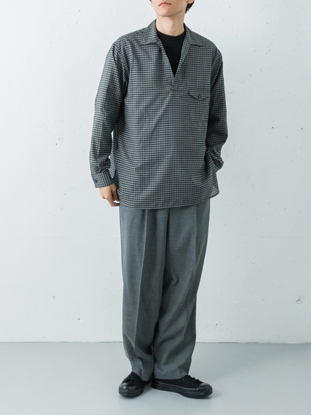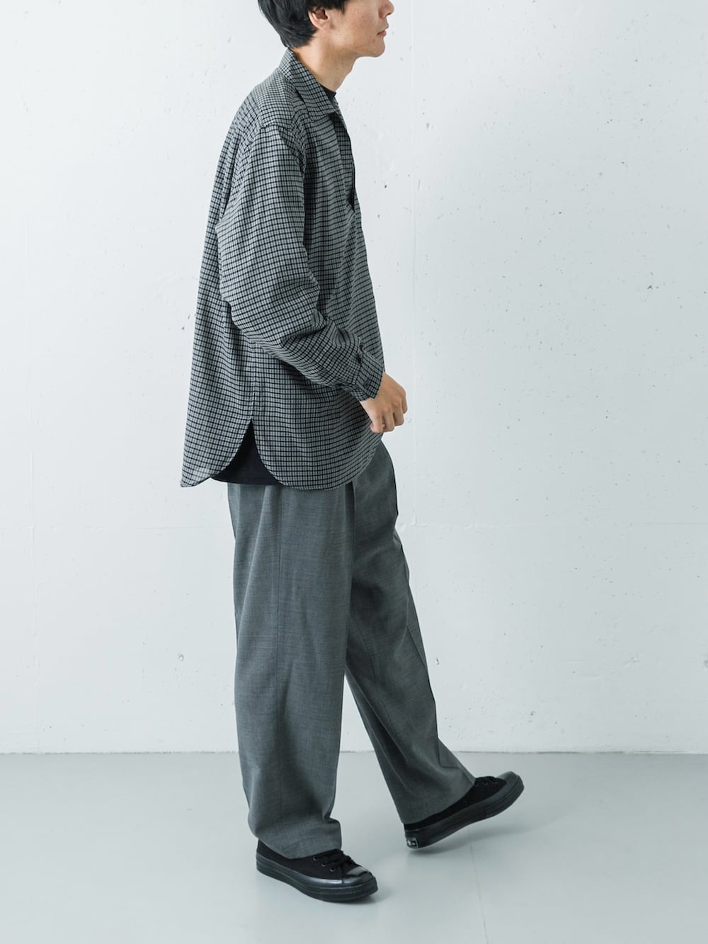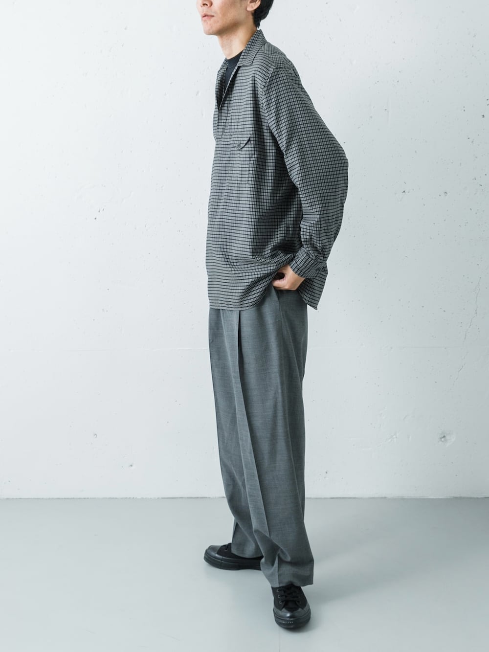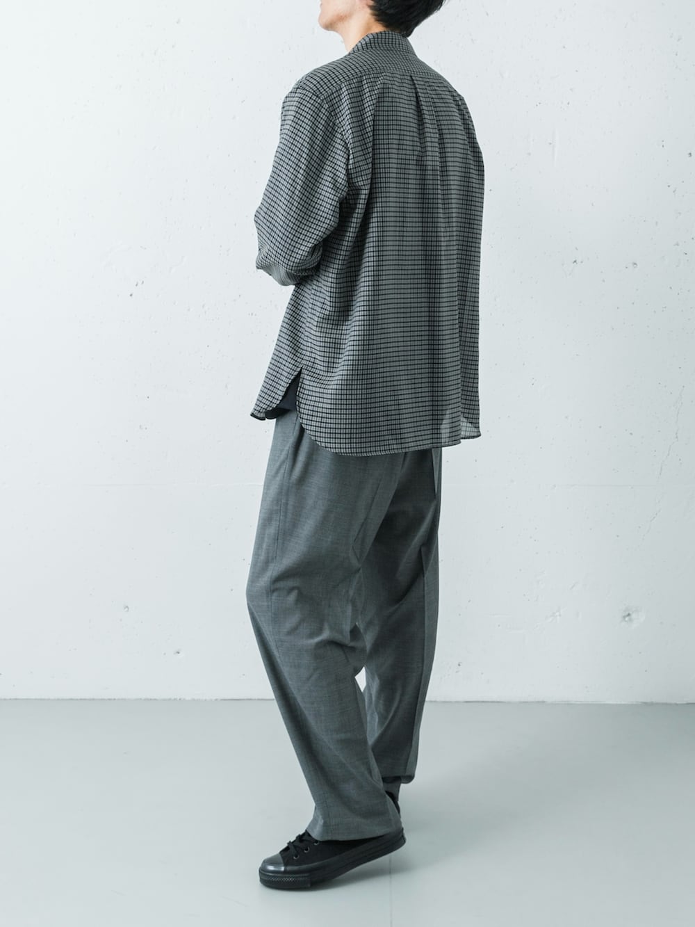 首元がスッキリと開いたスキッパーデザインが、クラシカルなチェック柄に大人の色気と抜け感をプラス。ボトムスにはATONのグレーのウールガーゼパンツを合わせることで、上下ともに軽やかでドレープの美しい、極上のリラックスシルエットを構築しています。
