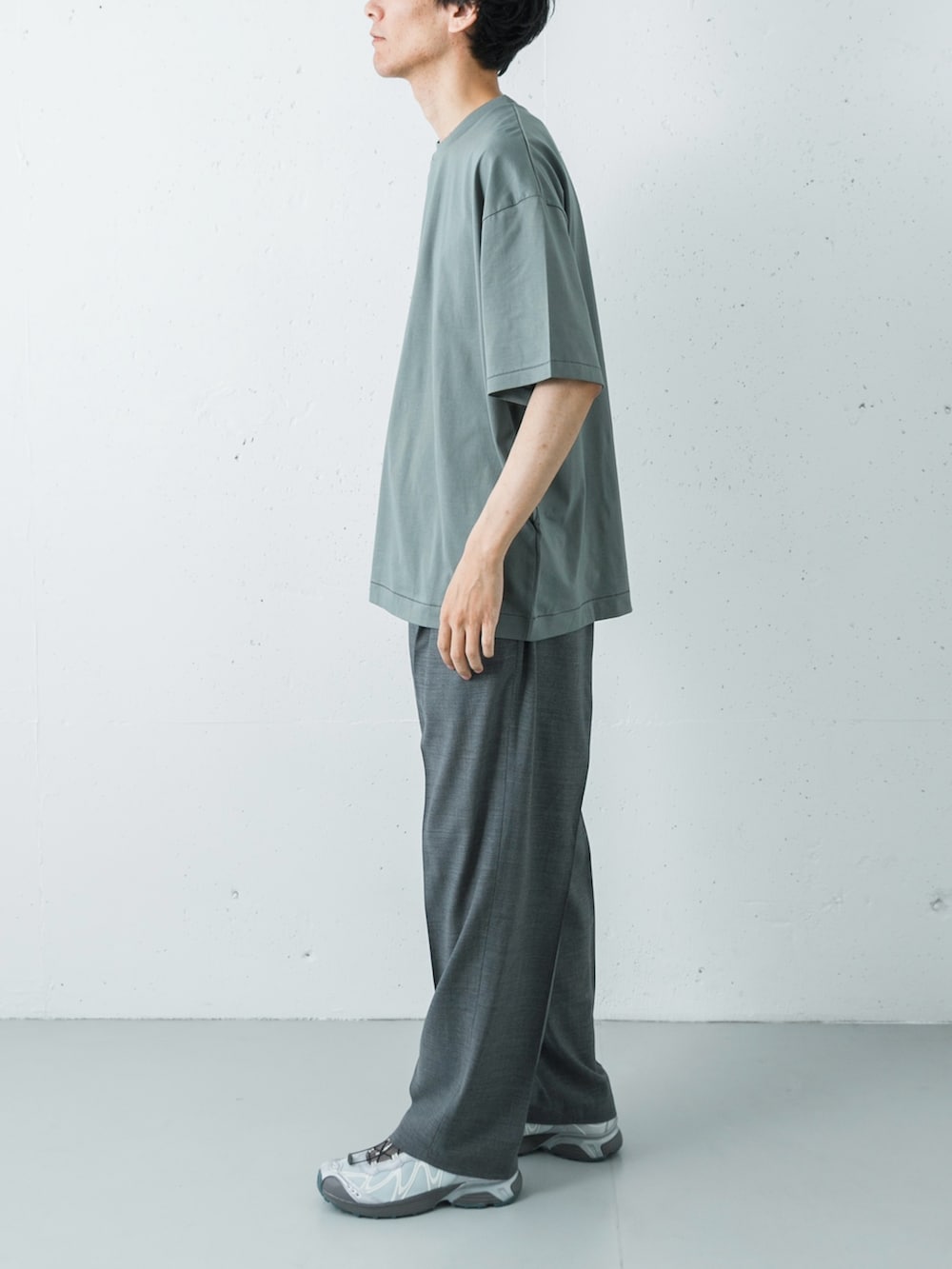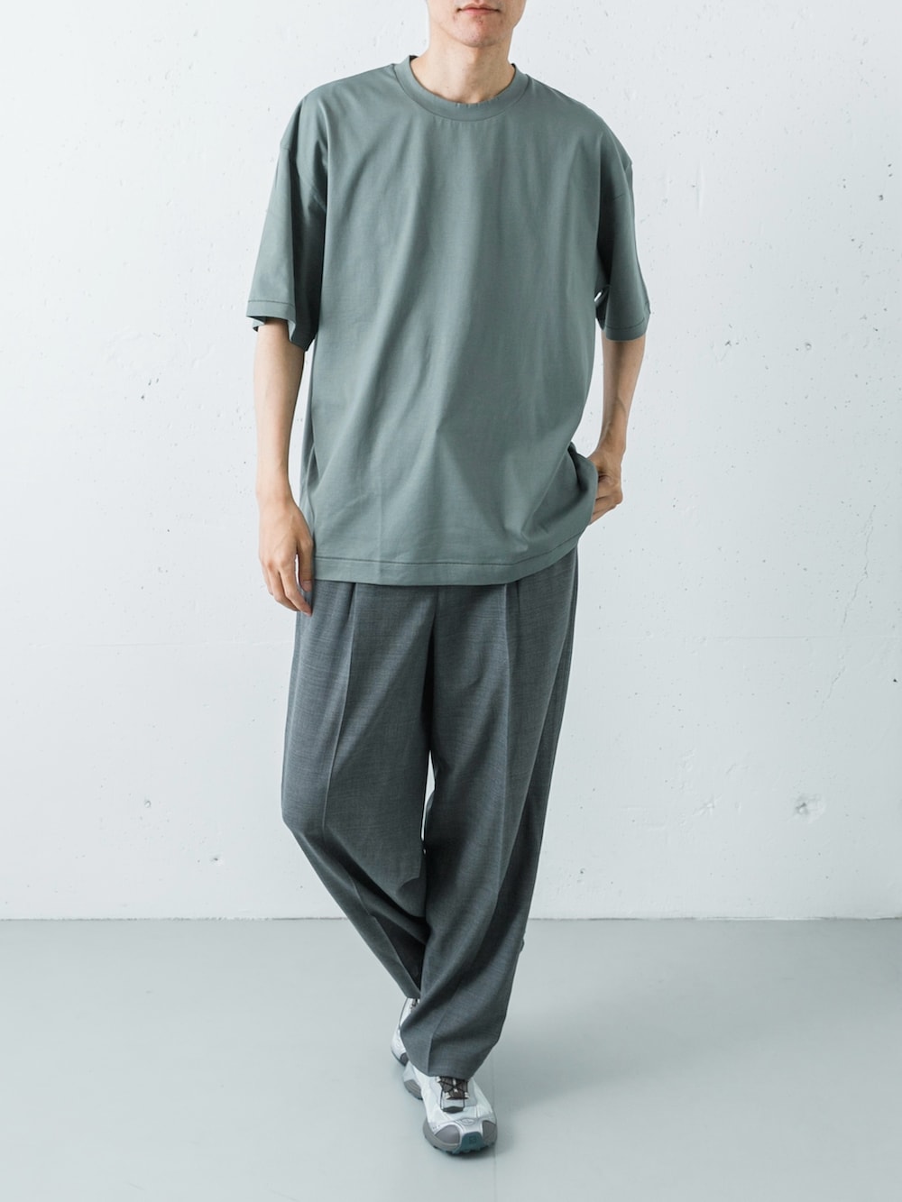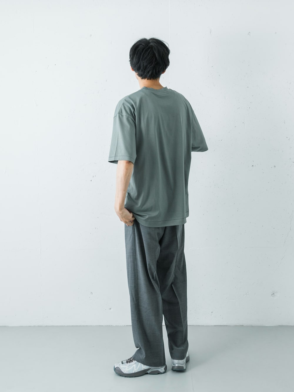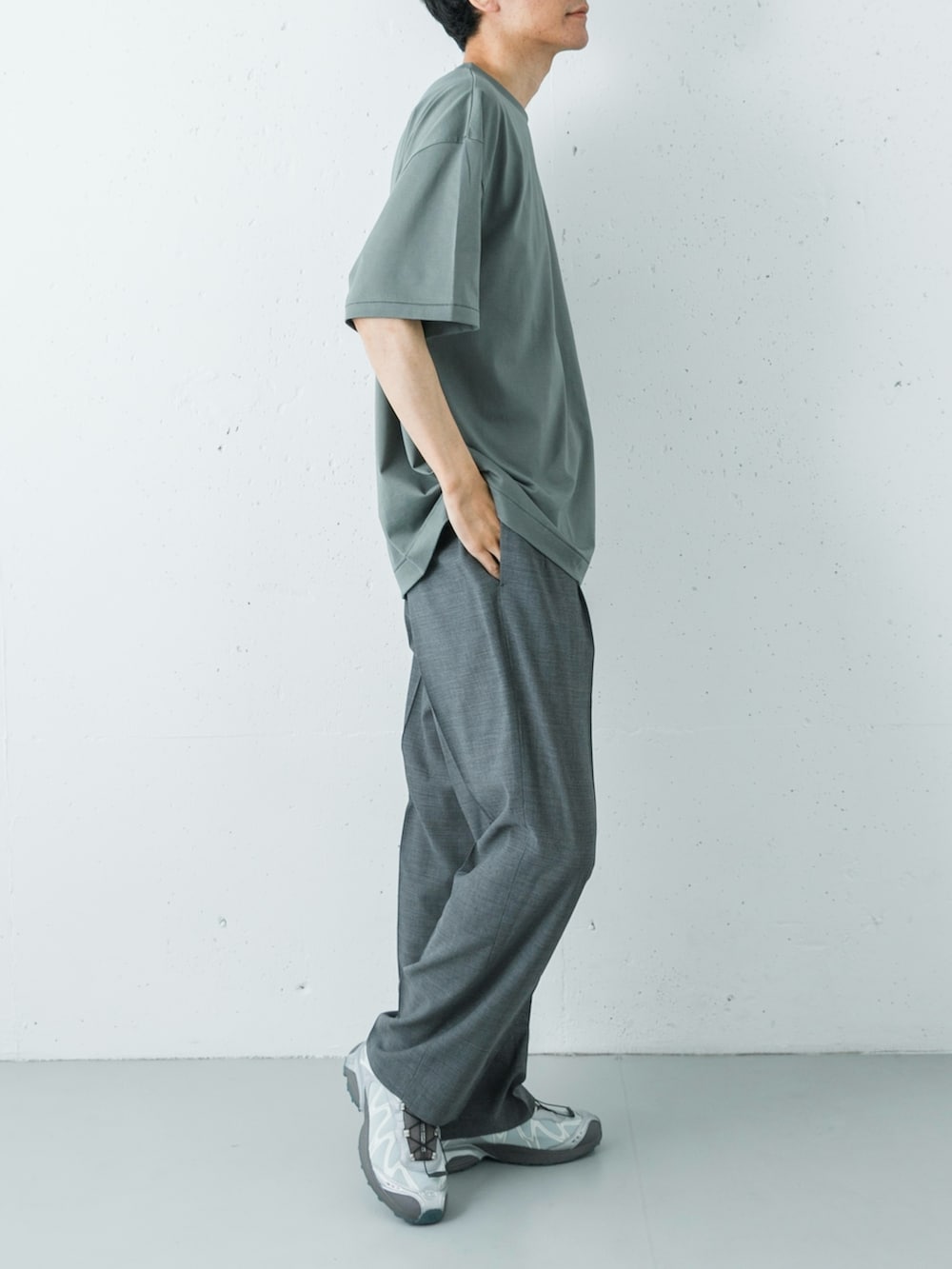 美しいツヤを持つTシャツと、風を孕むように軽いウールガーゼ。上下で異なる素材を掛け合わせていますが、どちらも極上の落ち感とドレープを備えているため、ルーズなシルエットでありながら非常にエレガントな空気感が漂います。アースカラーのカーキと無機質なグレーの洗練された配色もポイントです。