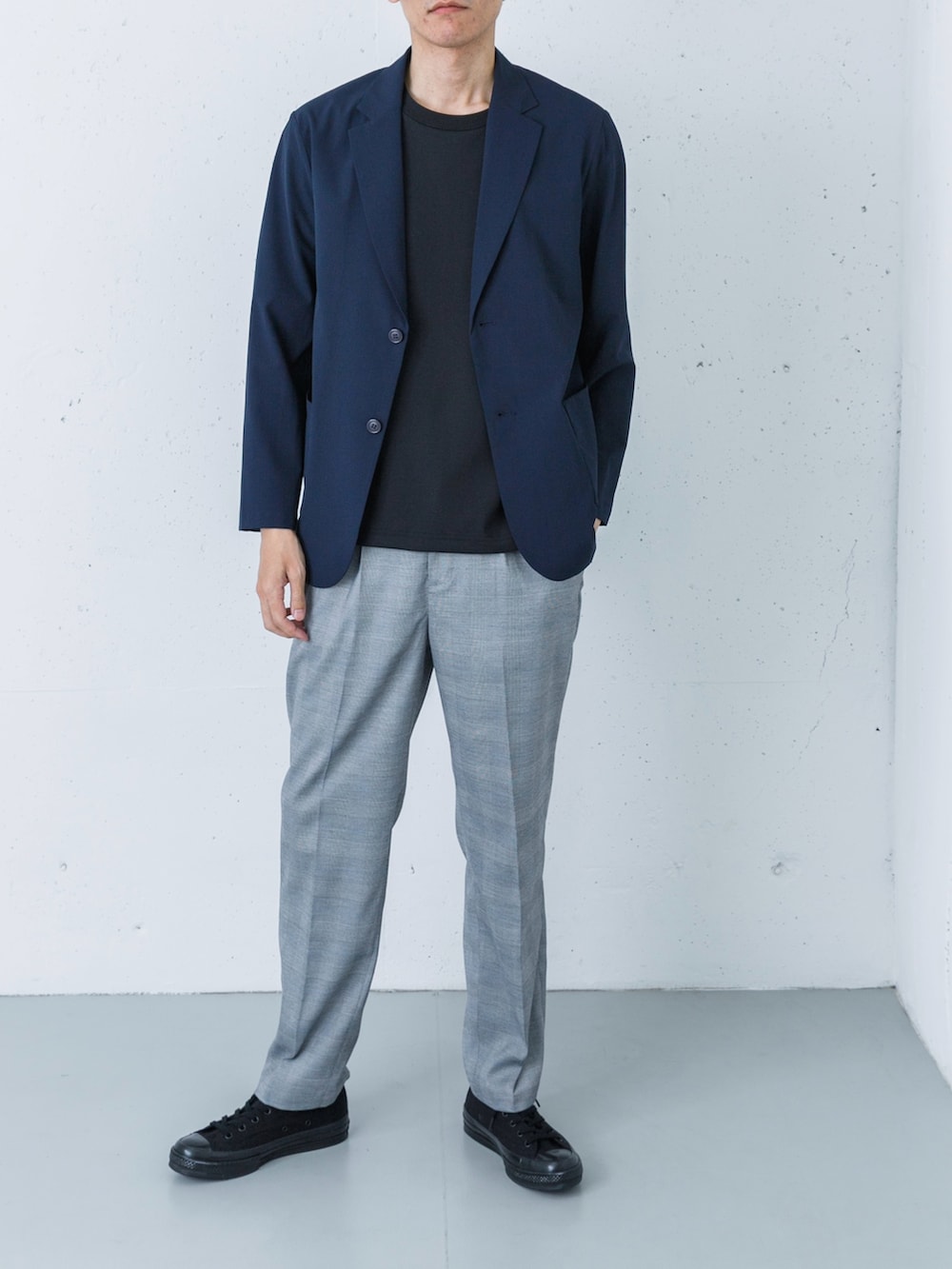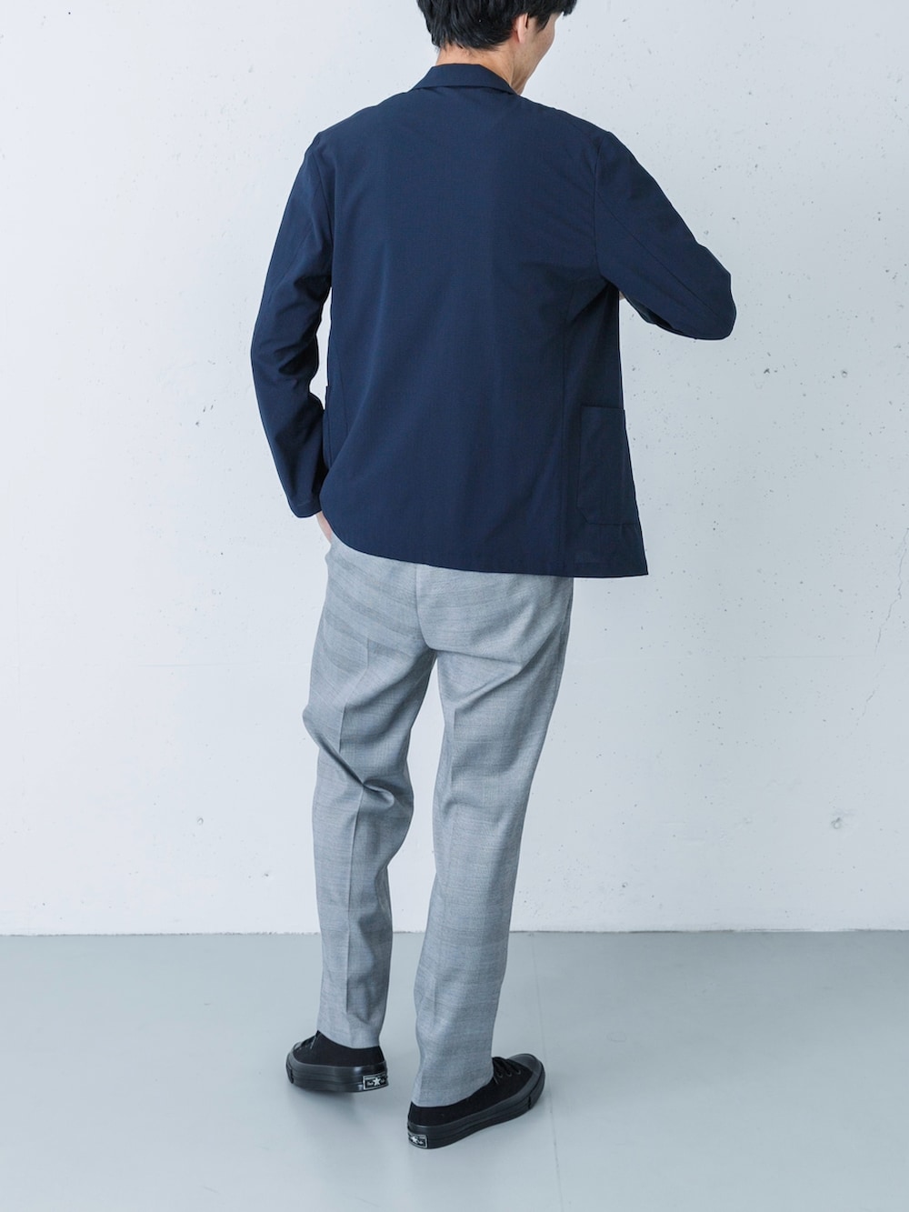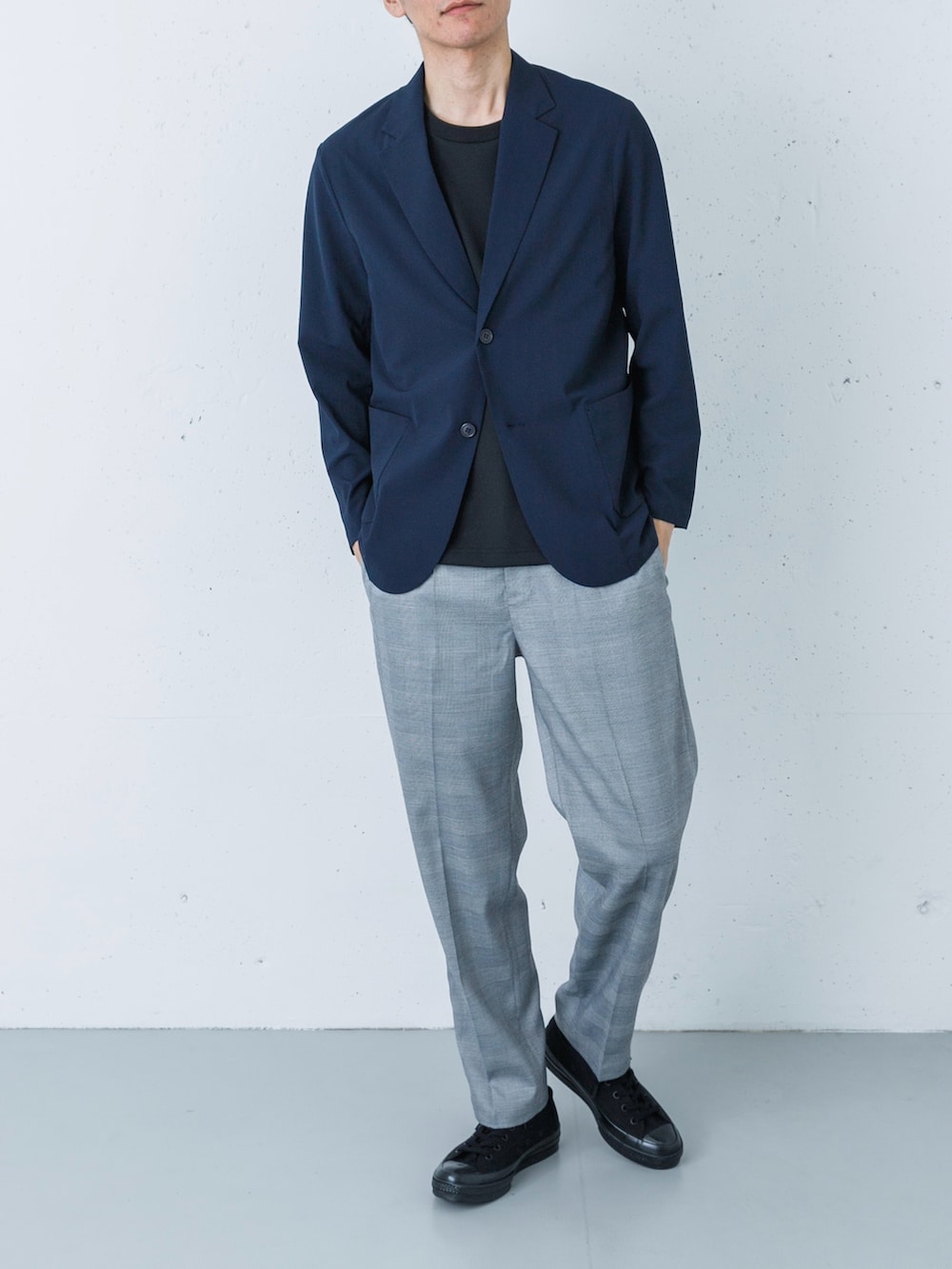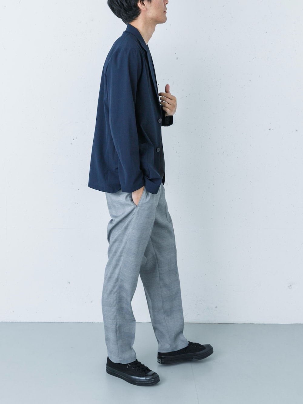 足元にはブラックのコンバースをセレクト。スラックスの裾から覗くローテクなキャンバススニーカーが、カッチリしすぎない絶妙な「街着」としての抜け感を演出します。