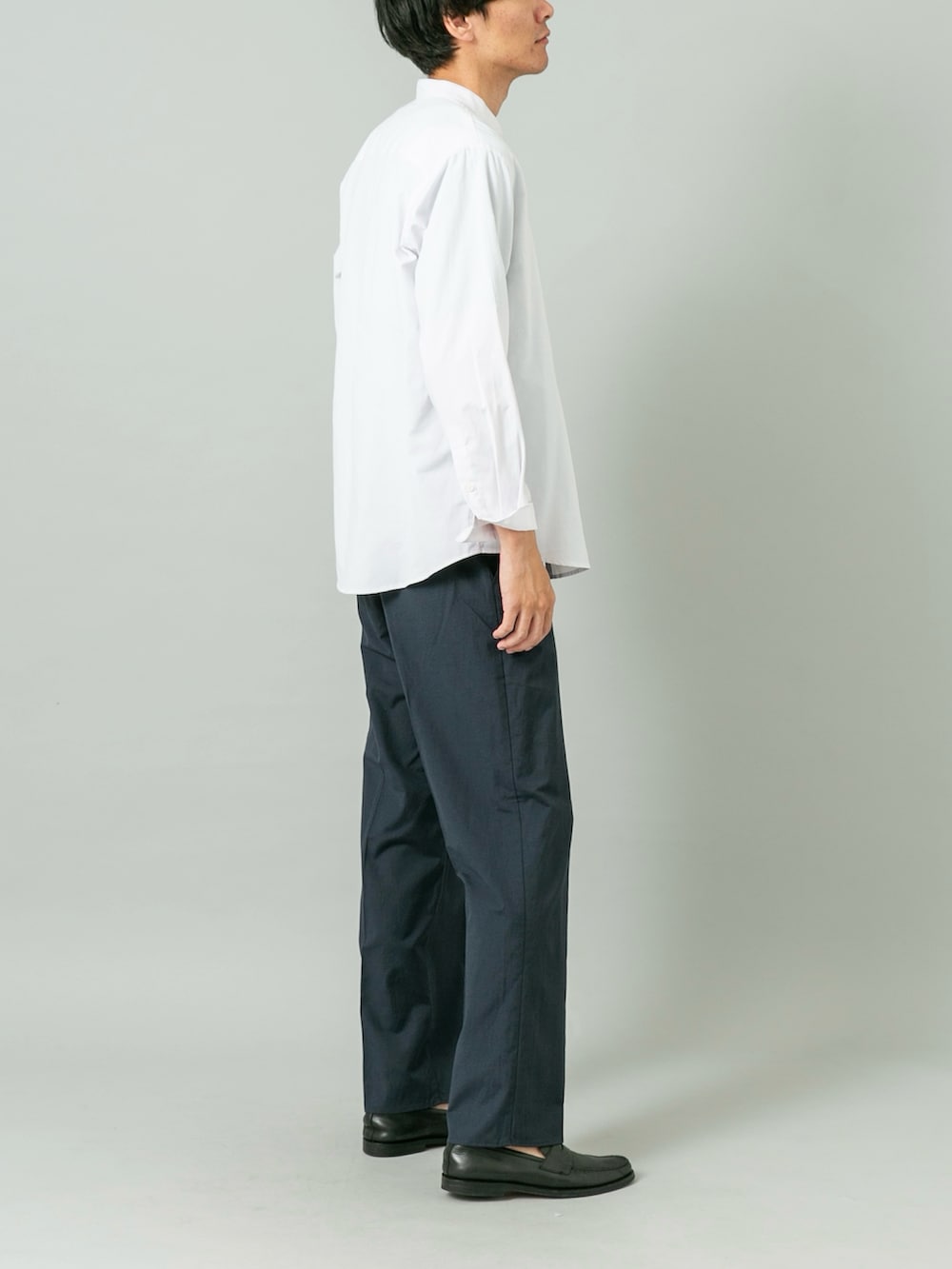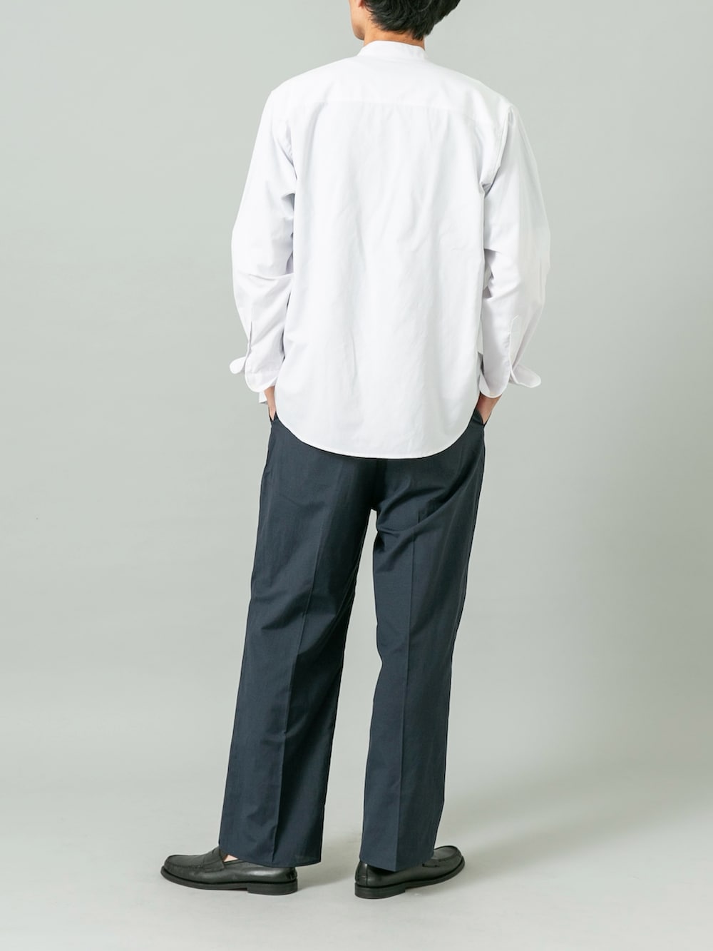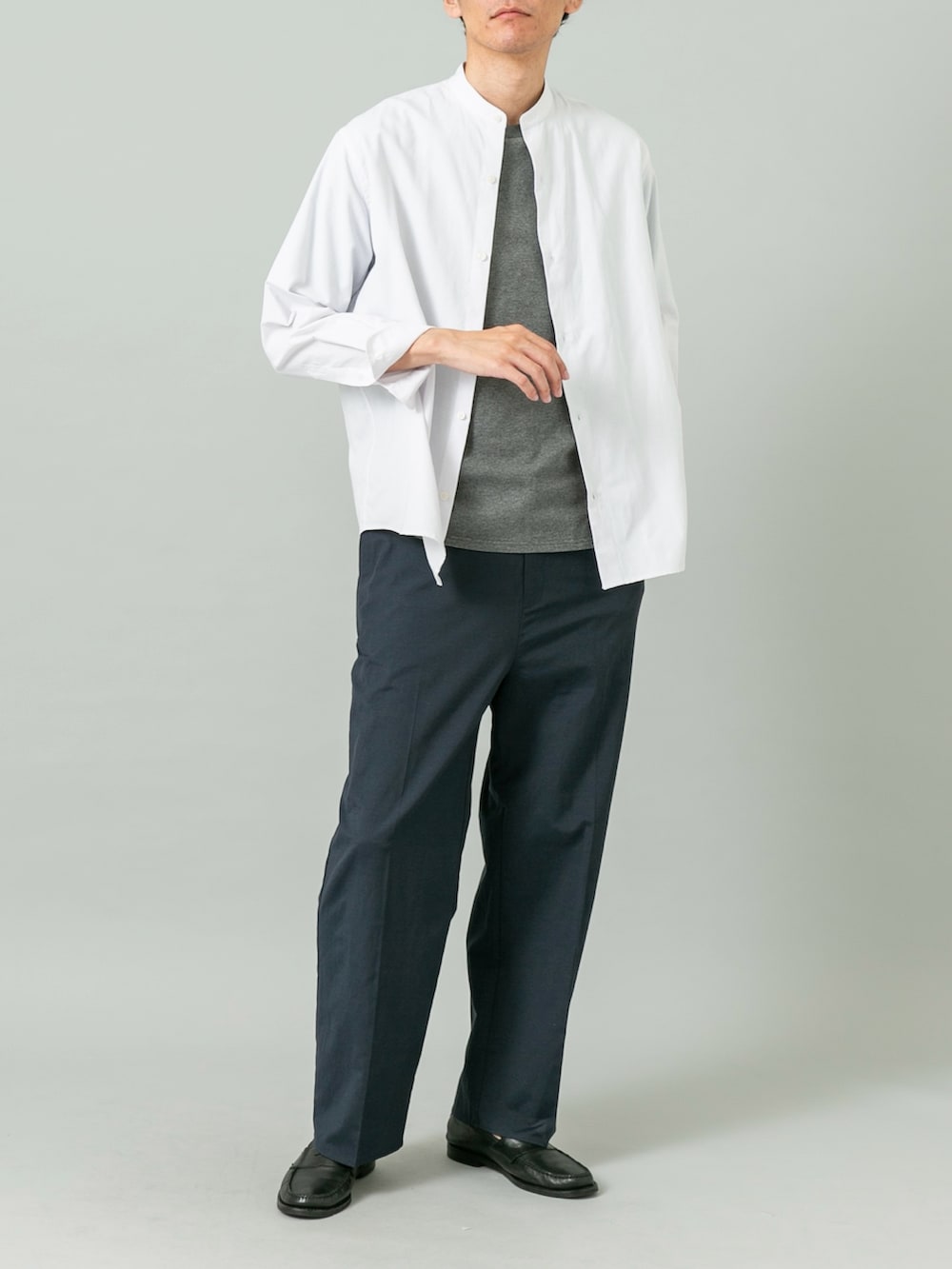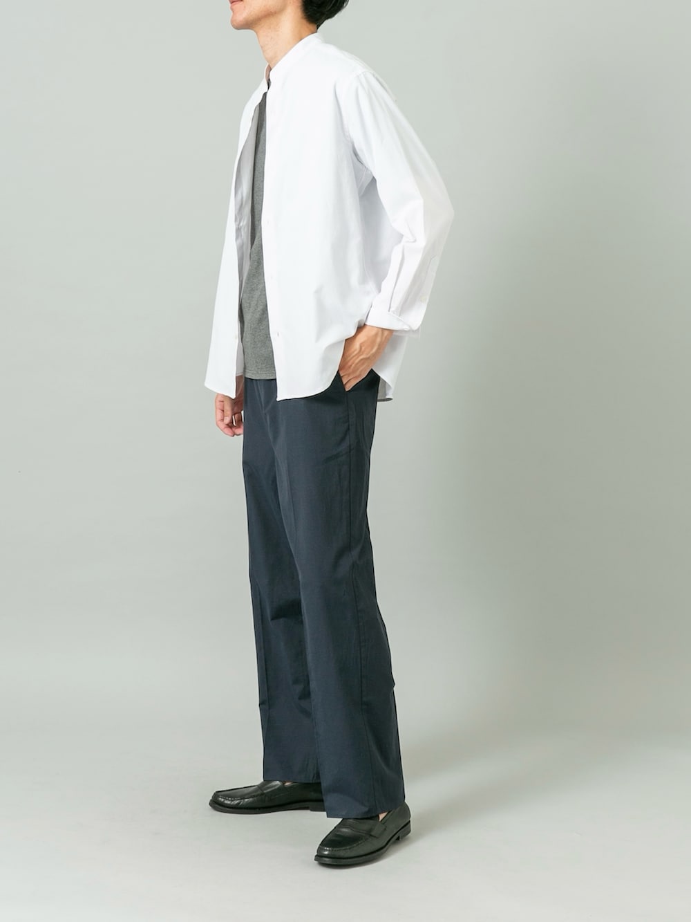「アーバンリラックス」シリーズのホワイトリネンバンドシャツに、ネイビーのストレートパンツを合わせた、王道の爽やかコーディネートです。