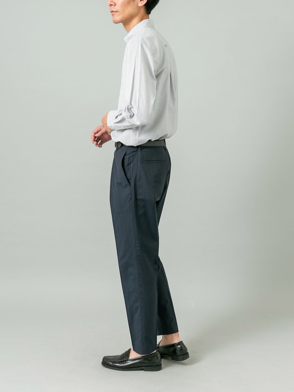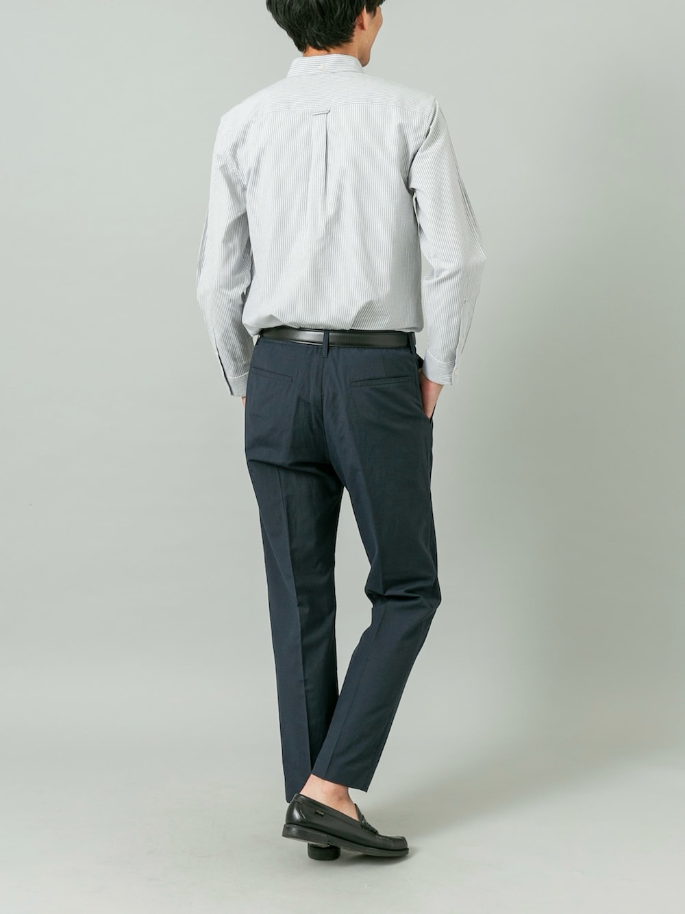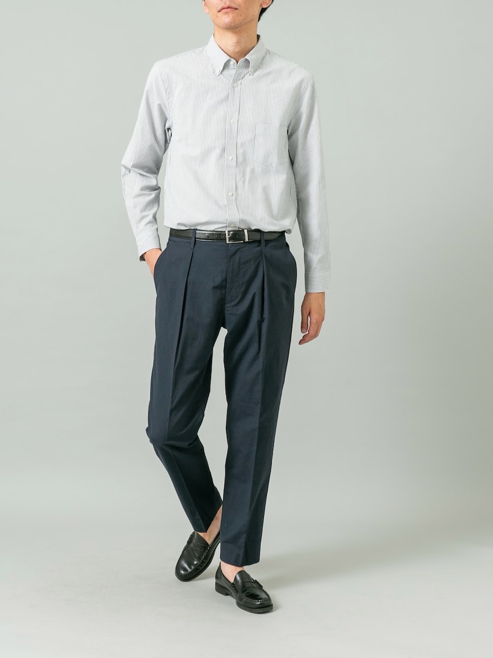 爽やかなブルーストライプ(BLUE ST)のボタンダウンシャツに、深いネイビーのテーパードパンツを合わせた、誠実さと清涼感を兼ね備えた着こなしです。