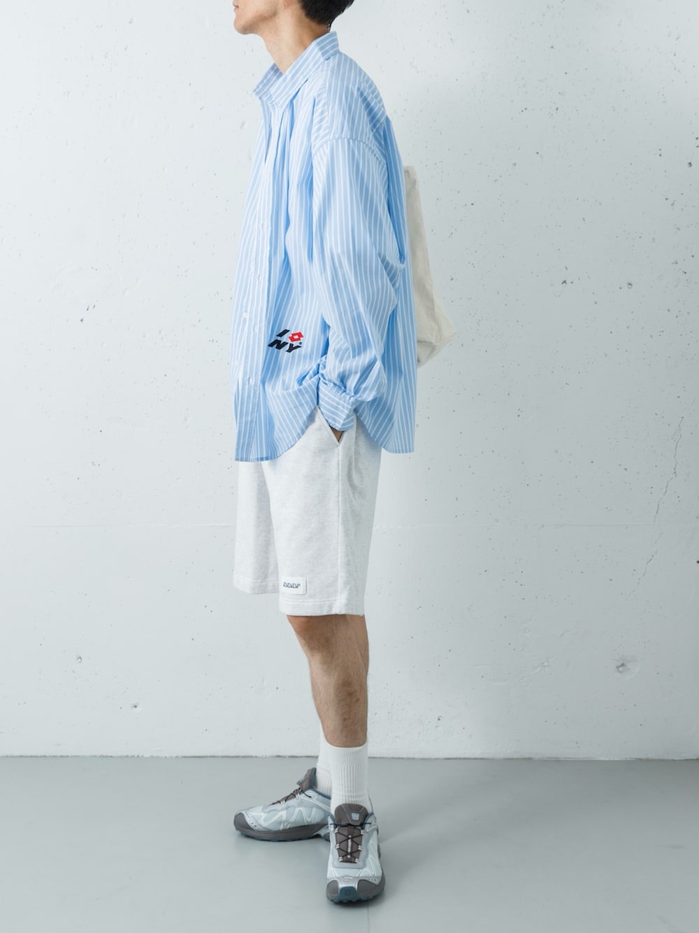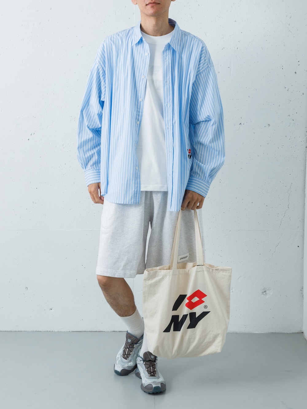 清涼感のあるブルーストライプシャツのインナーには、クリーンな白のロゴTシャツをセレクト。ボトムスに「dDdDdDd」の杢グレーのスウェットショーツを合わせることで、シャツの端正な印象に適度な「ハズシ」とスポーティーな軽快さをプラスしています。
