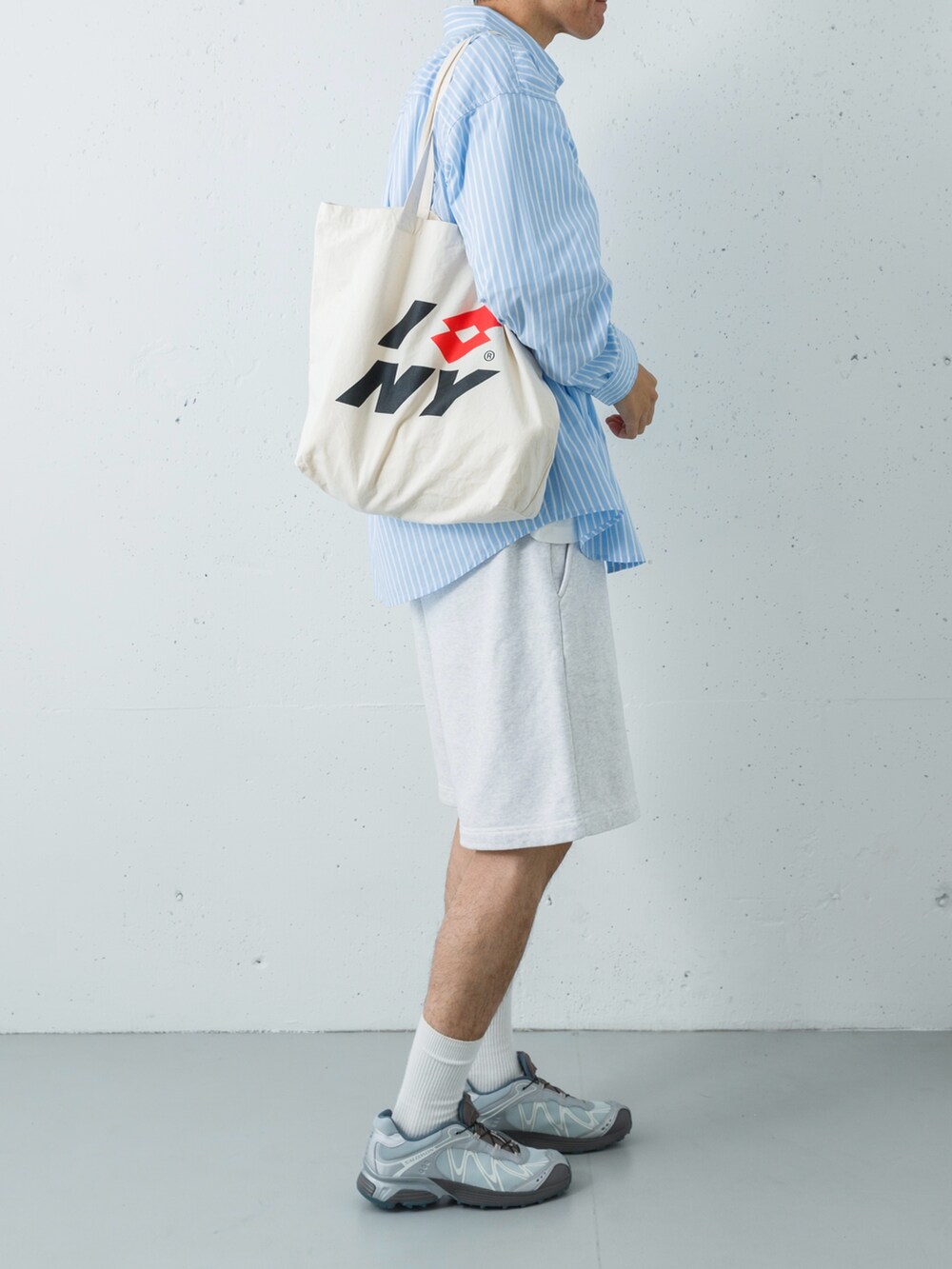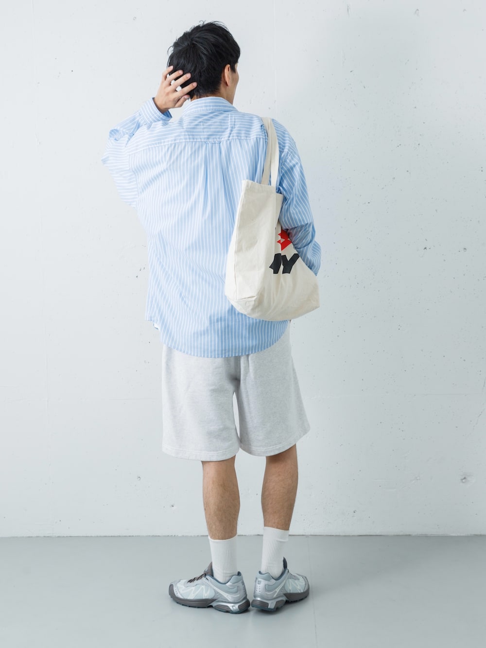 足元は、ショーツのグレーと色をリンクさせたSALOMON(XT-WHISPER)でモダンに集約。仕上げにナチュラルカラーのトートバッグを添えれば、伝統的なロゴ使いと現代的なテック感が同居する、洗練されたアスレチックスタイルが完成します。
