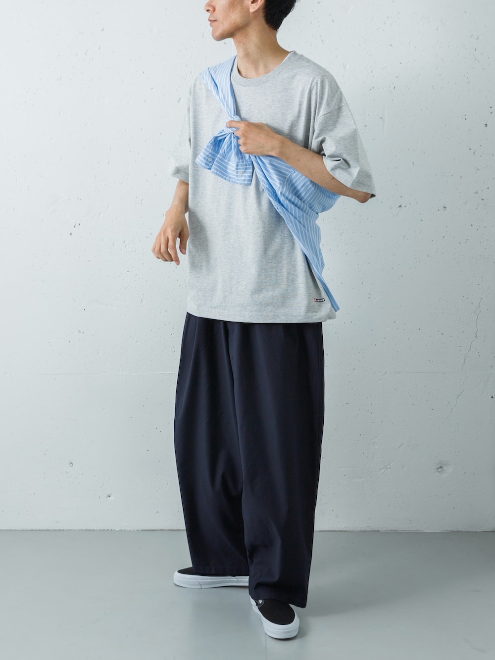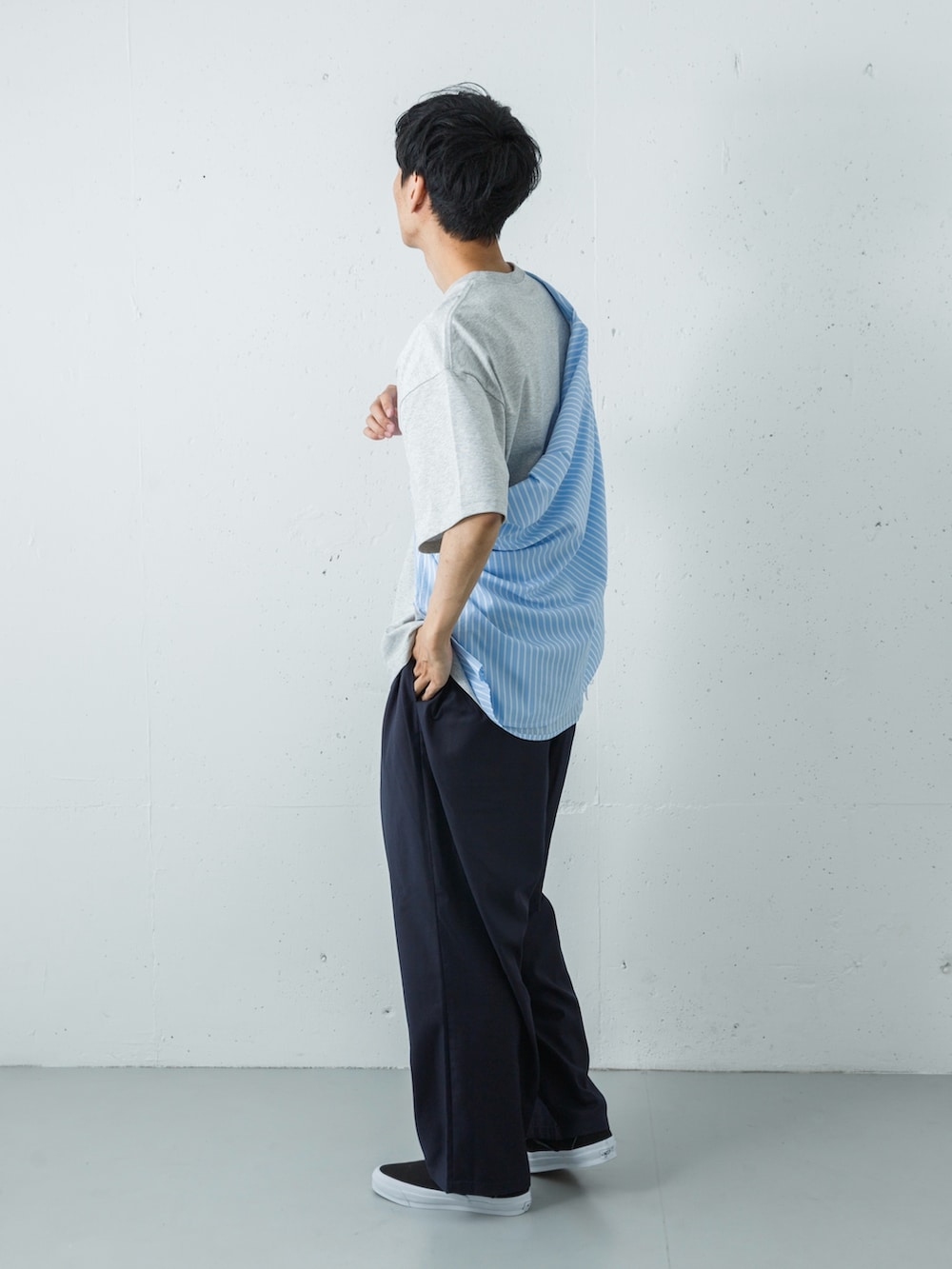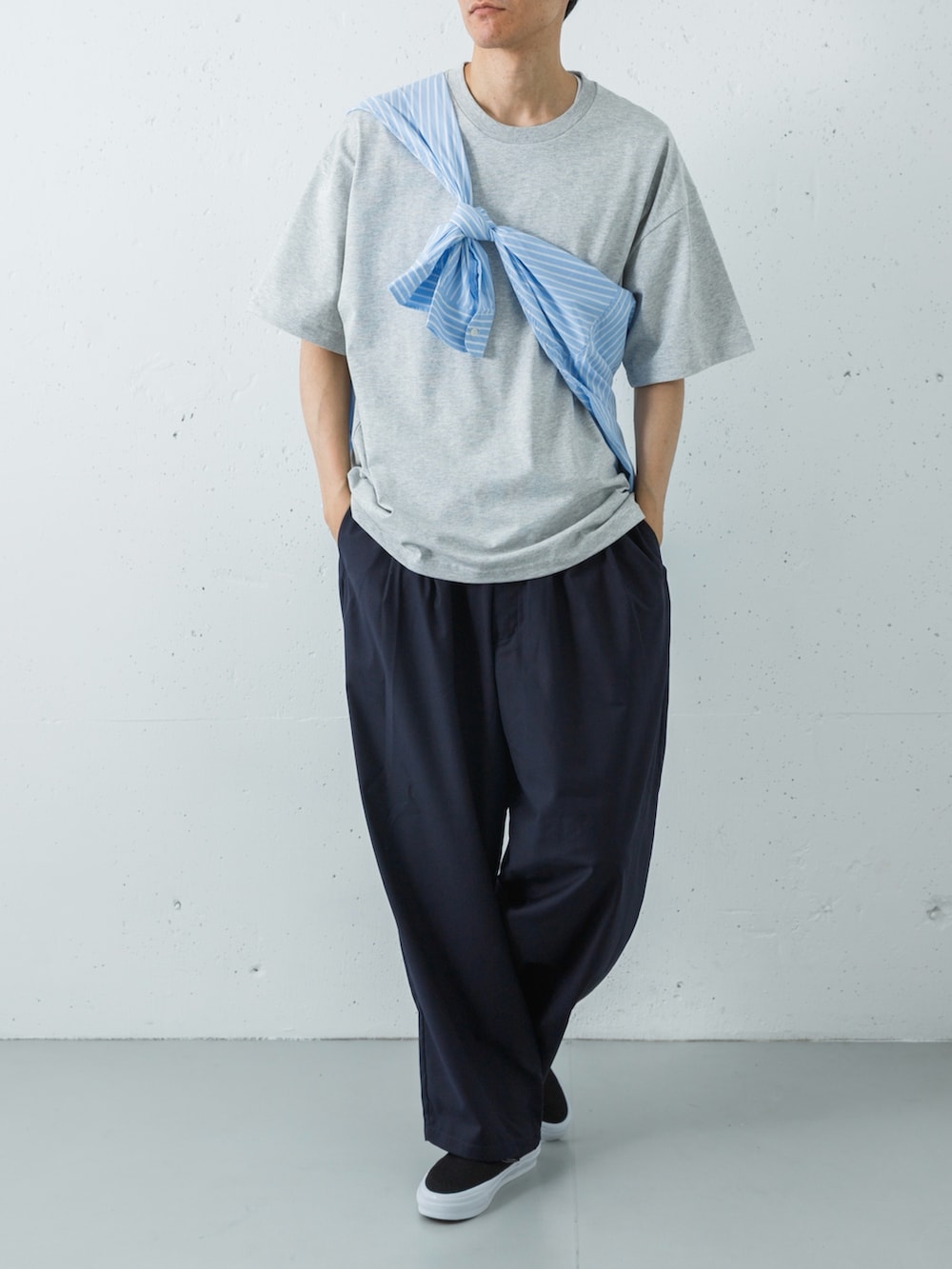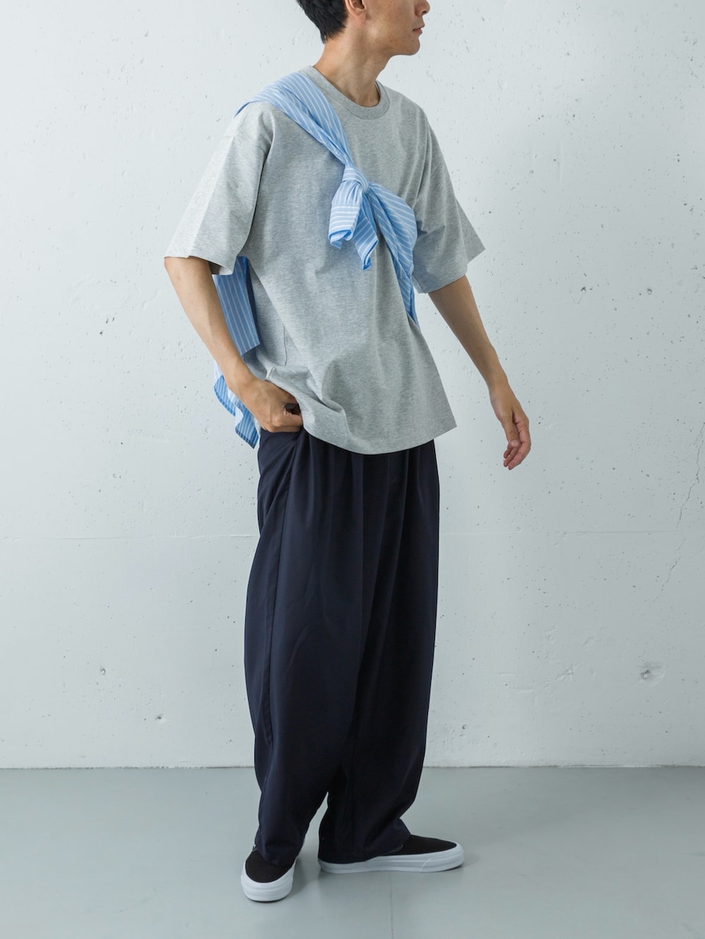 足元には、VANSのプレミアムラインからブラックのスリッポンをセレクト。テック素材のパンツが持つ無機質な表情を、クラシックな質感が程よく和らげ、ストイックながらも親しみやすい大人の街着へと昇華させています。