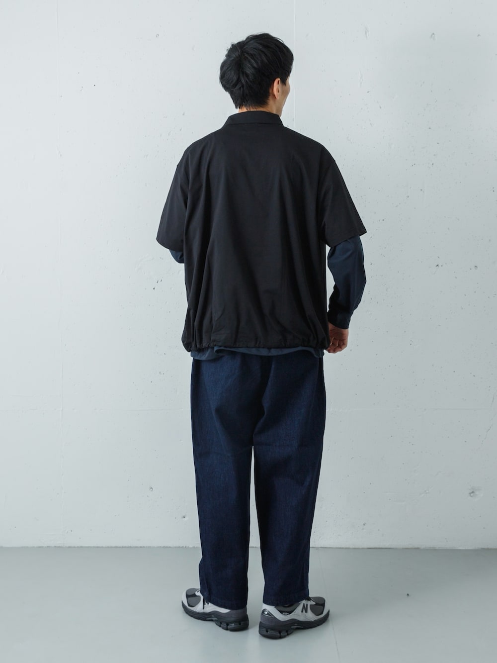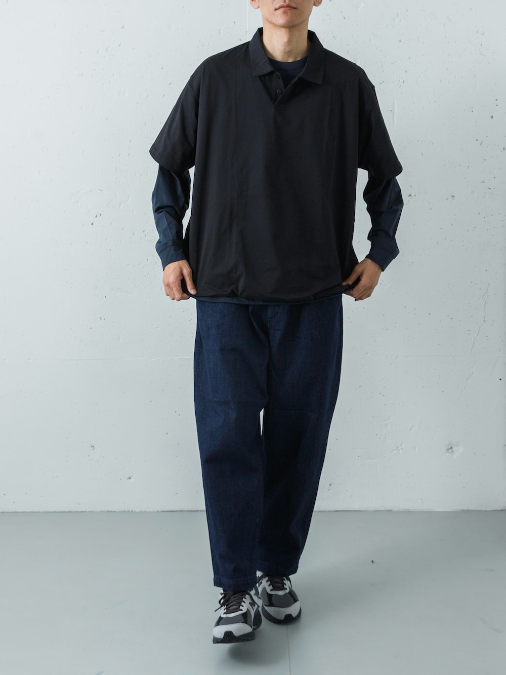 「BREEZY TECH」素材のポロシャツからダークネイビーのロンTを覗かせた、奥行きのある上半身がポイントです。