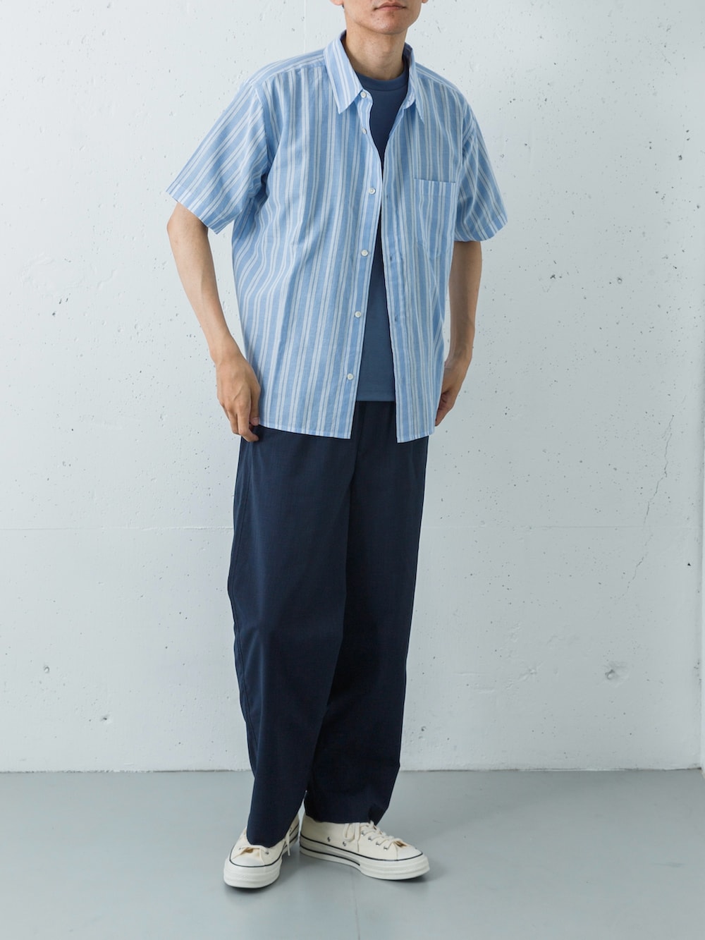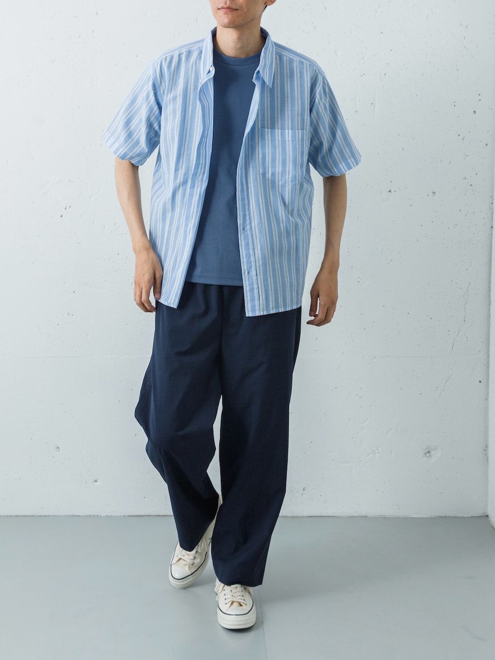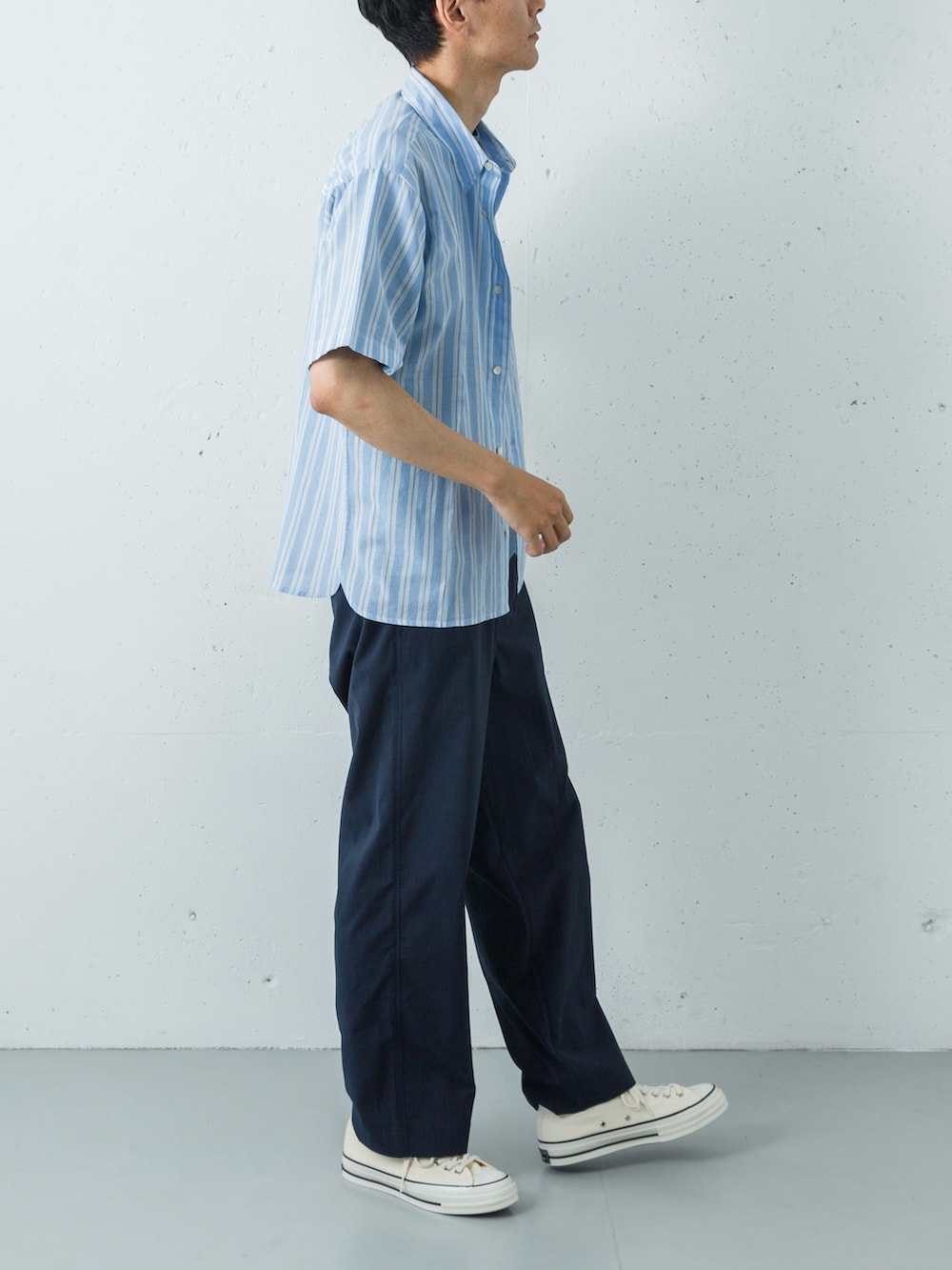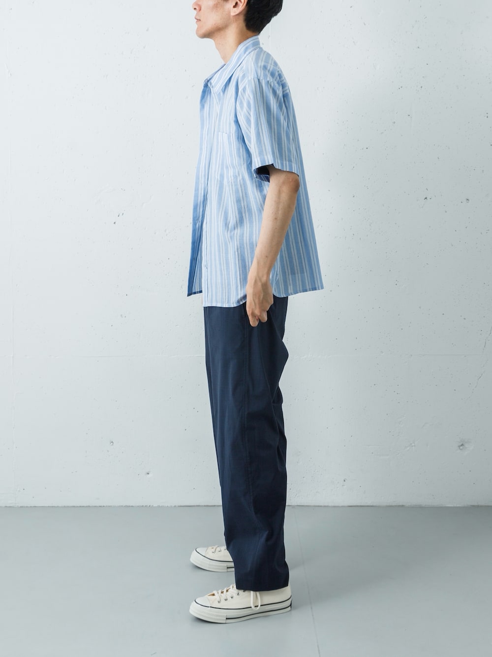 ボトムスには、リネンのような清涼感がありながら、シワになりにくくケアが簡単なポリエステルパンツをセレクト。素材感の異なるブルーを重ねることで、単調さを回避し、奥行きのある洗練されたサマースタイルを完成させています。
