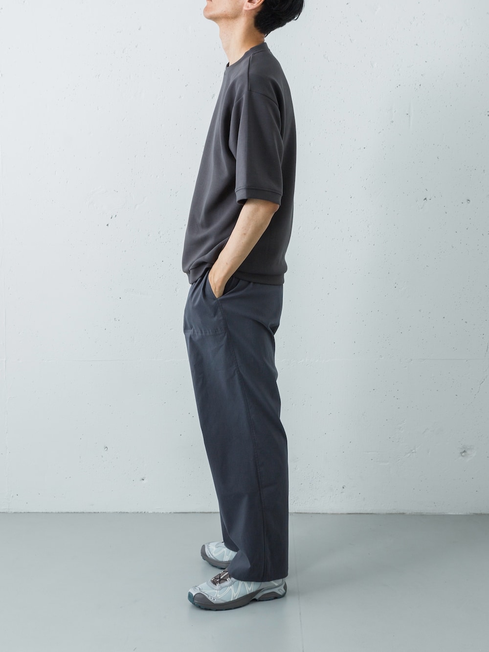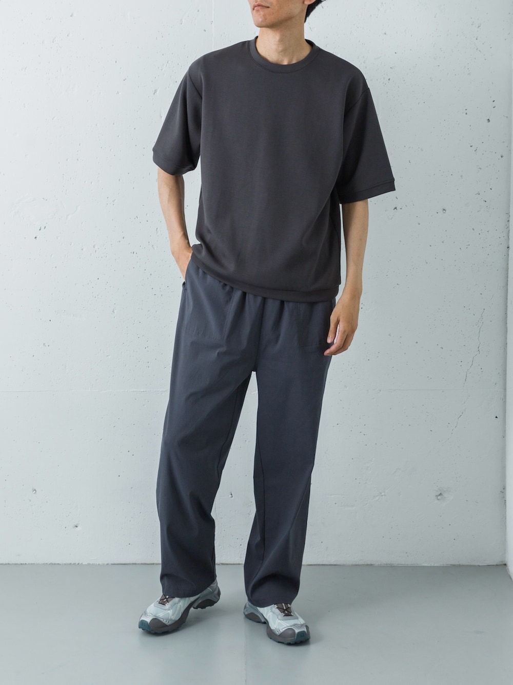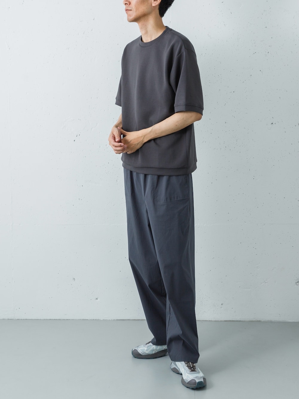 上下をチャコールで統一することで、カジュアルなTシャツスタイルにモードな品格をプラス。ダンボールニット特有のハリ感のあるシルエットと、ベイカーパンツの機能的なディテールが、単色ながらも立体的な表情を生み出しています。