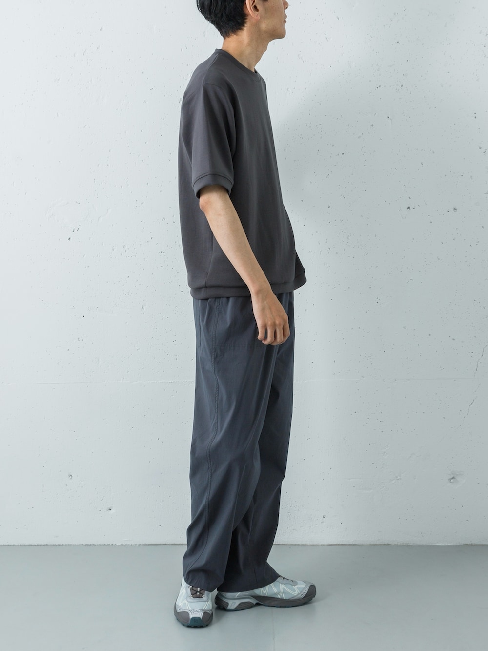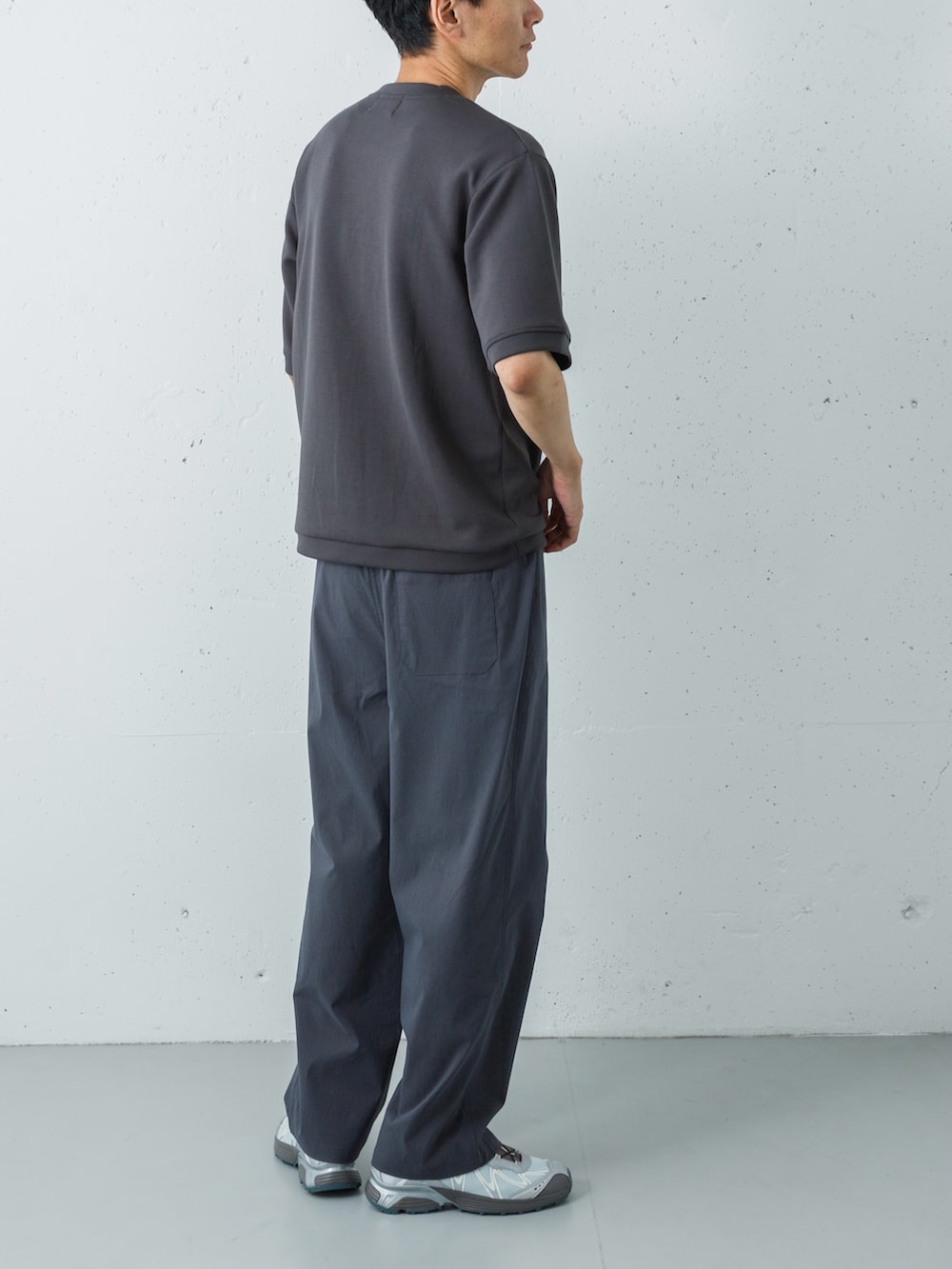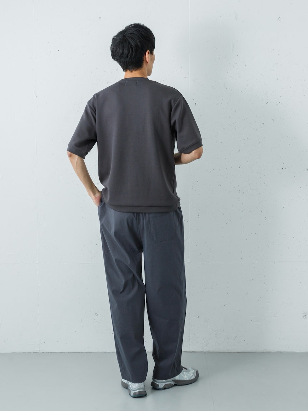 上下をチャコールで統一することで、カジュアルなTシャツスタイルにモードな品格をプラス。ダンボールニット特有のハリ感のあるシルエットと、ベイカーパンツの機能的なディテールが、単色ながらも立体的な表情を生み出しています。