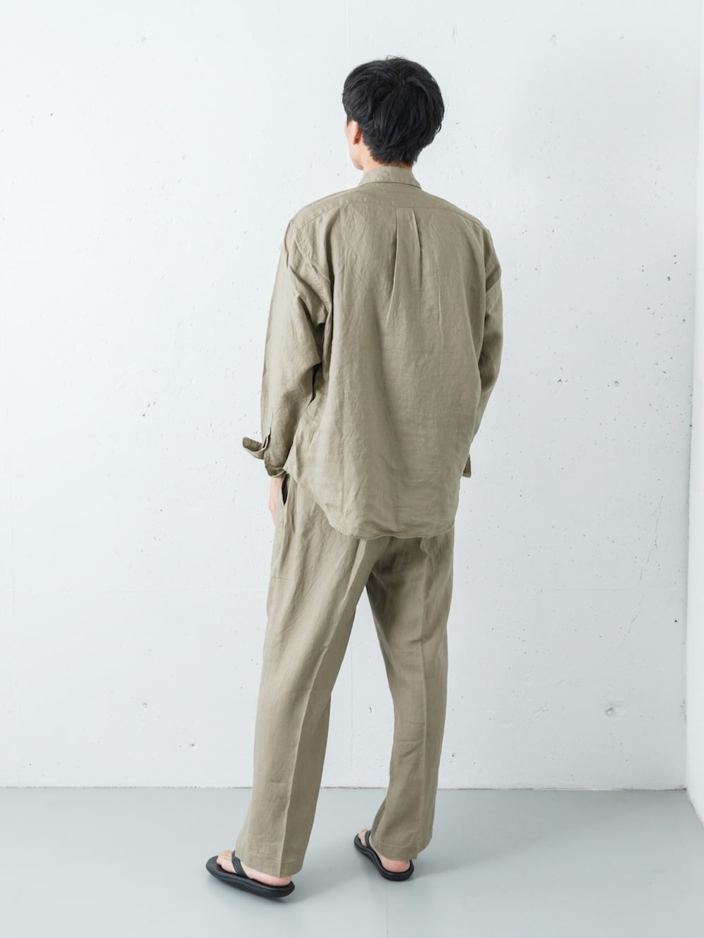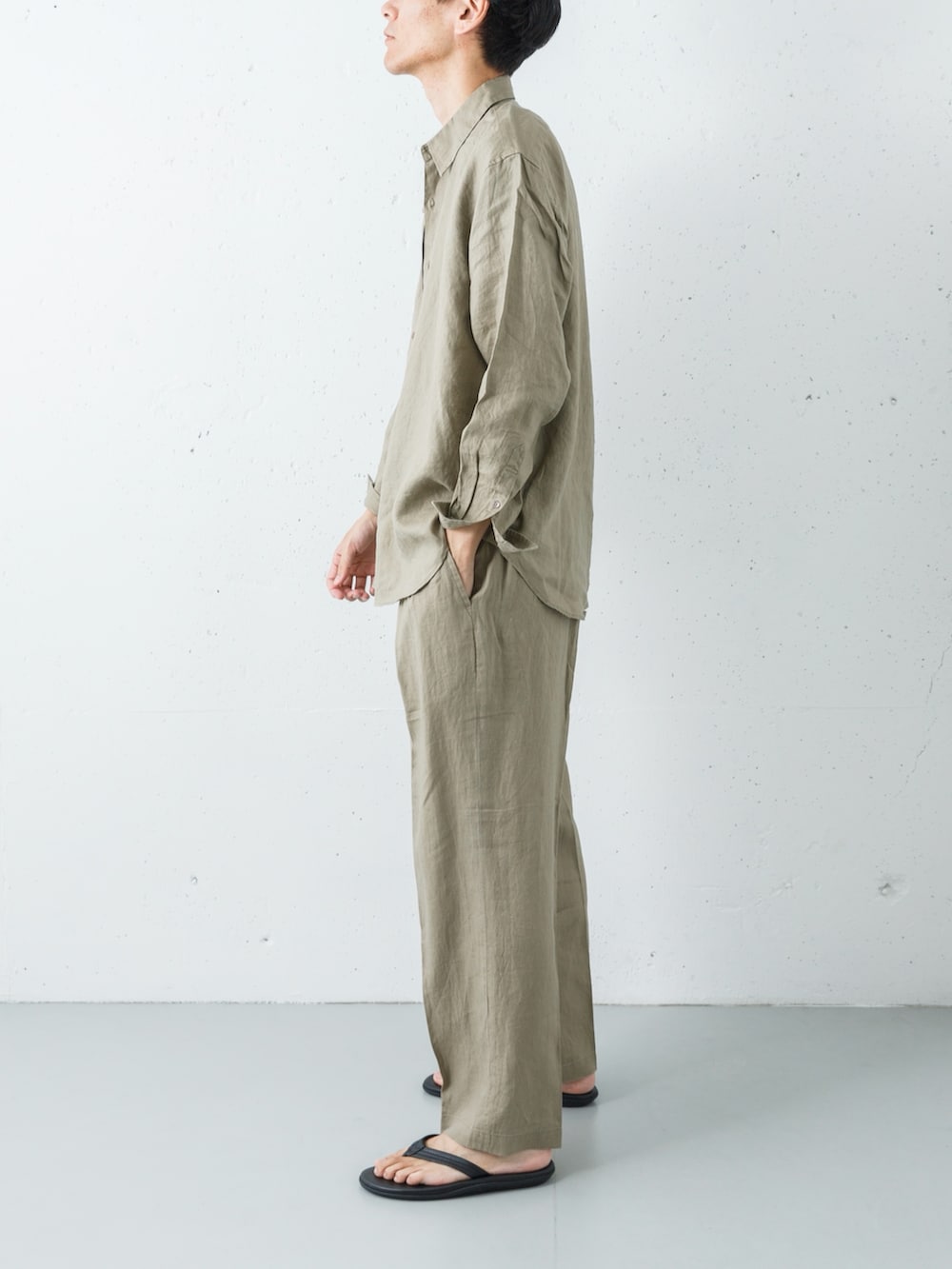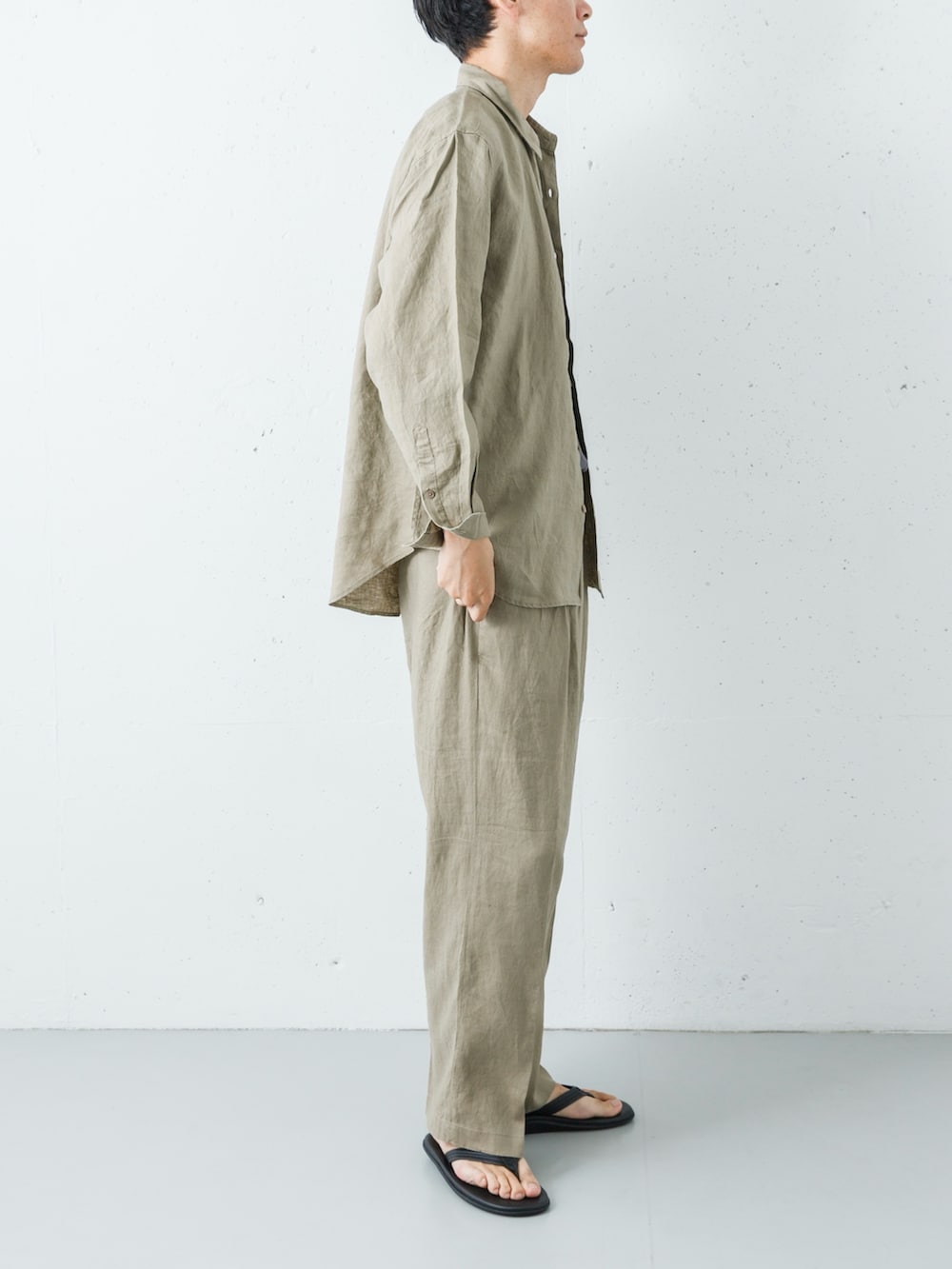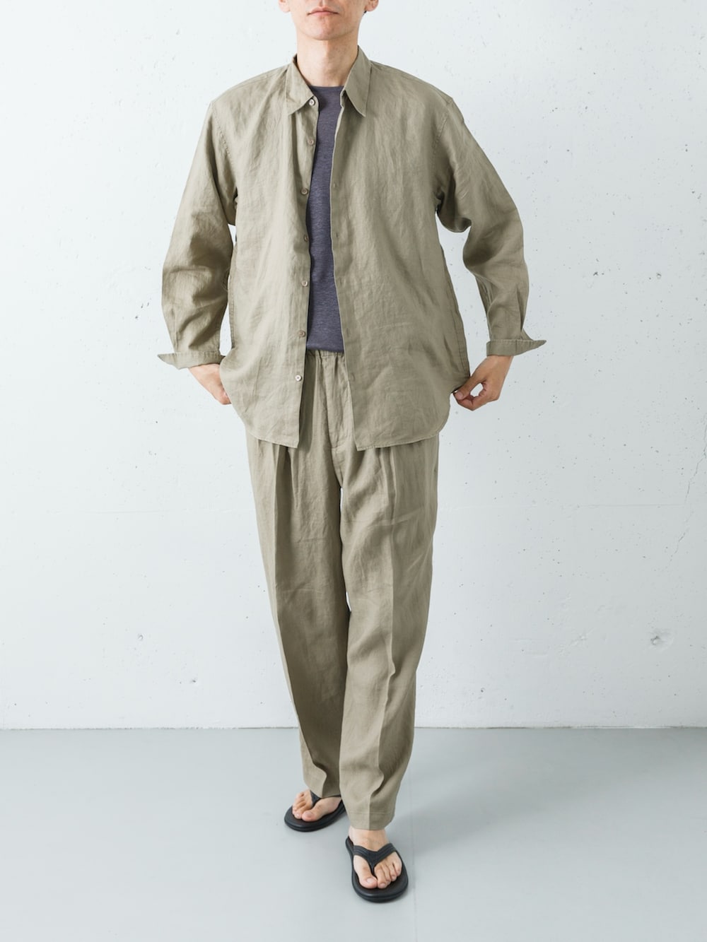 インナーには、首元のラインがアクセントになるチャコールのトリムTシャツをセレクト。ベージュの柔らかな印象を、中間色であるチャコールが優しく引き締め、コントラストを抑えつつも都会的なニュアンスを加えています。リネン素材が持つ独特のシワ感とドレープが、リラックスしたワイドシルエットに豊かな表情をプラス。