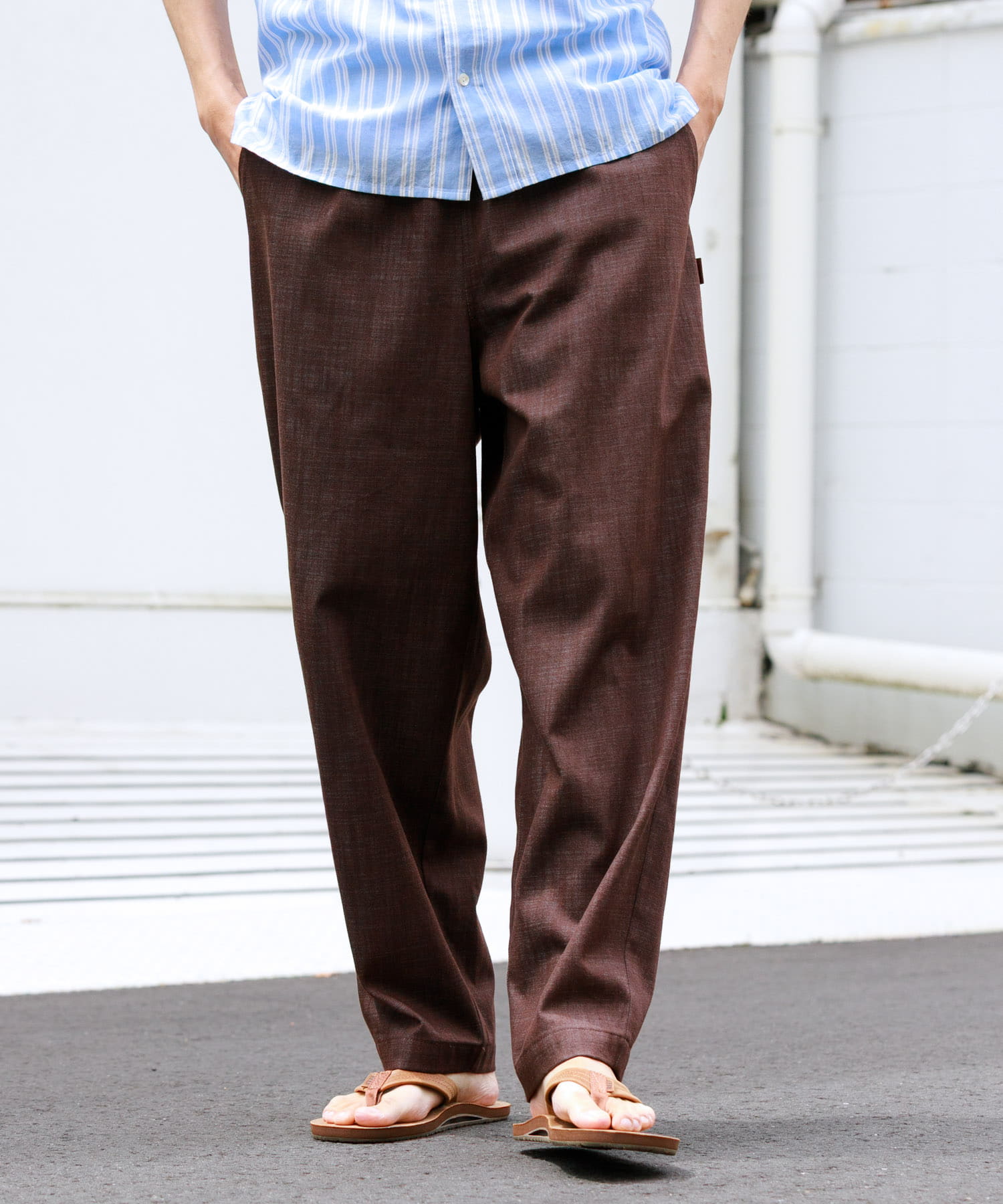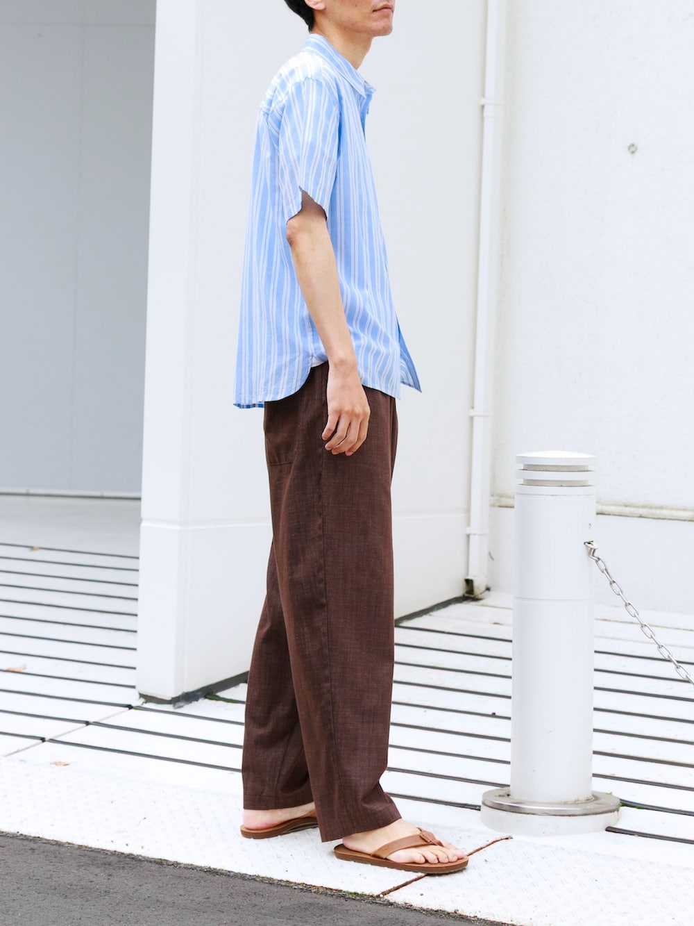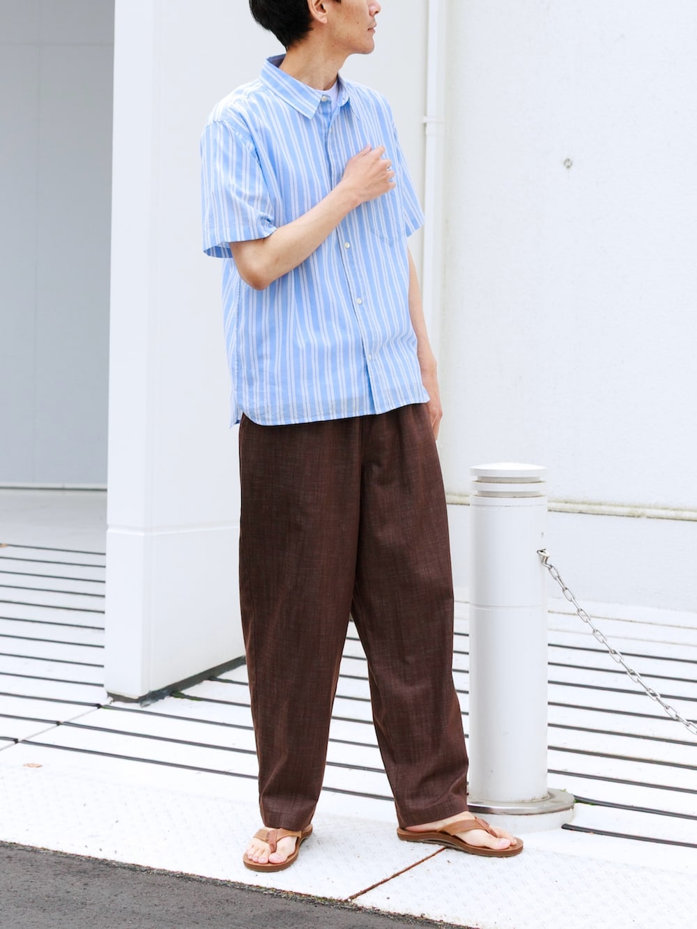 ボトムスには、デニムのようなタフな表情を持ちつつ、驚くほど動きやすいブラウンのワイドパンツをセレクト。深いブラウンがブルーの爽やかさを引き立て、全体を落ち着いた大人の印象に格上げします。ワイドシルエットが風を通し、見た目の重厚感に反して涼しく過ごせるのも魅力です。