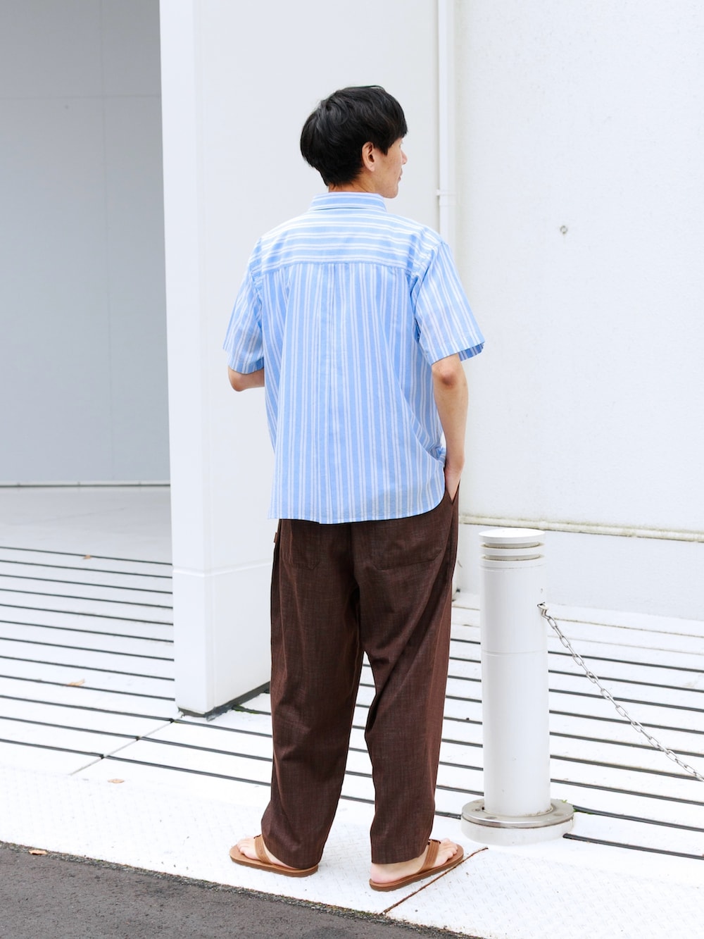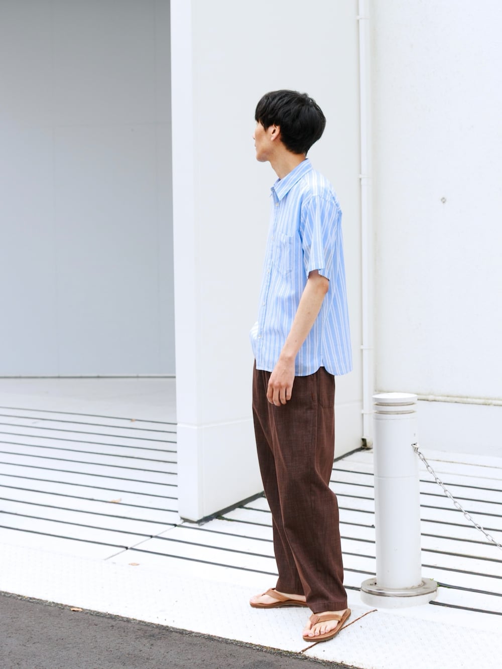 トップスは、清涼感あふれるブルーのインドコットンシャツ。手織りのような温かみのある質感がストライプ柄を優しく見せ、夏の空気に馴染む軽やかさを演出します。あえてボタンを少し開けたり、袖を捲ることで、リラクシーな表情がさらに引き立ちます。