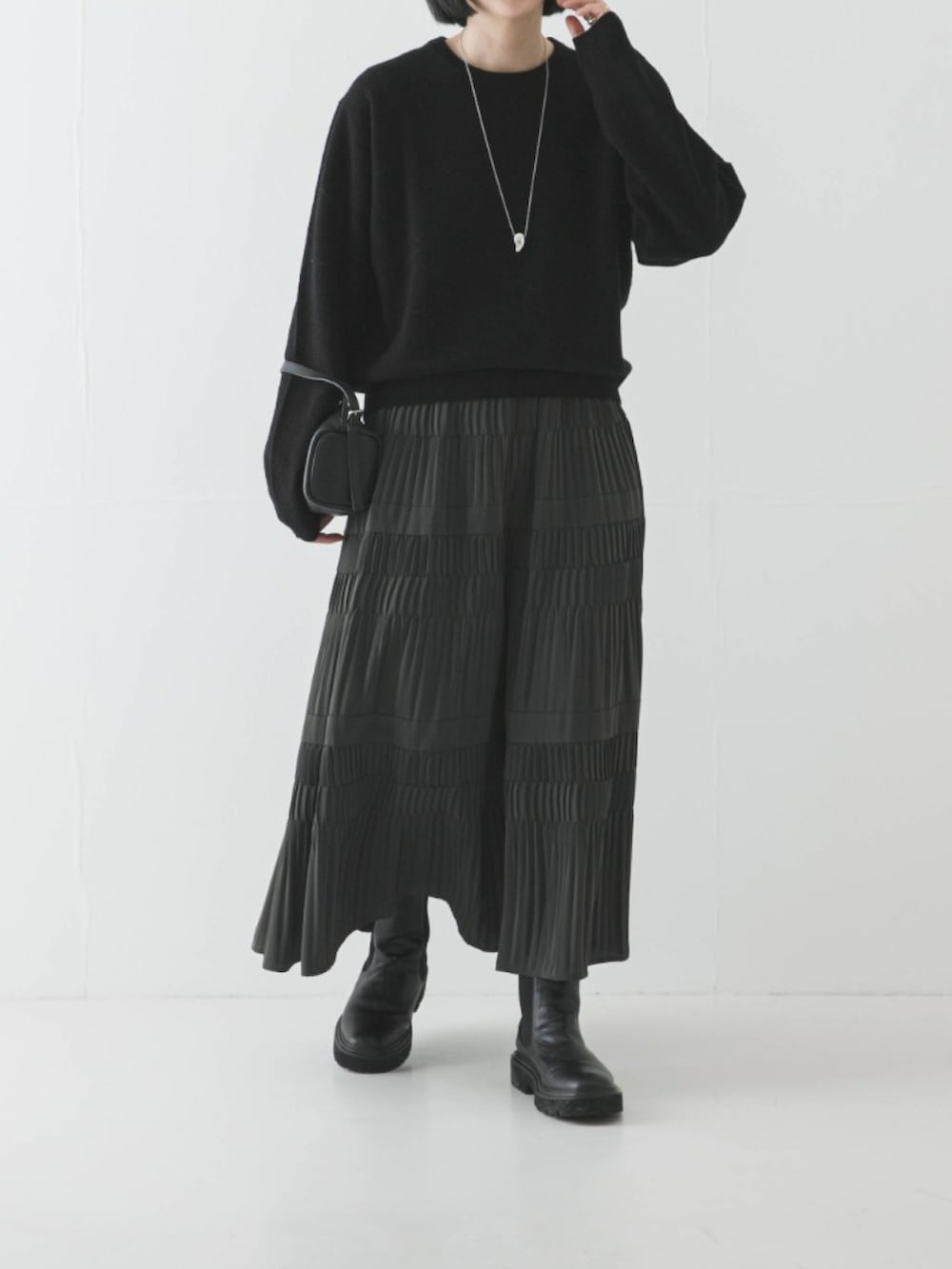 素材は軽く、それでいて落ち感があり、動くたびにふわりと表情豊かなスカートです。