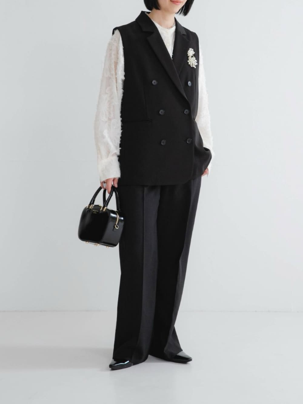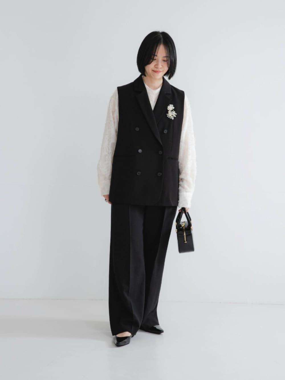 ブラウスと合わせたスタイルは、オケージョンやお仕事など幅広いシーンにおすすめ。同素材のテーパードパンツとセットアップで着用すれば、より洗練された着こなしが完成します。