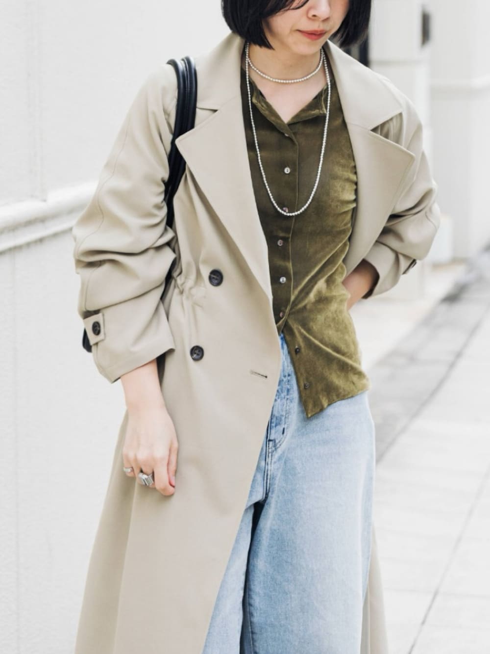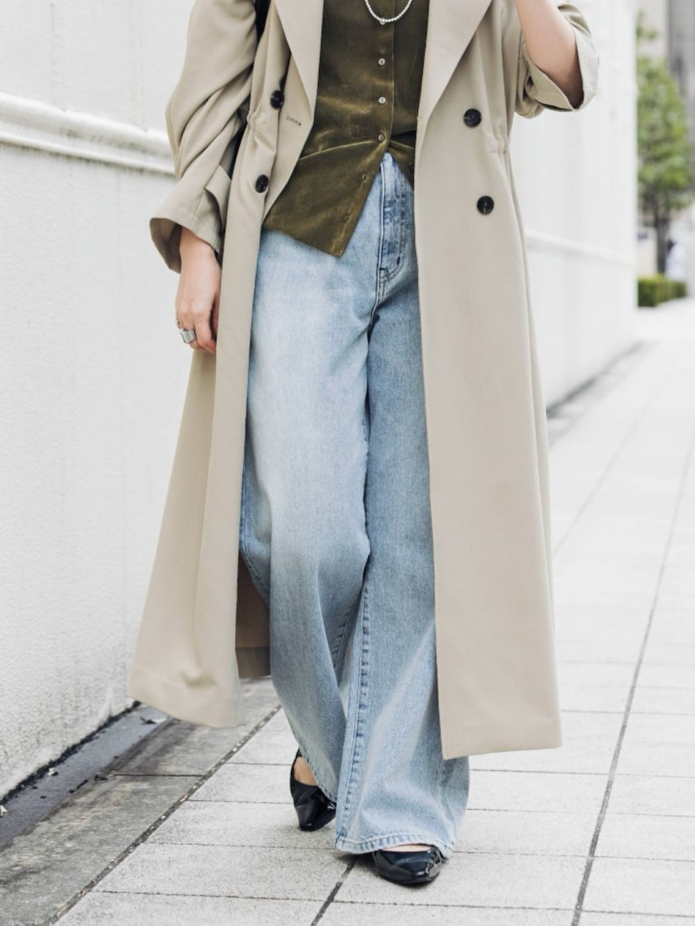 ワイドデニムやスラックスと合わせたメリハリのあるスタイリングがおすすめ。裾のボタンをあけて抜け感を出したり、軽い羽織りとしてプラスしたりと、シアー素材ならではの質感を楽しめる万能アイテムです。