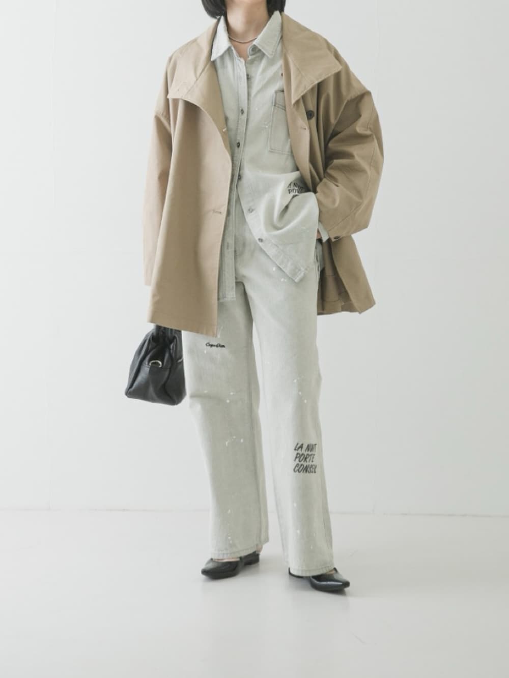 きれいめなスラックスからデニムまでコーディネートも選ばず、万能なコートです。