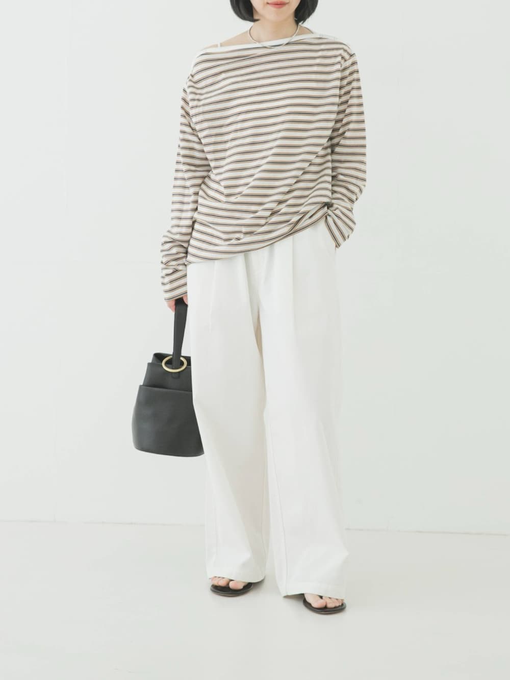 カジュアルなボーダーを大人っぽく、かつトレンド感たっぷりにアップデートした、着回し力の高いアイテムです。片側の釦を外して肩を落とし、カーブスラックスやダブルクロスキュプラパンツにインした、力の抜けた着こなしがおすすめ。
