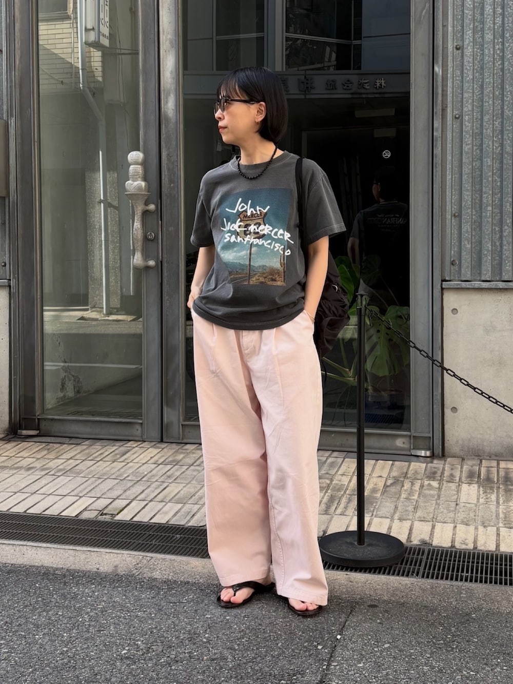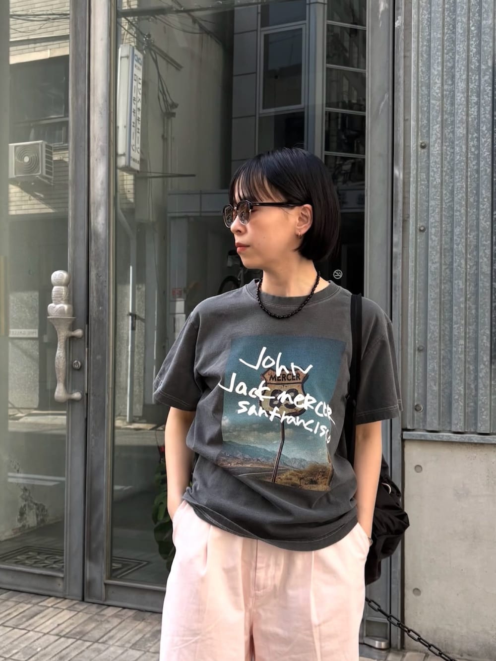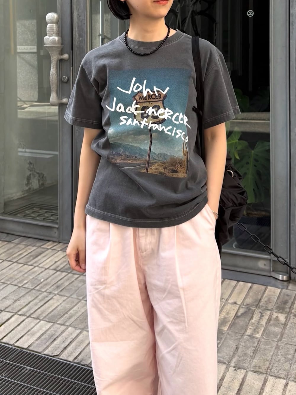 どこか懐かしさを感じさせるロードサイドのフォトプリントに、手書き風のグラフィックを大胆に重ねた遊び心溢れる一着です。