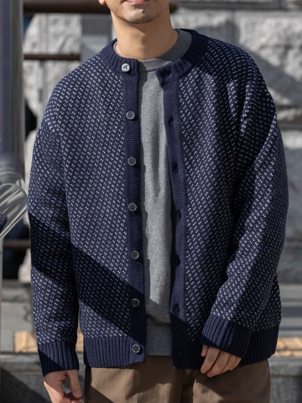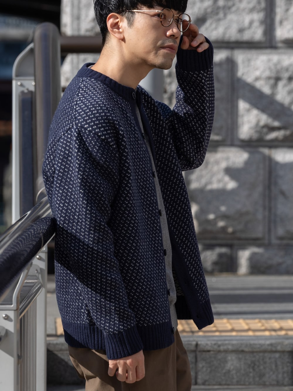 中に着たニットのカラーはカーディガンの柄の色に近いグレーでまとまりのある感じにしてブラウンのパンツで季節感を出しました。
